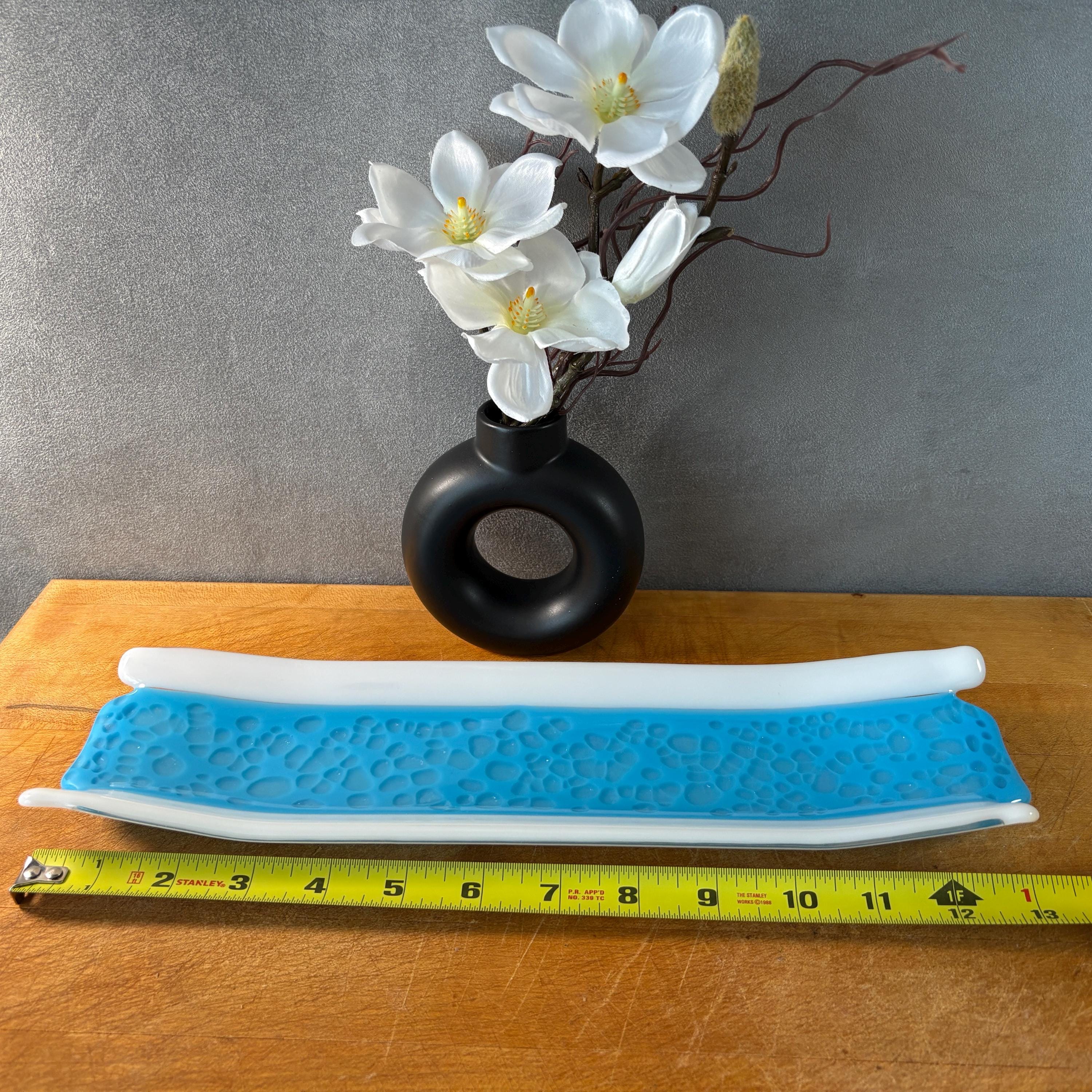 Add a touch of artistry to your table with this one-of-a-kind fused glass art designed tray, handcrafted by an American artist in the United States. Perfect for sushi or dessert nights or holding small trinkets or jewelry or pebbles or candles, or displayed as a decorative dish, this piece blends beautiful designs with the elegance of kiln-formed glass. Bring joy to your meals or brighten someone’s day with this tray, a functional work of art that is beautiful.