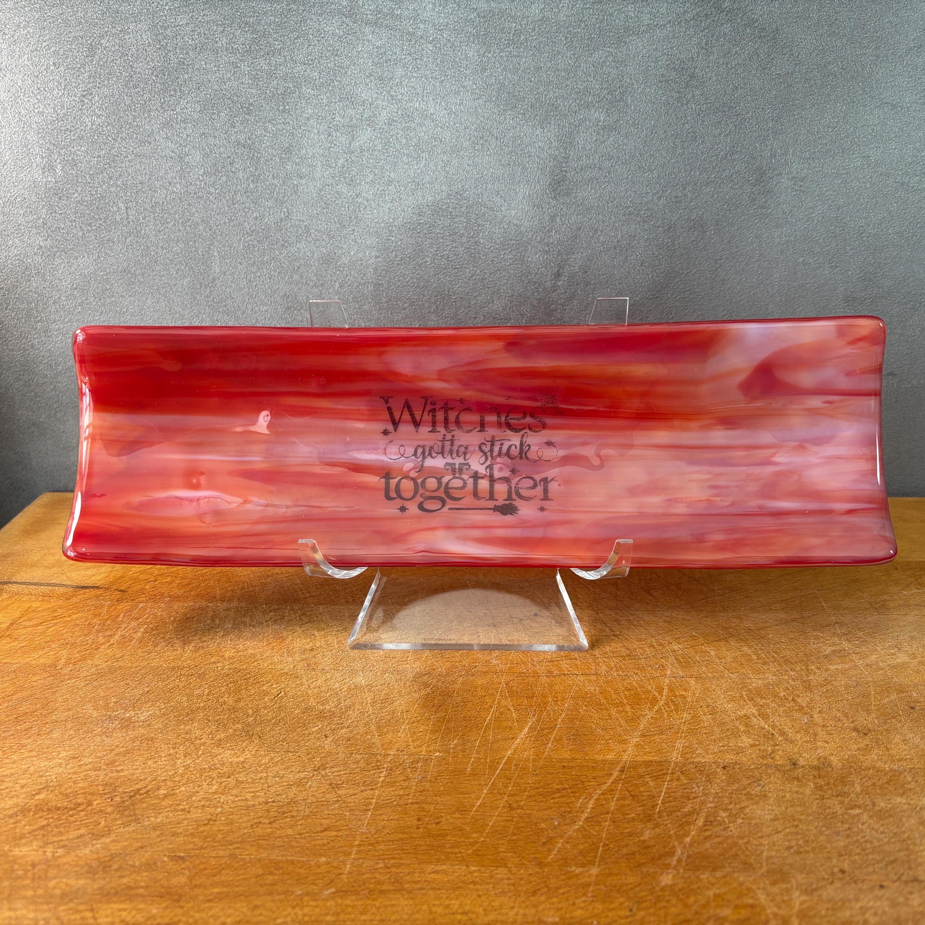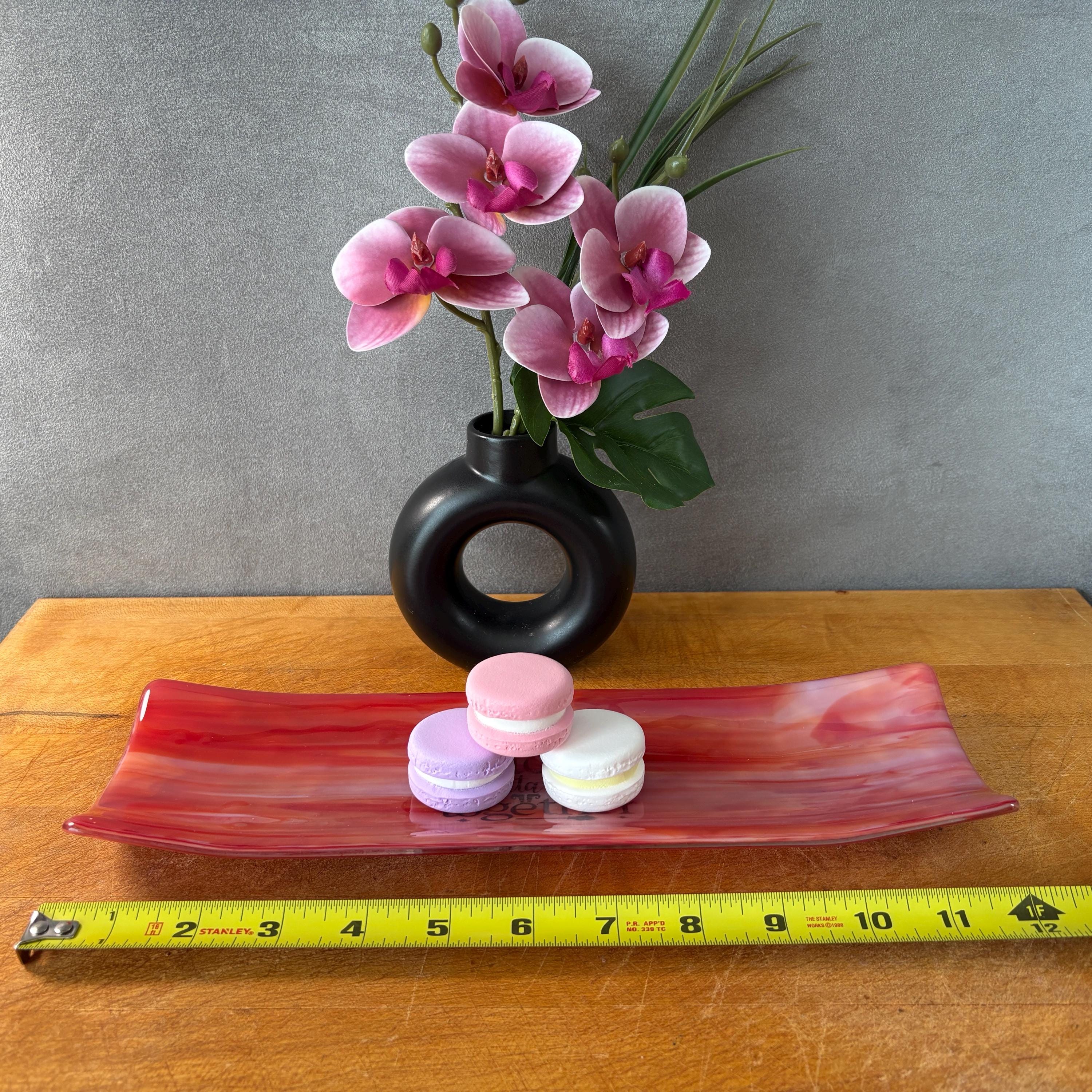 Add a touch of artistry to your table with this one-of-a-kind fused glass art designed tray, handcrafted by an American artist in the United States. Perfect for sushi or dessert nights or holding small trinkets or jewelry or pebbles or candles, or displayed as a decorative dish, this piece blends beautiful designs with the elegance of kiln-formed glass. Bring joy to your meals or brighten someone’s day with this tray, a functional work of art that is beautiful.