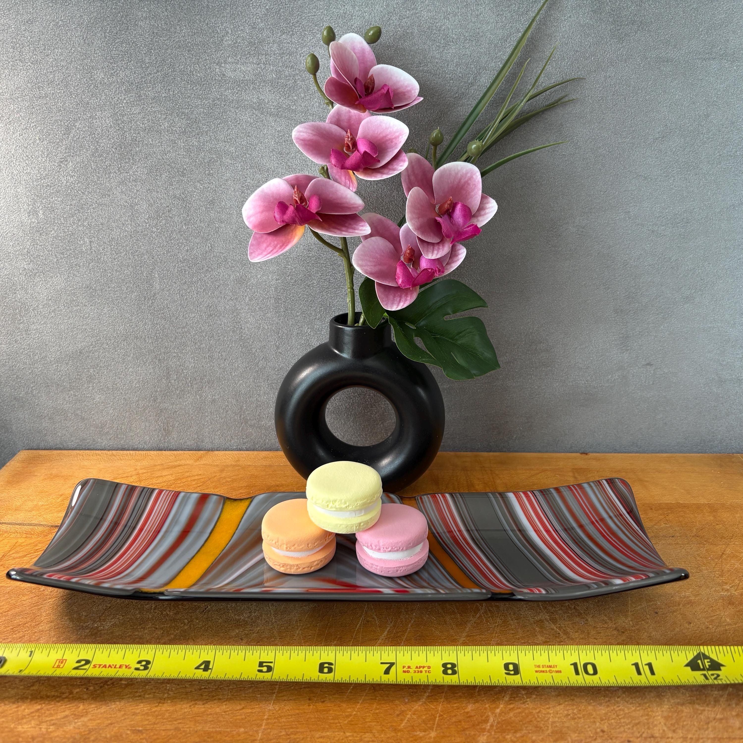 Add a touch of artistry to your table with this one-of-a-kind fused glass art designed tray, handcrafted by an American artist in the United States. Perfect for sushi or dessert nights or holding small trinkets or jewelry or pebbles or candles, or displayed as a decorative dish, this piece blends beautiful designs with the elegance of kiln-formed glass. Bring joy to your meals or brighten someone’s day with this tray, a functional work of art that is beautiful.