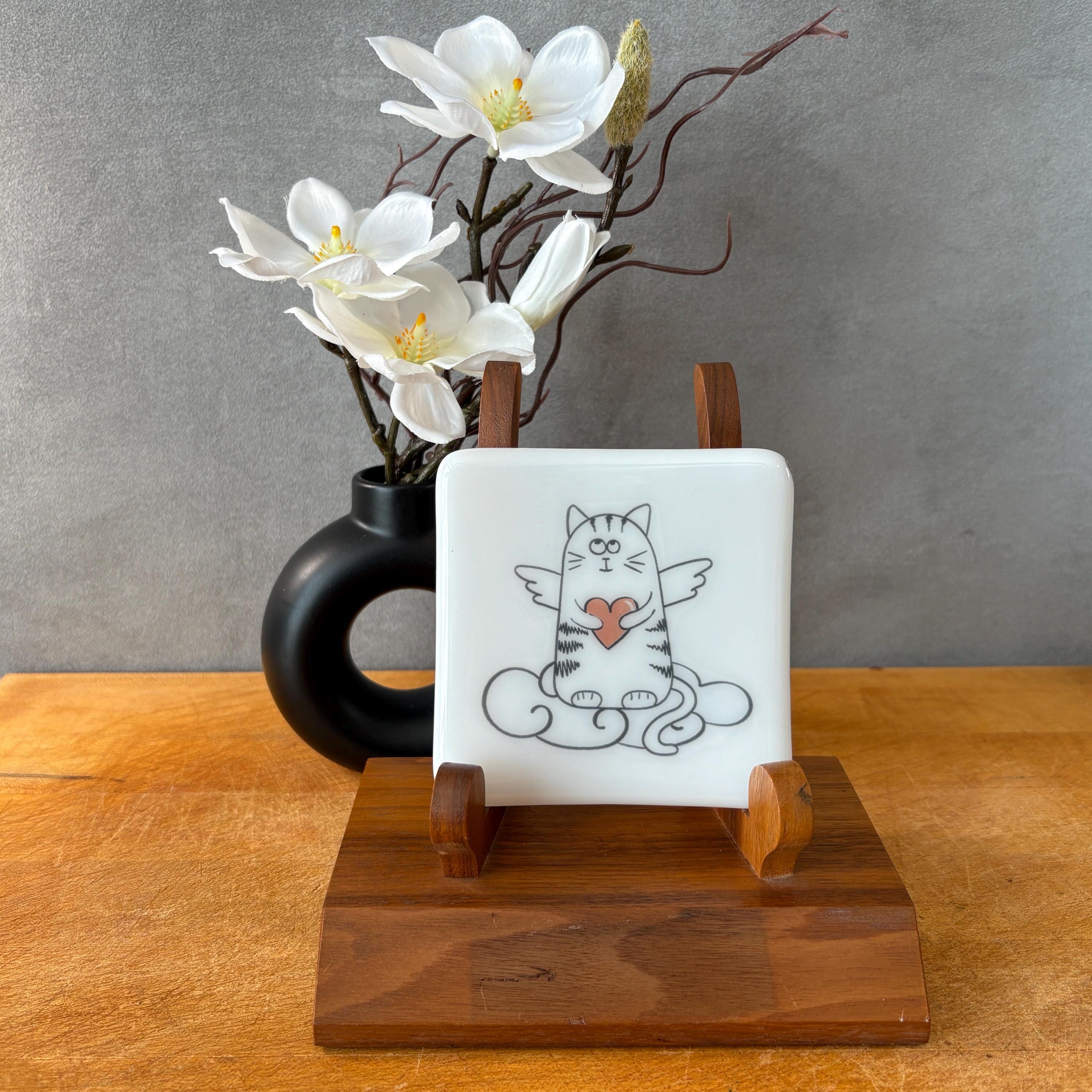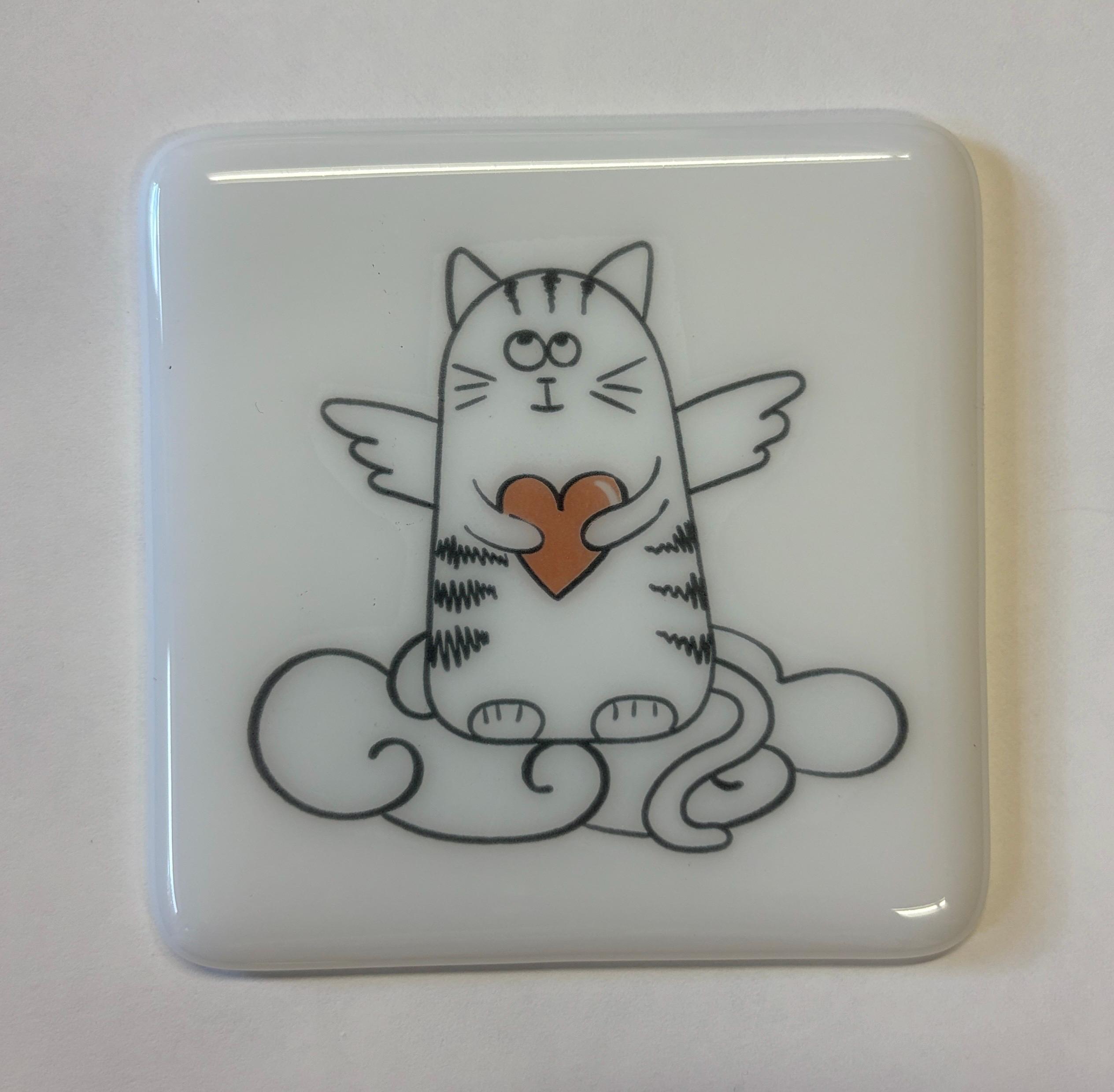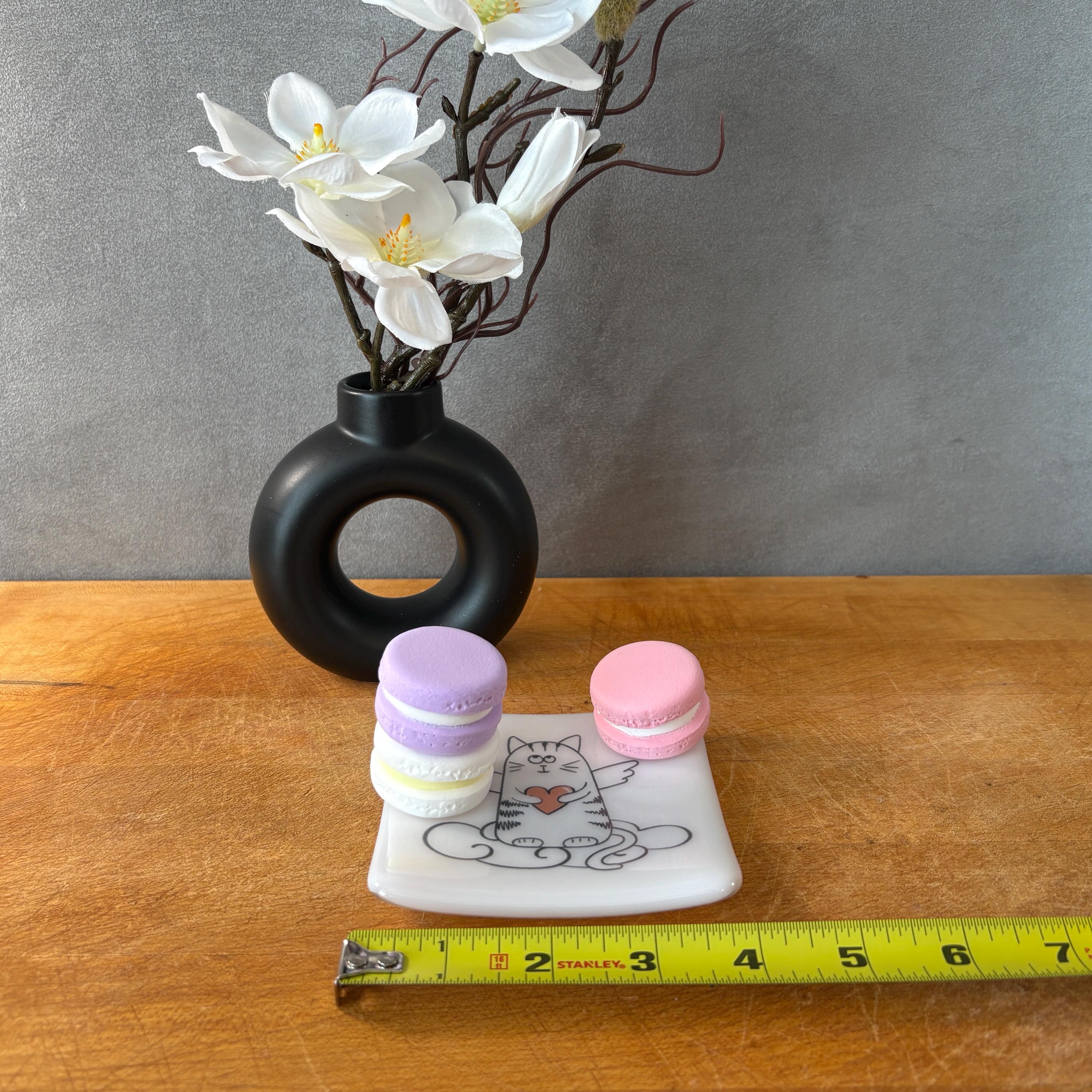 Add a touch of artistry and whimsy to your table with this one-of-a-kind fused glass cat plate, handcrafted by an American artist in the United States. Perfect for sushi or dessert nights, serving small bites, holding small trinkets or jewelry or pebbles or candles, or displayed as a decorative dish, this piece blends playful cat charm with the elegance of kiln-formed glass. Bring joy to your meals or brighten someone’s day with this whimsical cat plate, a functional work of art that’s as fun as it is beautiful.