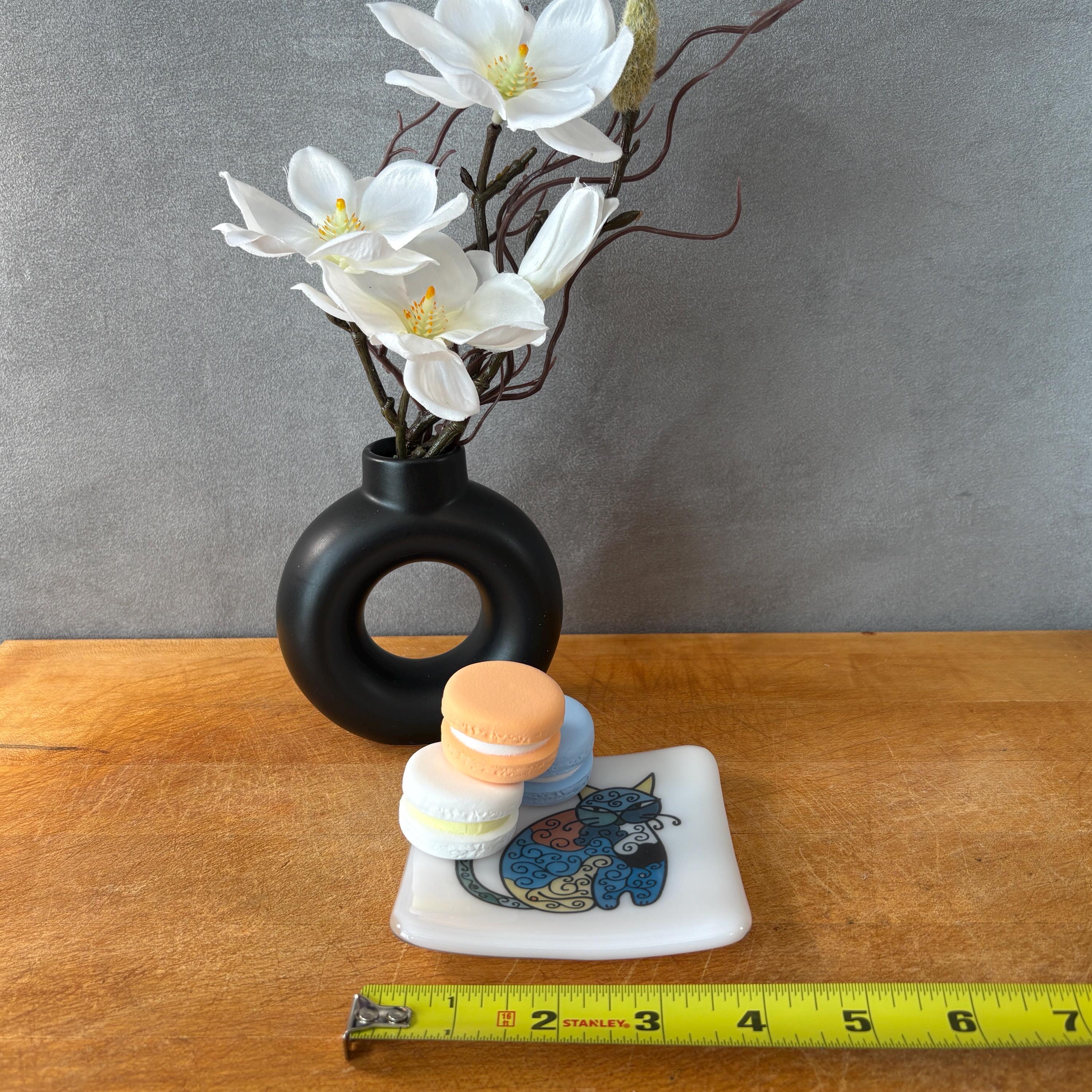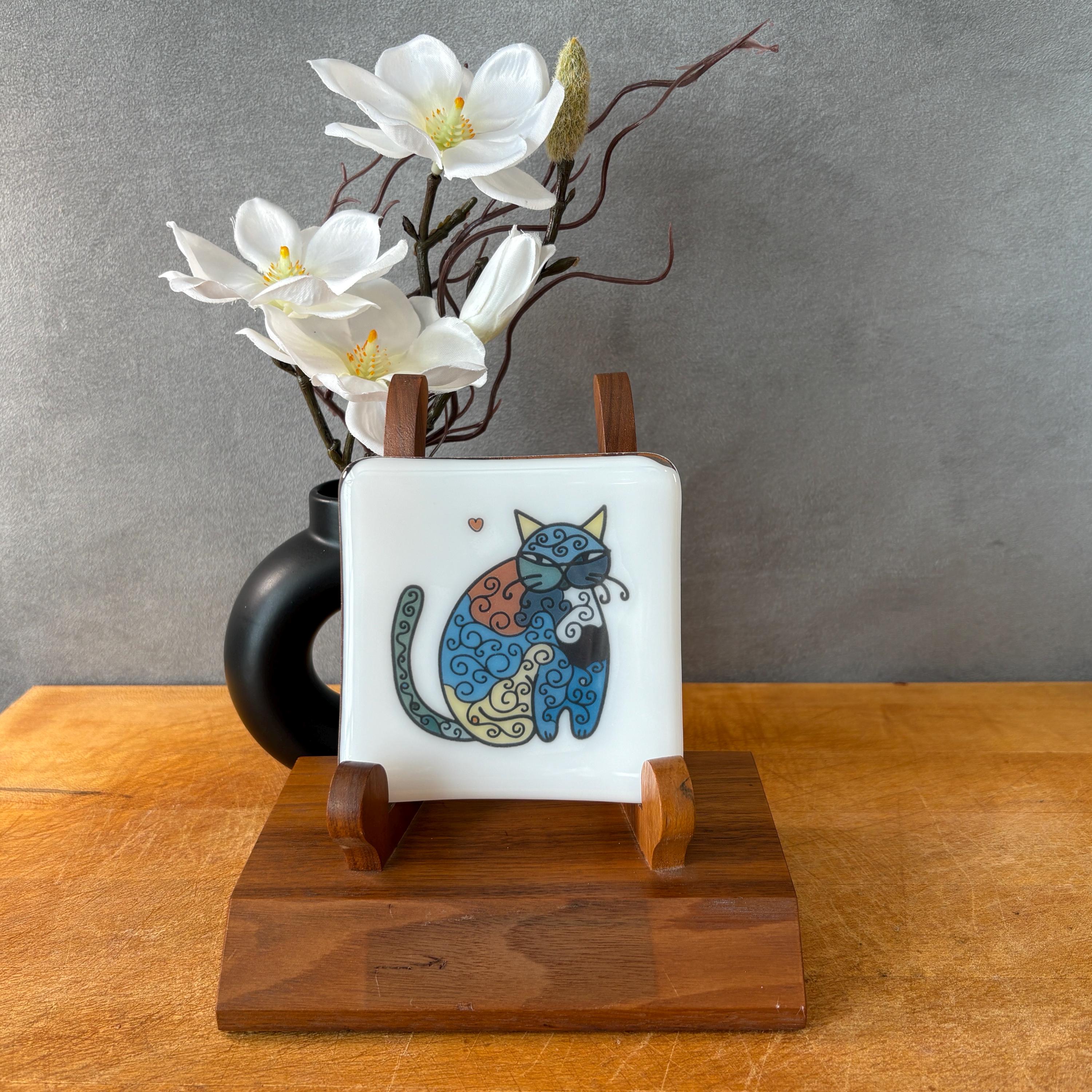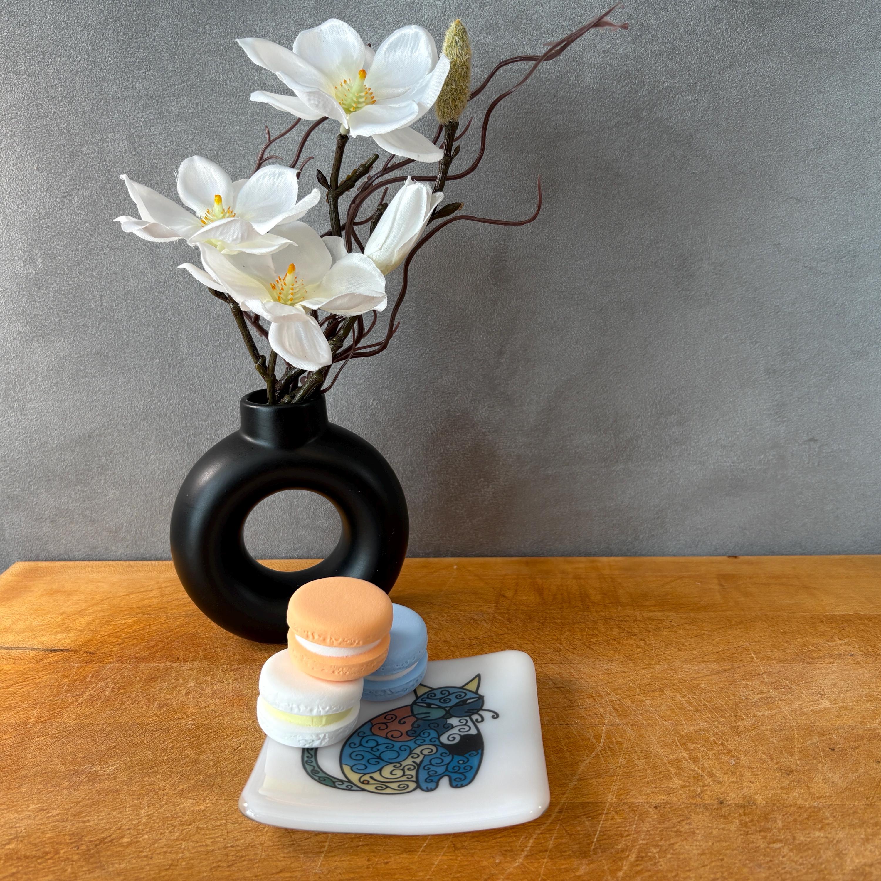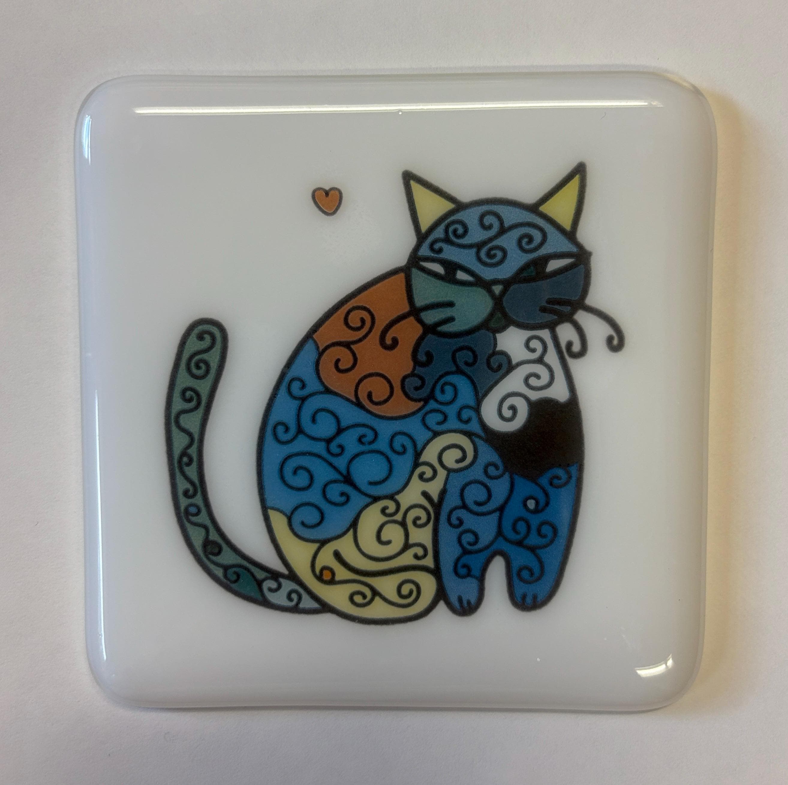 Add a touch of artistry and whimsy to your table with this one-of-a-kind fused glass cat plate, handcrafted by an American artist in the United States. Perfect for sushi or dessert nights, serving small bites, holding small trinkets or jewelry or pebbles or candles, or displayed as a decorative dish, this piece blends playful cat charm with the elegance of kiln-formed glass. Bring joy to your meals or brighten someone’s day with this whimsical cat plate, a functional work of art that’s as fun as it is beautiful.