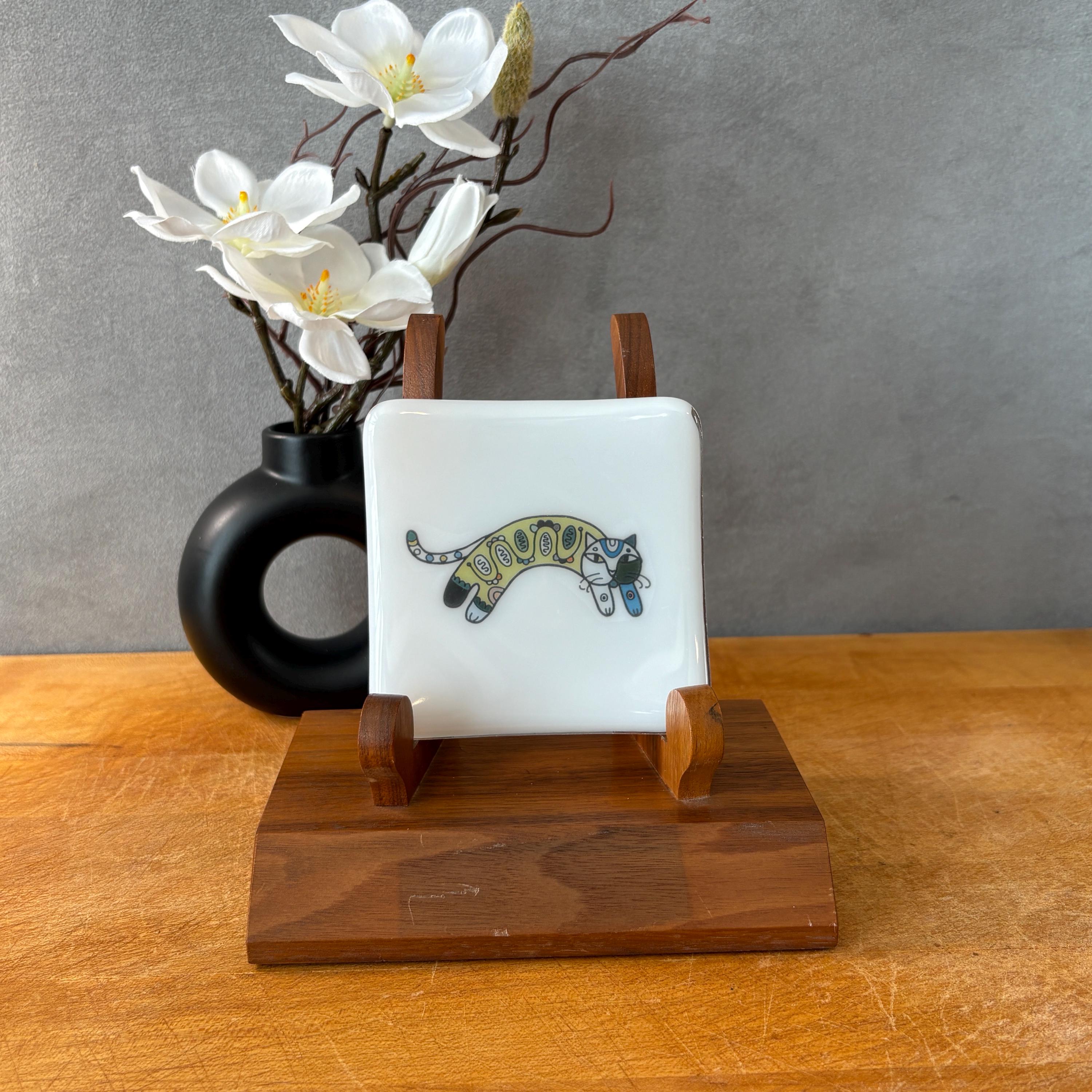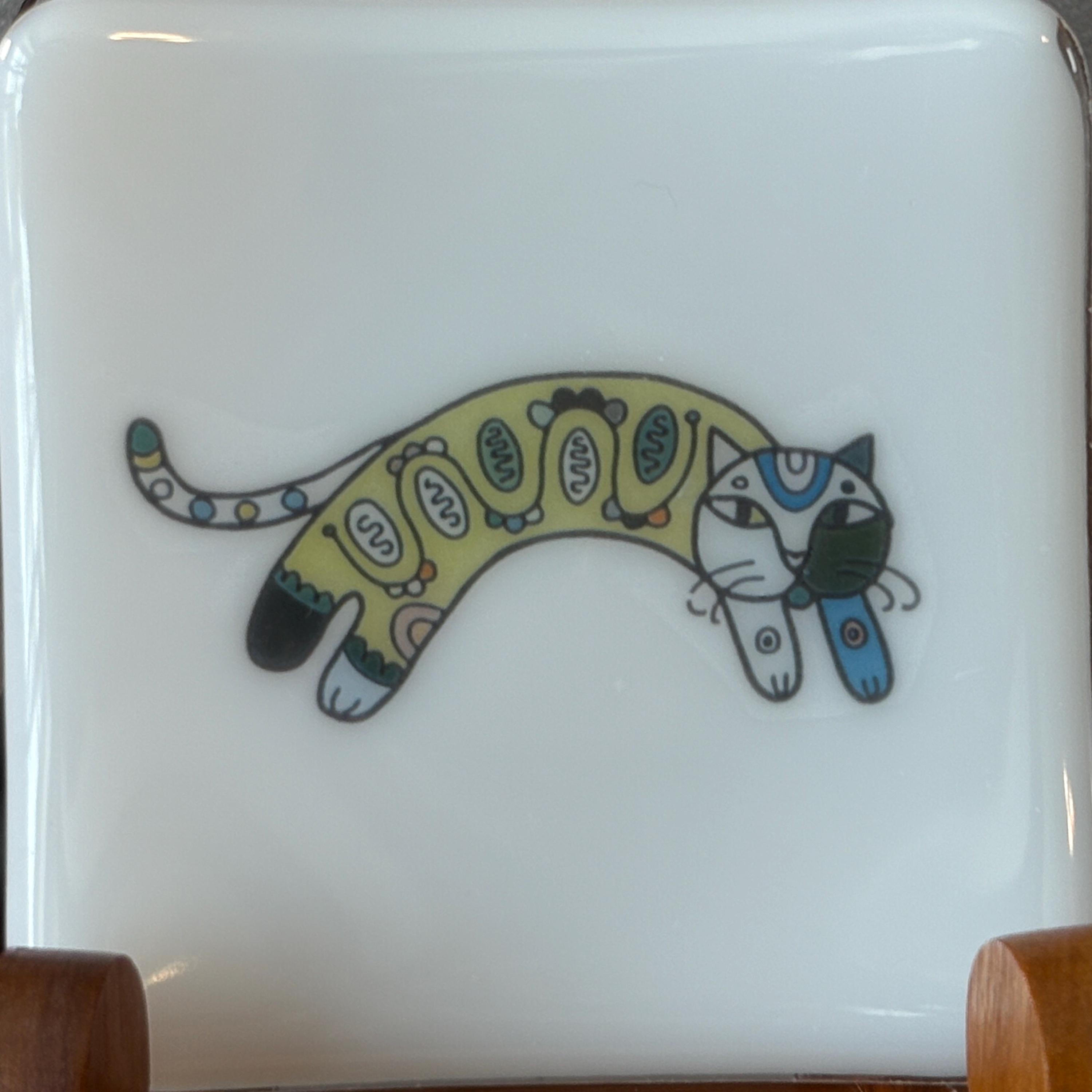 catplt020-Handmade Fused Glass Cat Dish: Whimsical Sushi Dessert Plate, 4" Square