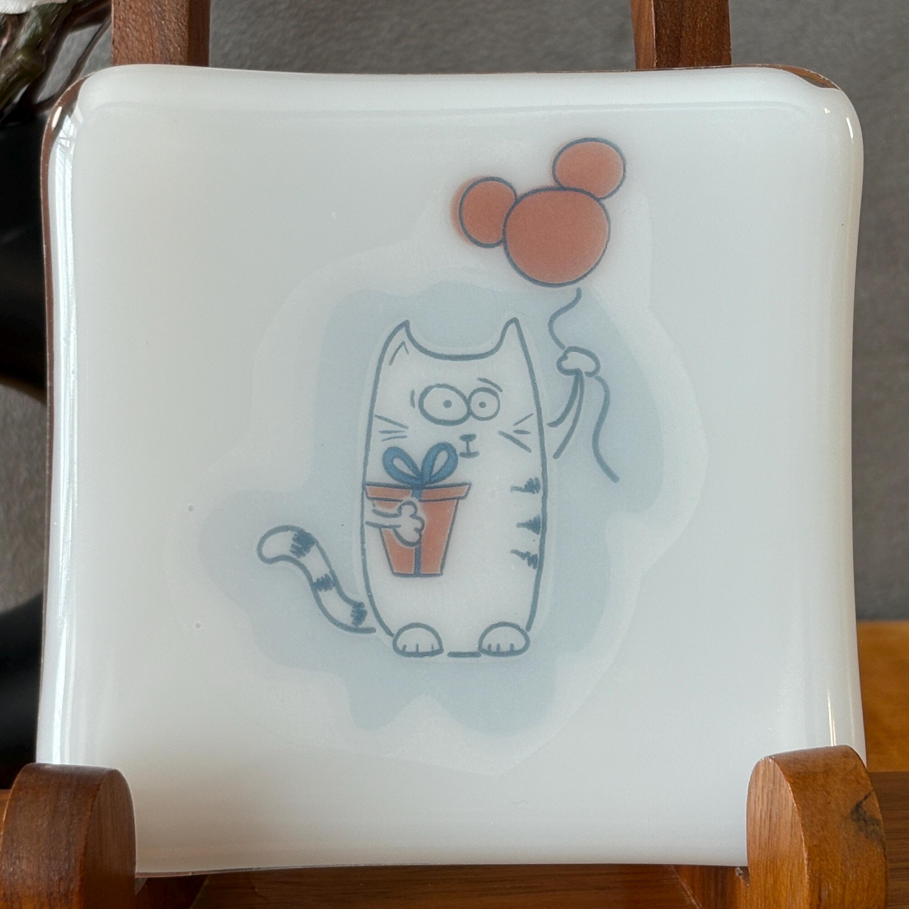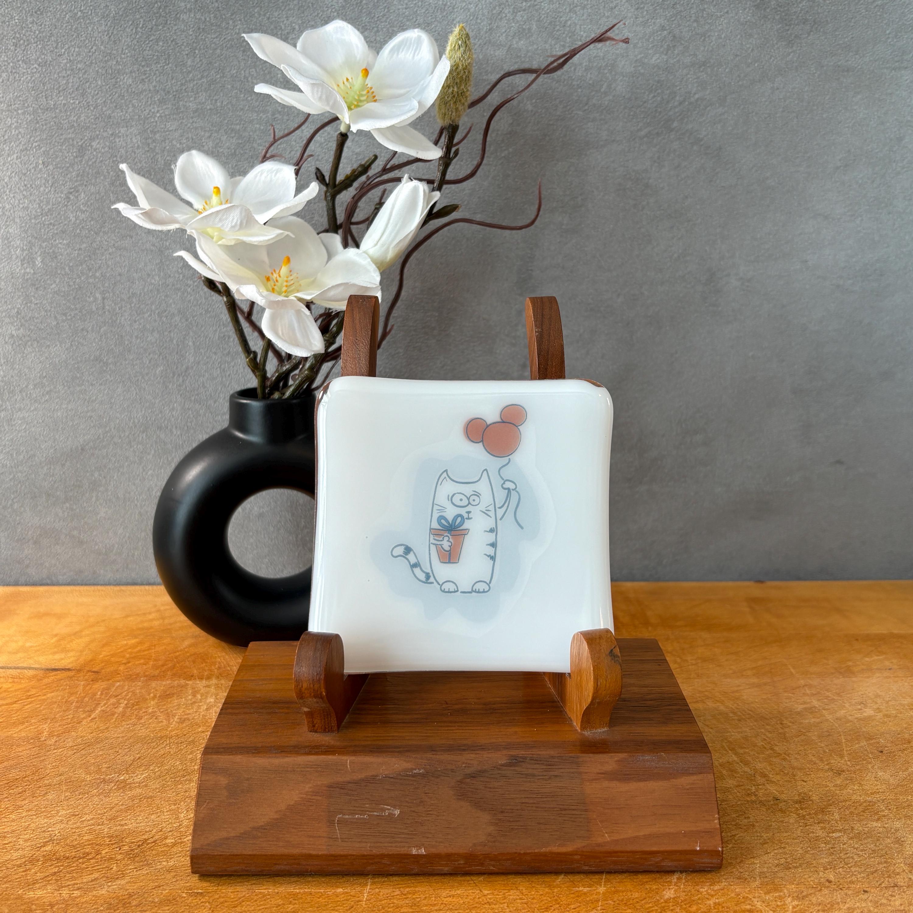 catplt014-Fused Glass Cat Plate: Handmade 4" Square Decorative Dish