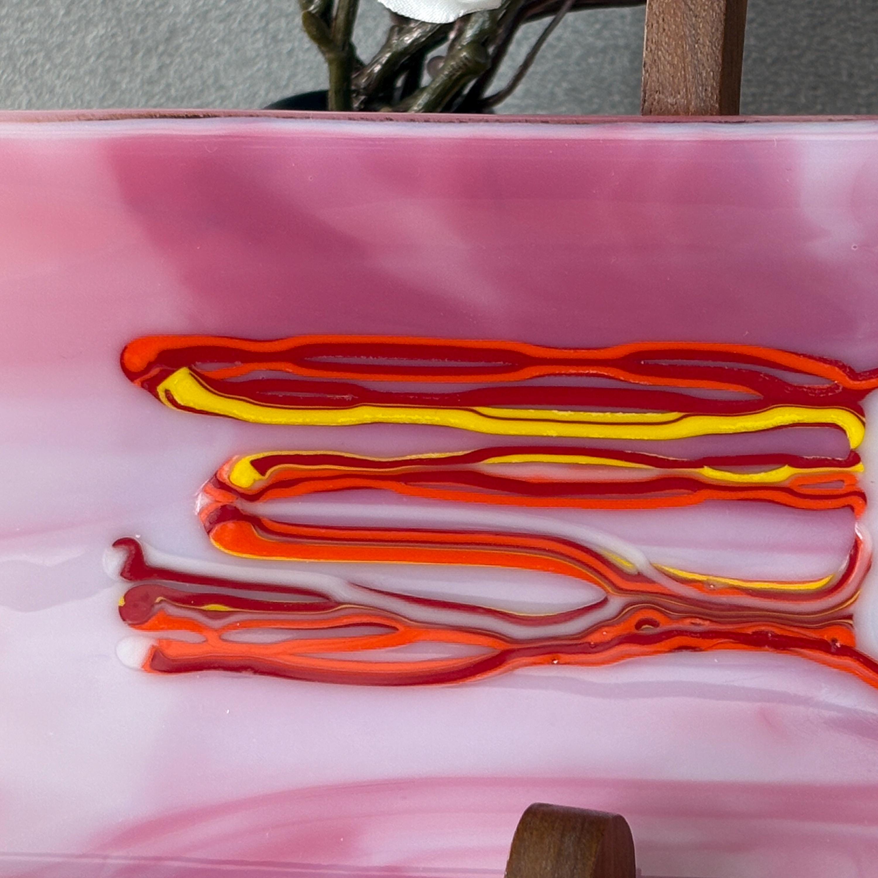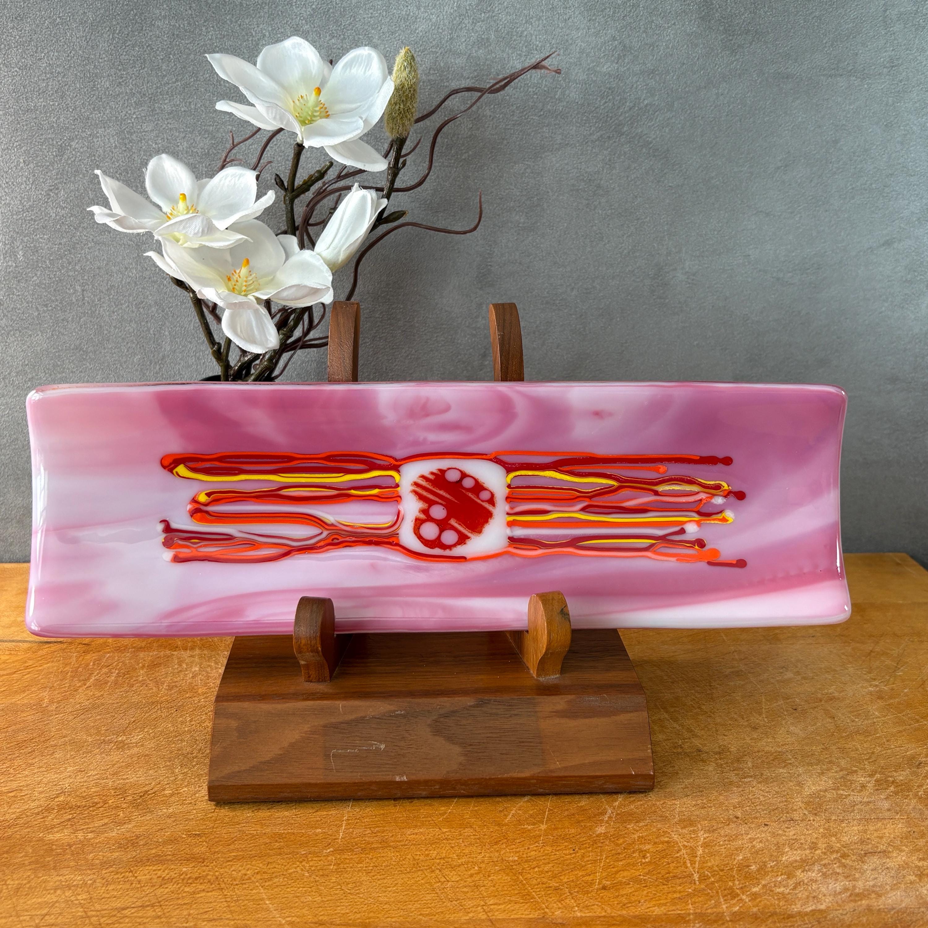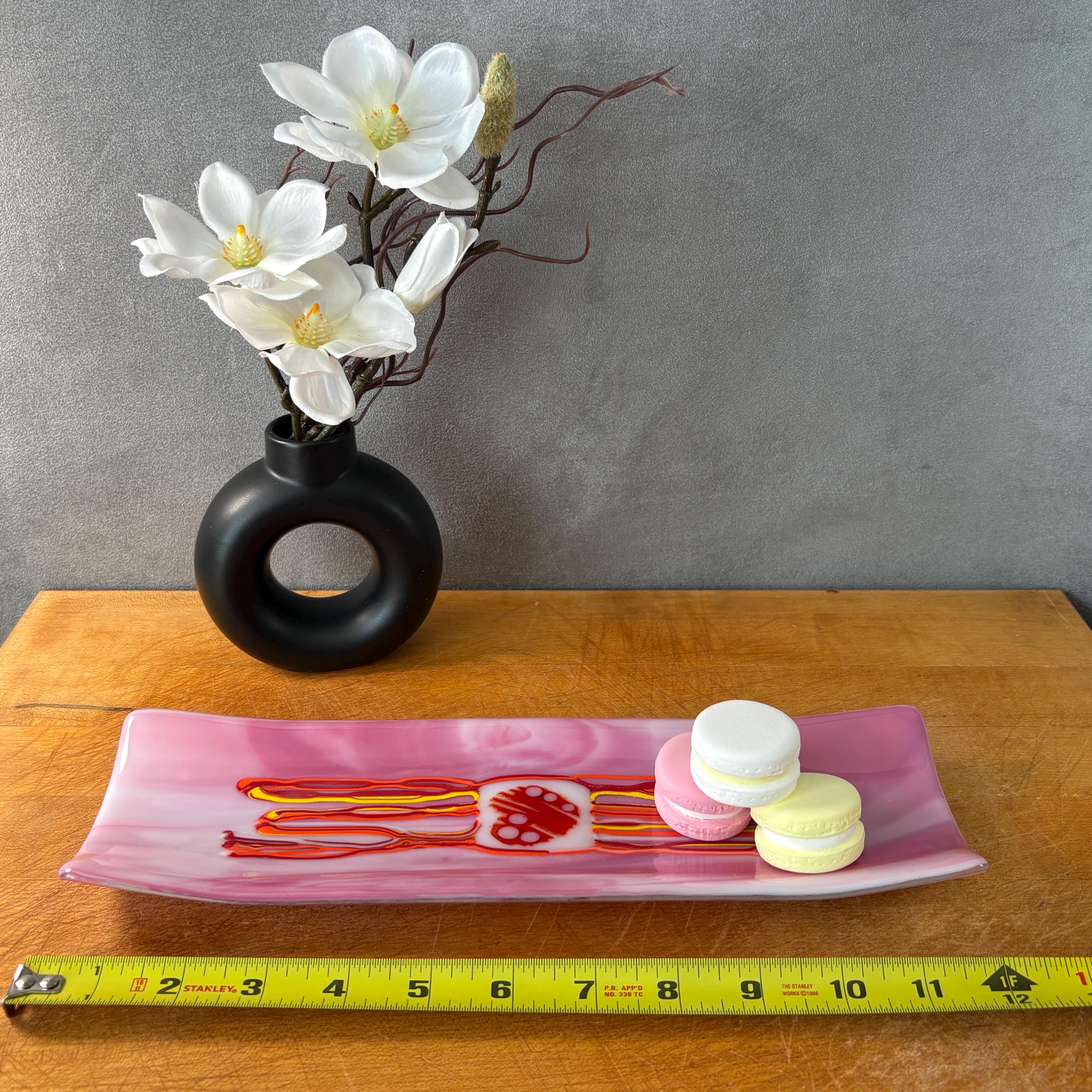 Add a touch of artistry to your table with this one-of-a-kind fused glass art designed tray, handcrafted by an American artist in the United States. Perfect for sushi or dessert nights or holding small trinkets or jewelry or pebbles or candles, or displayed as a decorative dish, this piece blends beautiful designs with the elegance of kiln-formed glass. Bring joy to your meals or brighten someone’s day with this tray, a functional work of art that is beautiful.