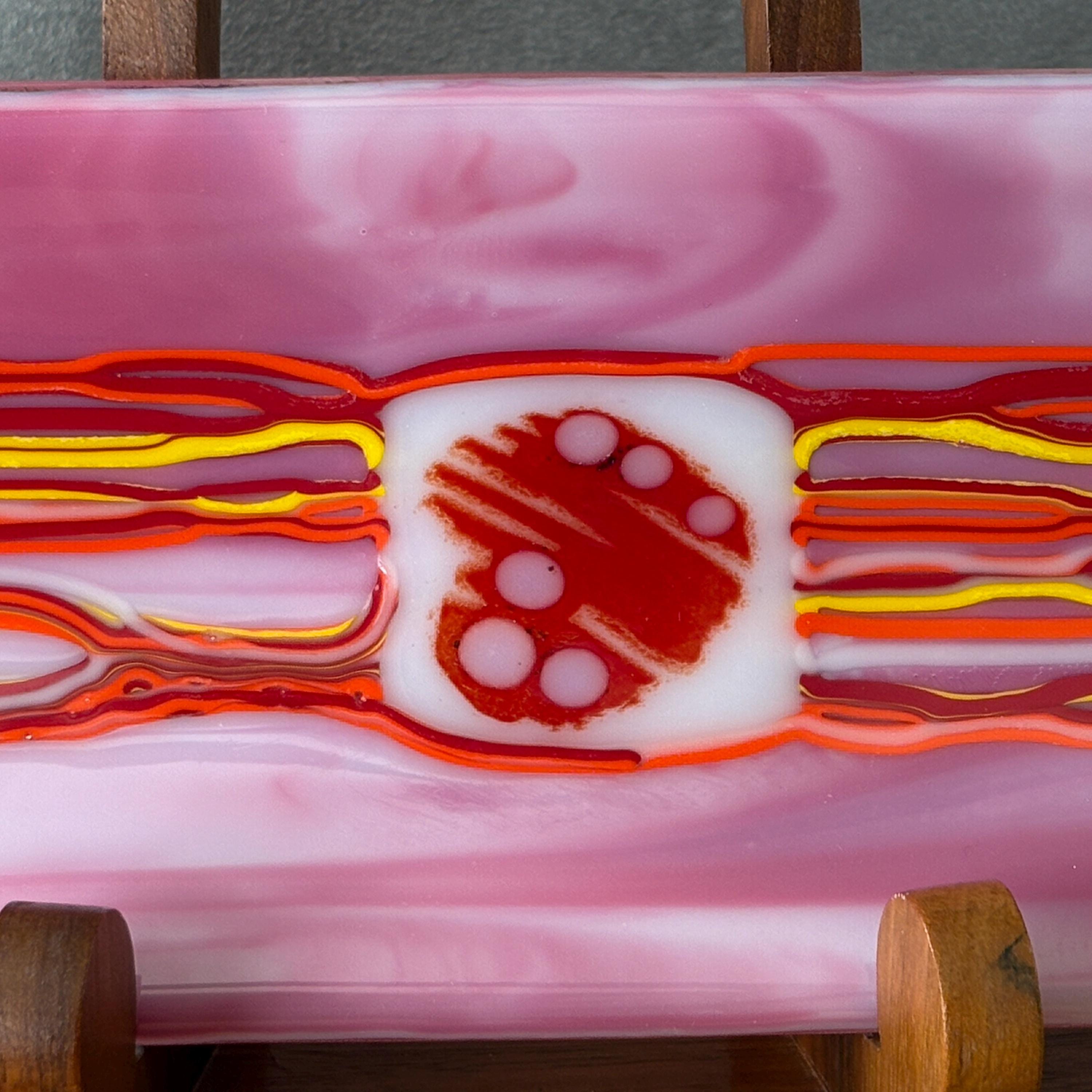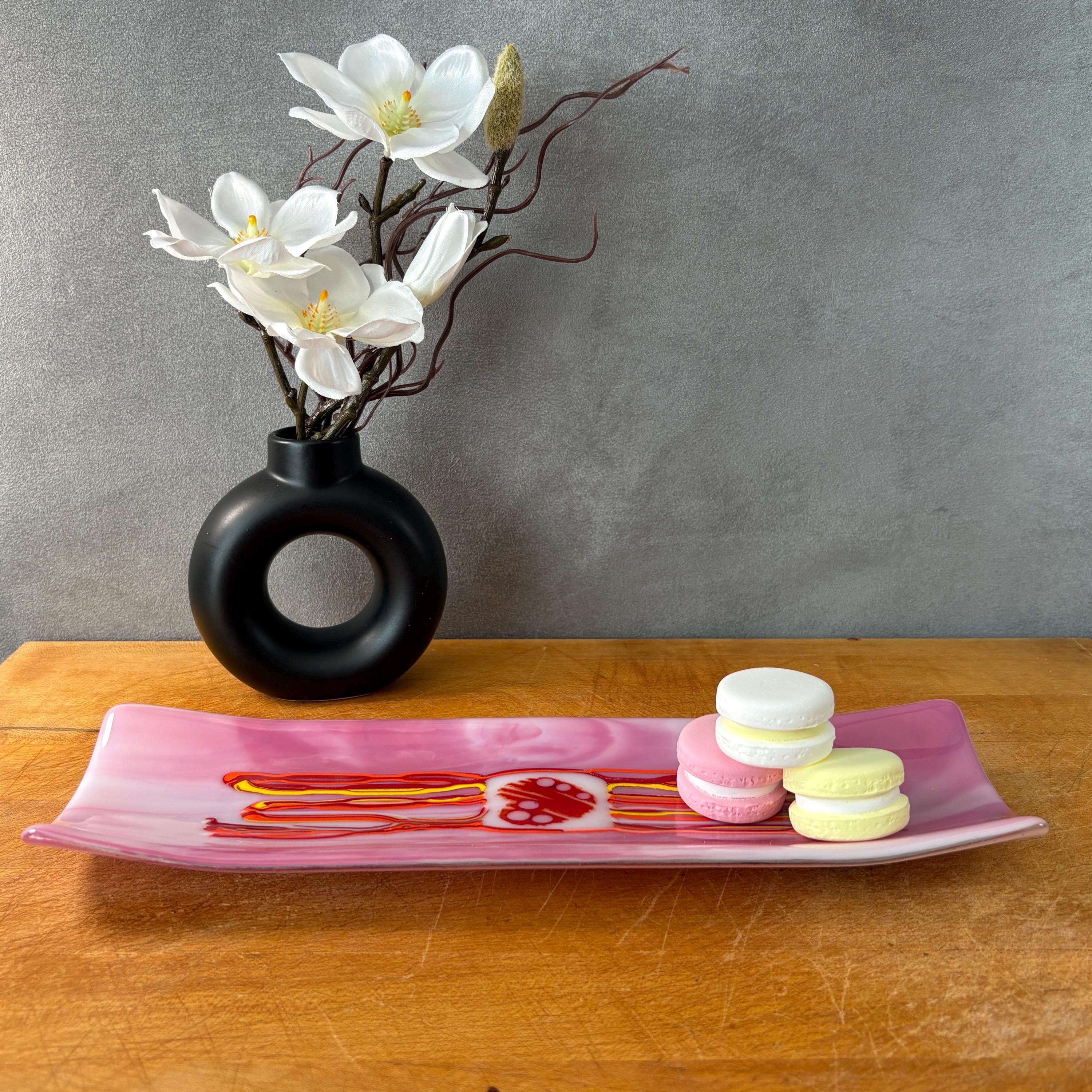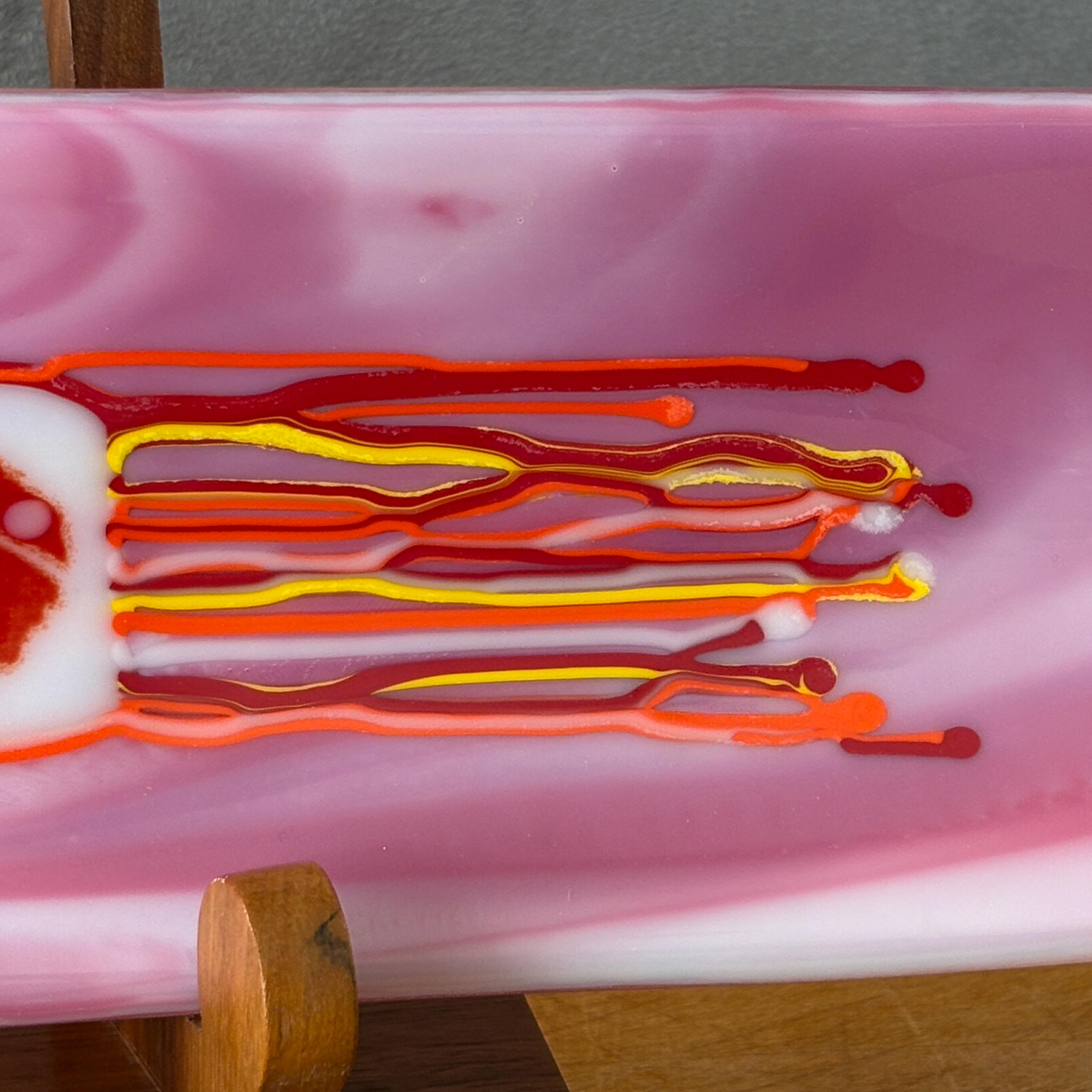 Add a touch of artistry to your table with this one-of-a-kind fused glass art designed tray, handcrafted by an American artist in the United States. Perfect for sushi or dessert nights or holding small trinkets or jewelry or pebbles or candles, or displayed as a decorative dish, this piece blends beautiful designs with the elegance of kiln-formed glass. Bring joy to your meals or brighten someone’s day with this tray, a functional work of art that is beautiful.