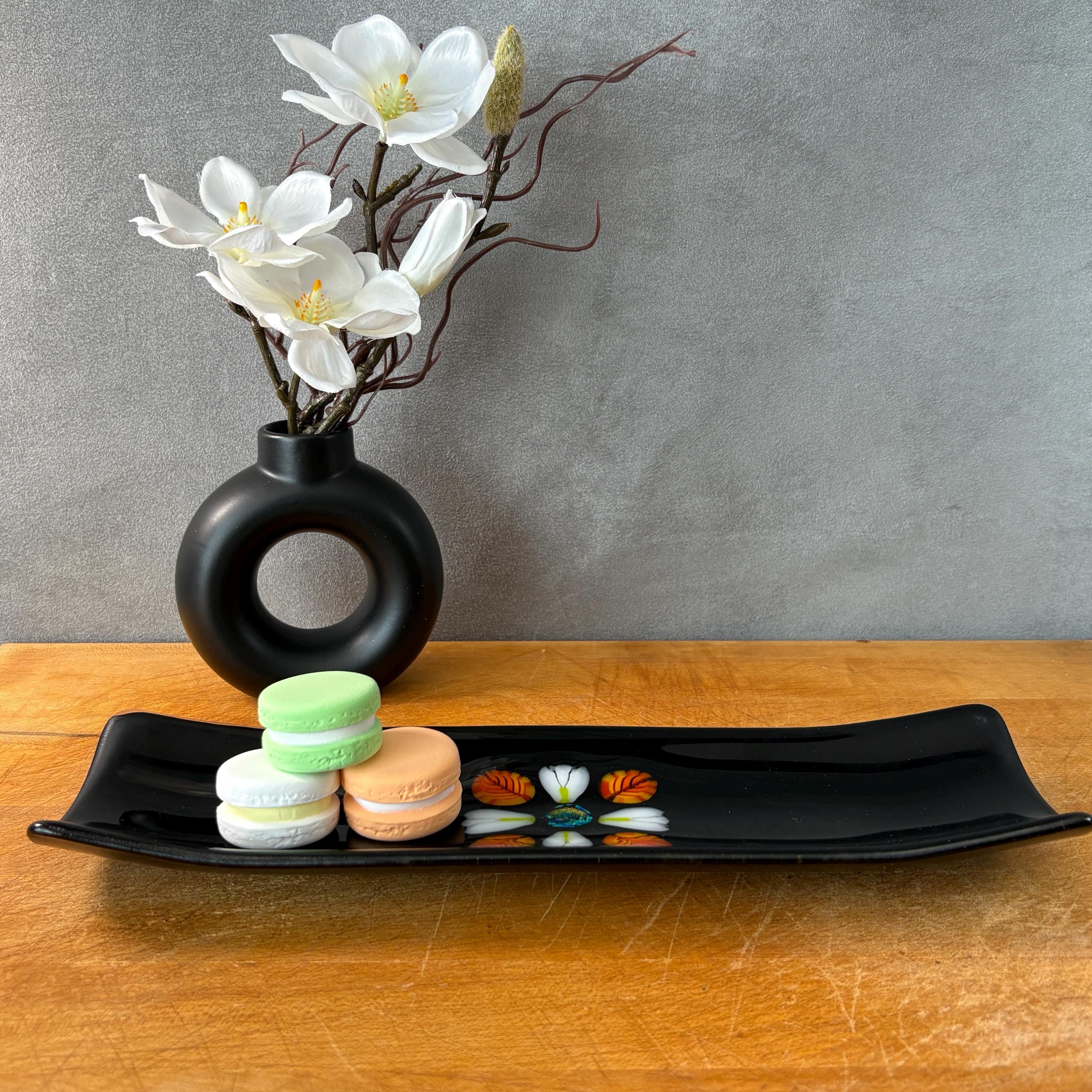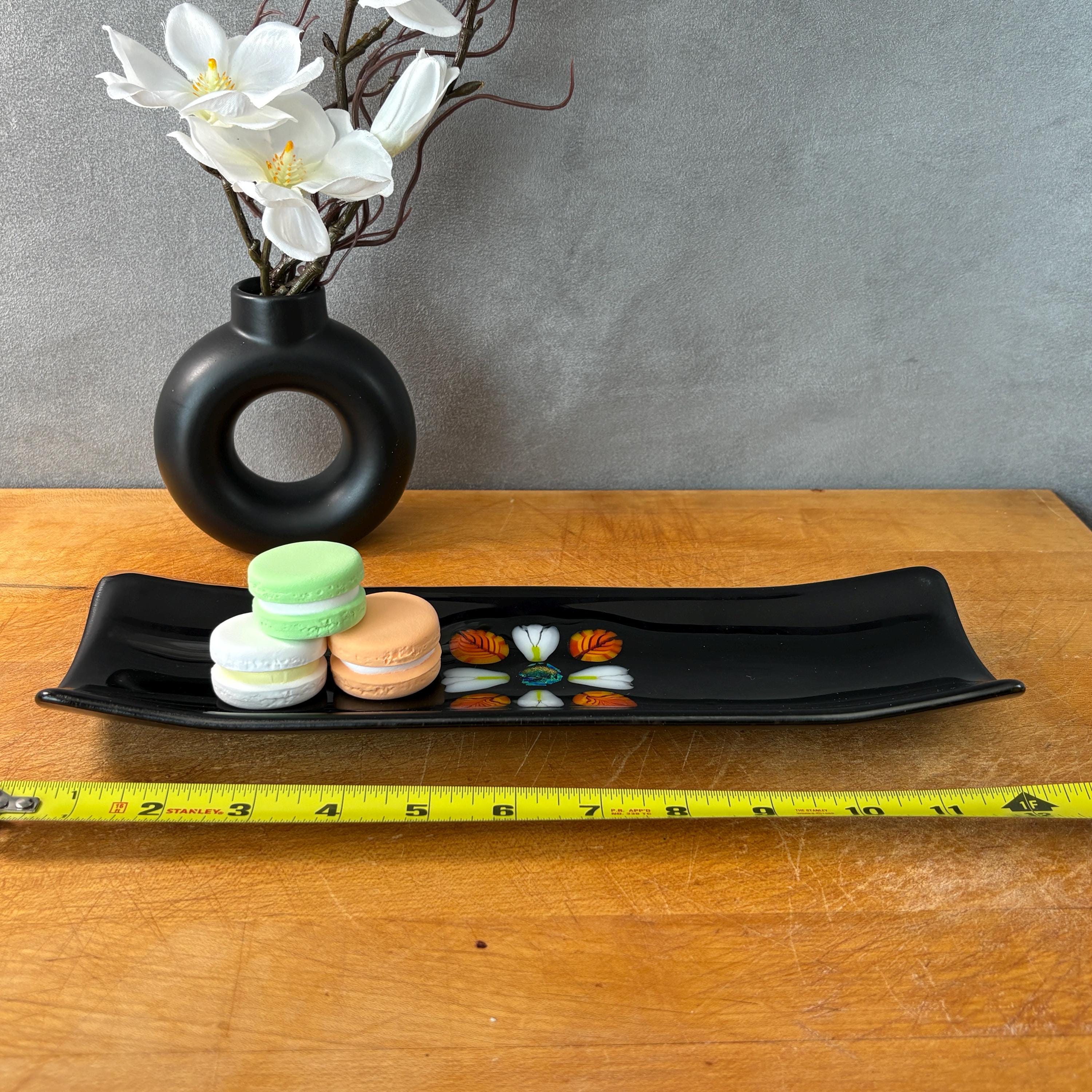 Add a touch of artistry to your table with this one-of-a-kind fused glass art designed tray, handcrafted by an American artist in the United States. Perfect for sushi or dessert nights or holding small trinkets or jewelry or pebbles or candles, or displayed as a decorative dish, this piece blends beautiful designs with the elegance of kiln-formed glass. Bring joy to your meals or brighten someone’s day with this tray, a functional work of art that is beautiful.