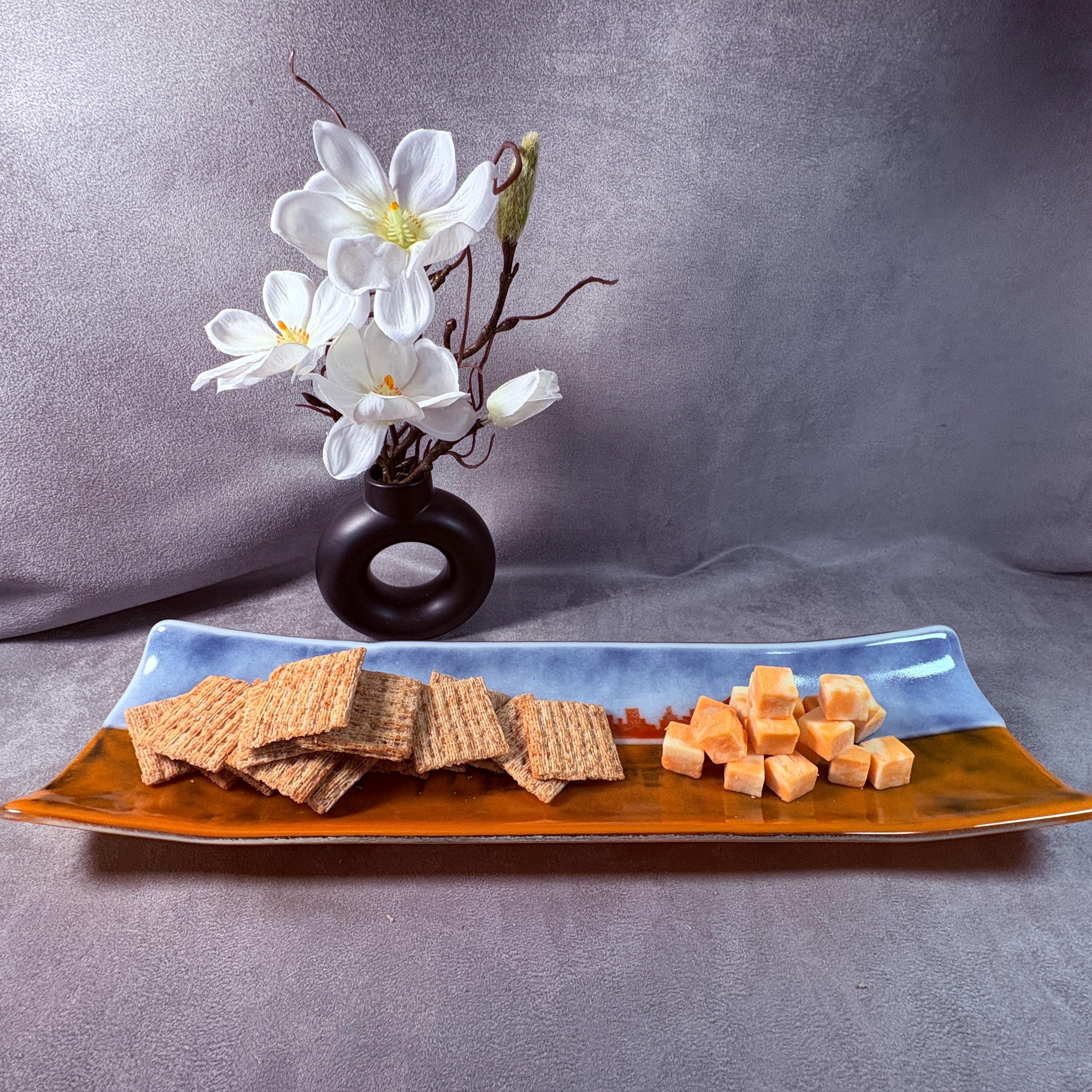 Measuring a graceful 17” long and 5” wide, this piece features an elegant flow of color and form, designed to feel like modern art that just happens to be perfect for sushi night. The glass has been carefully cut, layered, and kiln-fired into a single smooth surface, then shaped and polished for a soft, handmade finish.