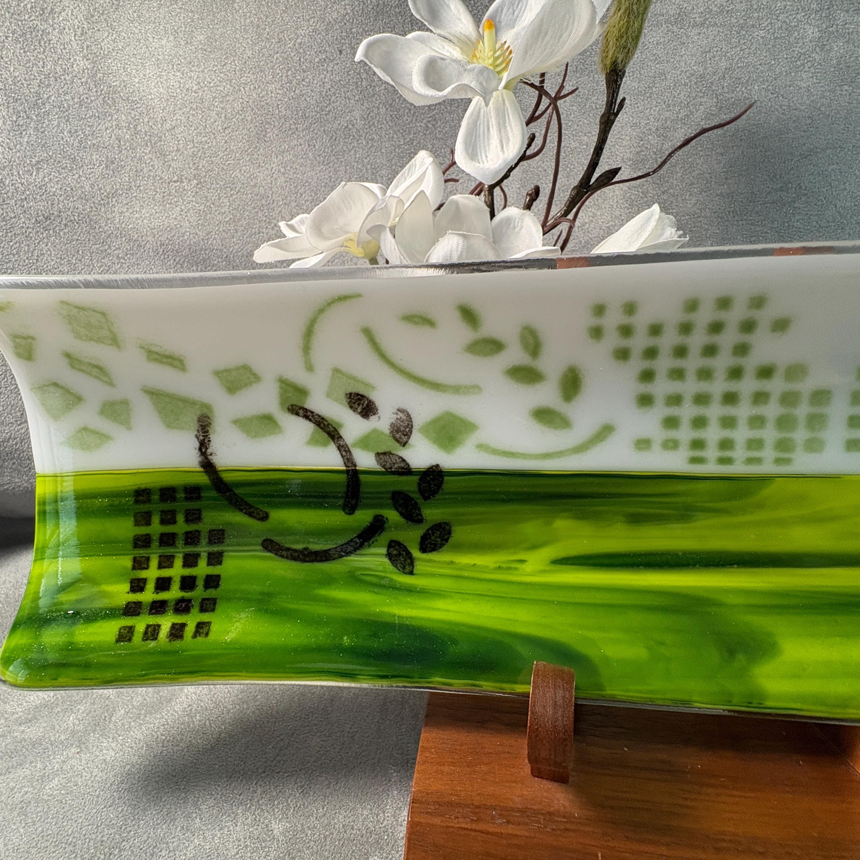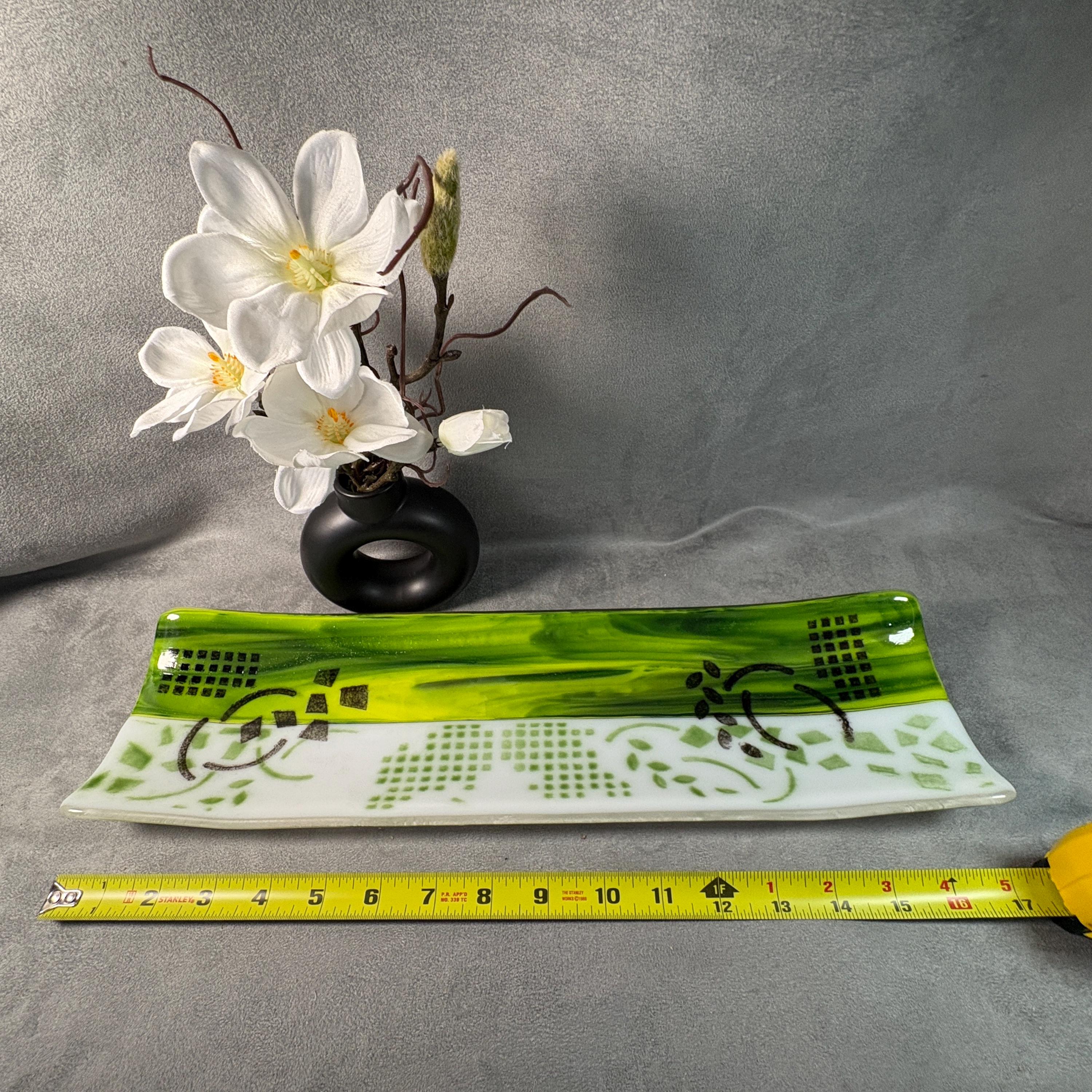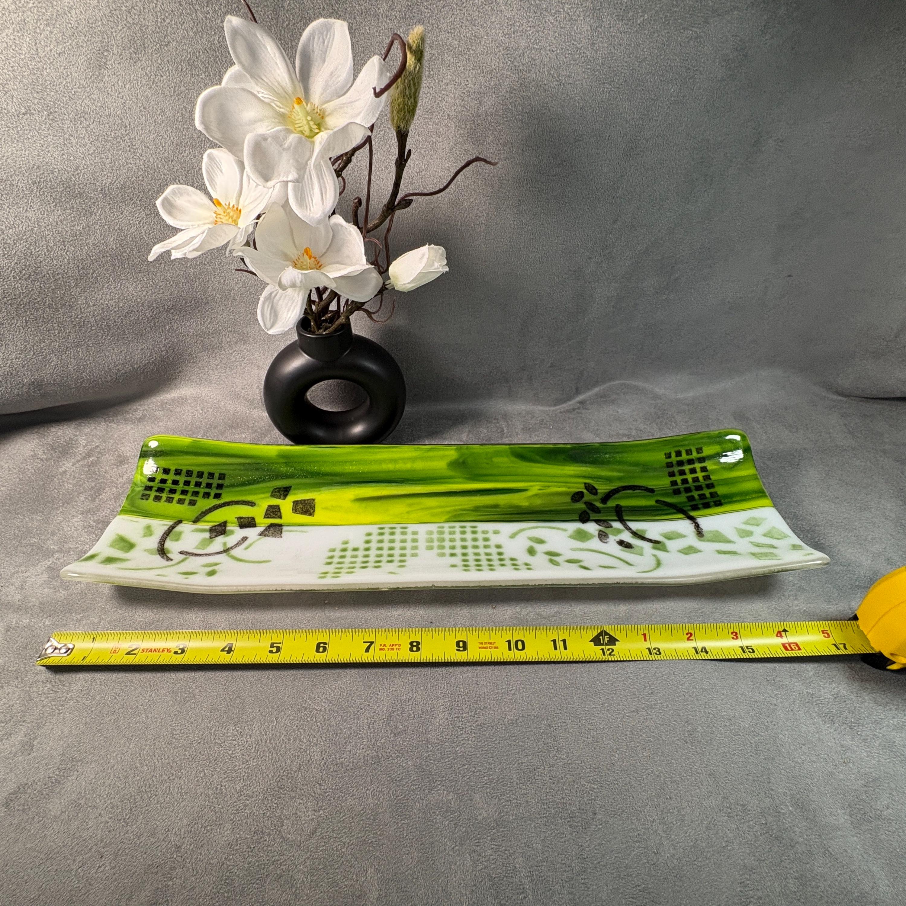 lgtray008-Green Geometric – 17” Hand-Fused Glass Sushi Tray (Because Your Sushi Deserves to Feel Fancy)