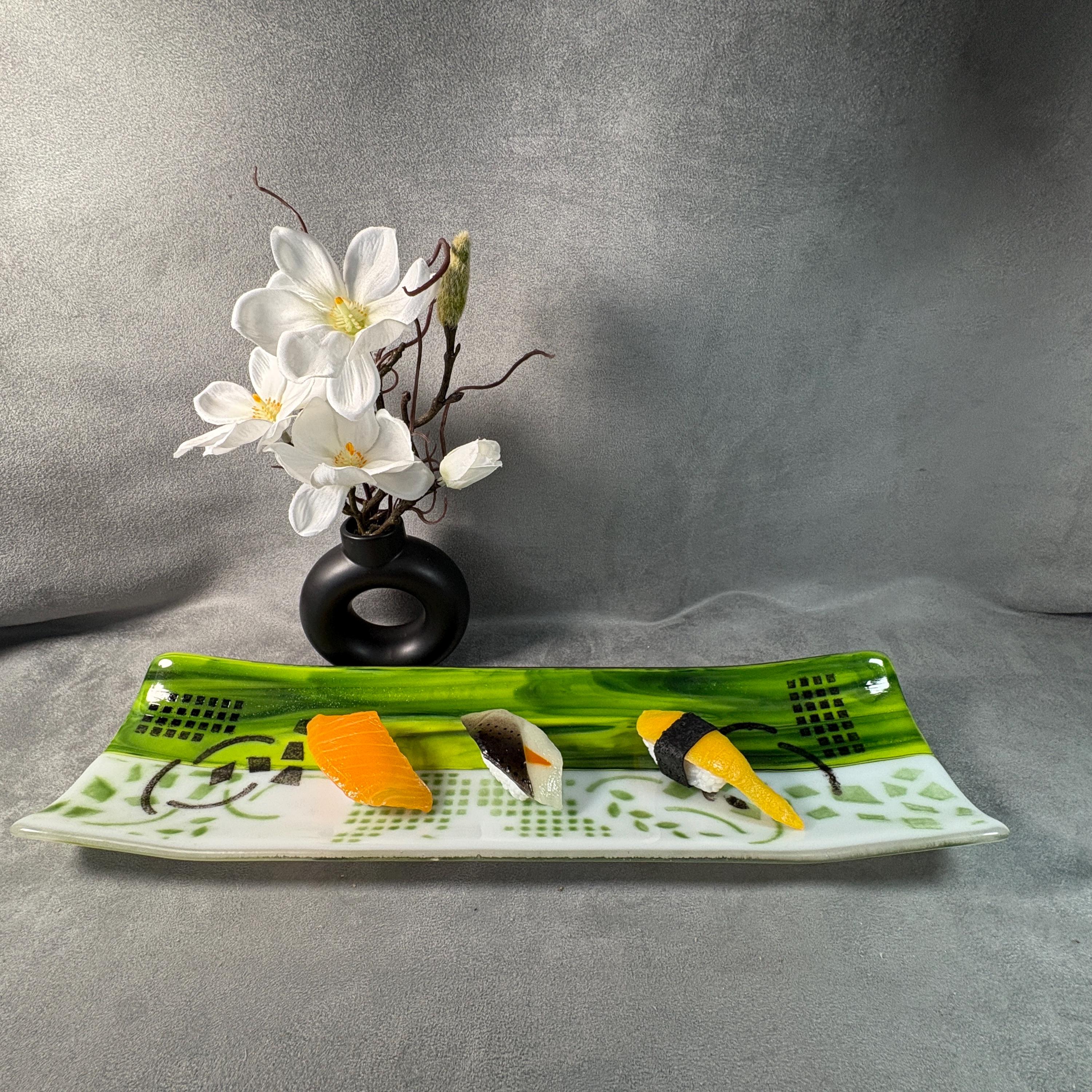 Invite your meals to the art gallery! For those who believe dinnerware should also be a conversation, this fused glass sushi tray brings art to the table — literally.