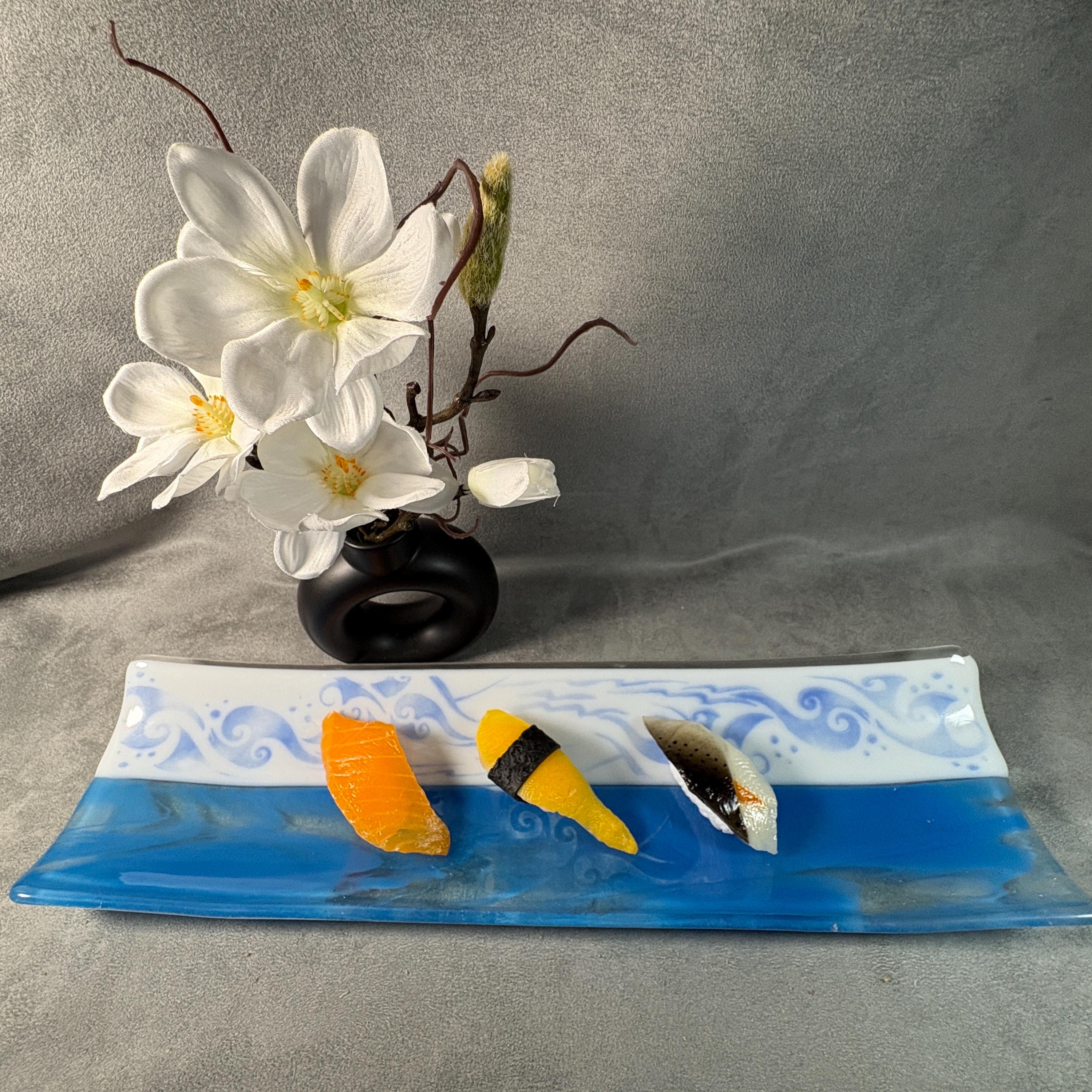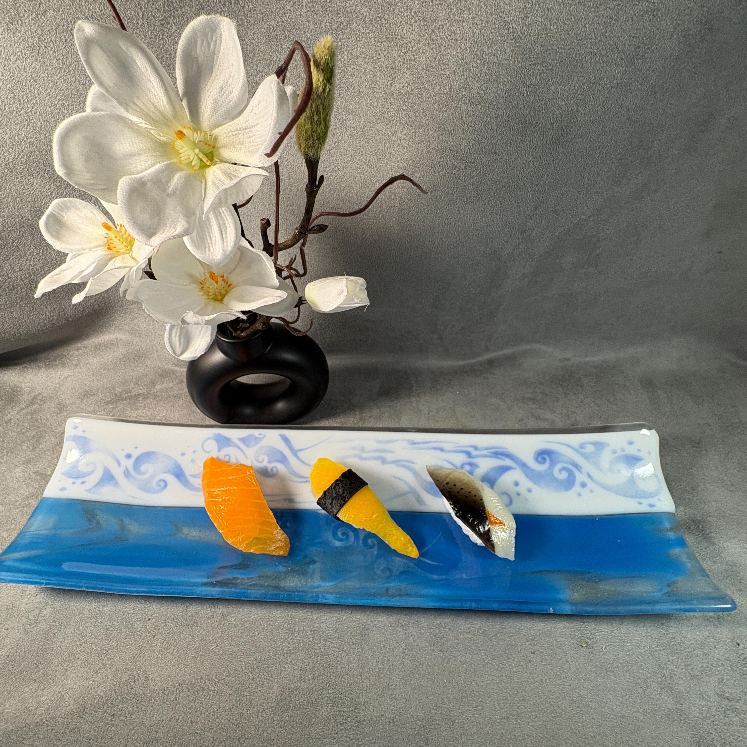 Invite your meals to the art gallery! For those who believe dinnerware should also be a conversation, this fused glass sushi tray brings art to the table — literally.