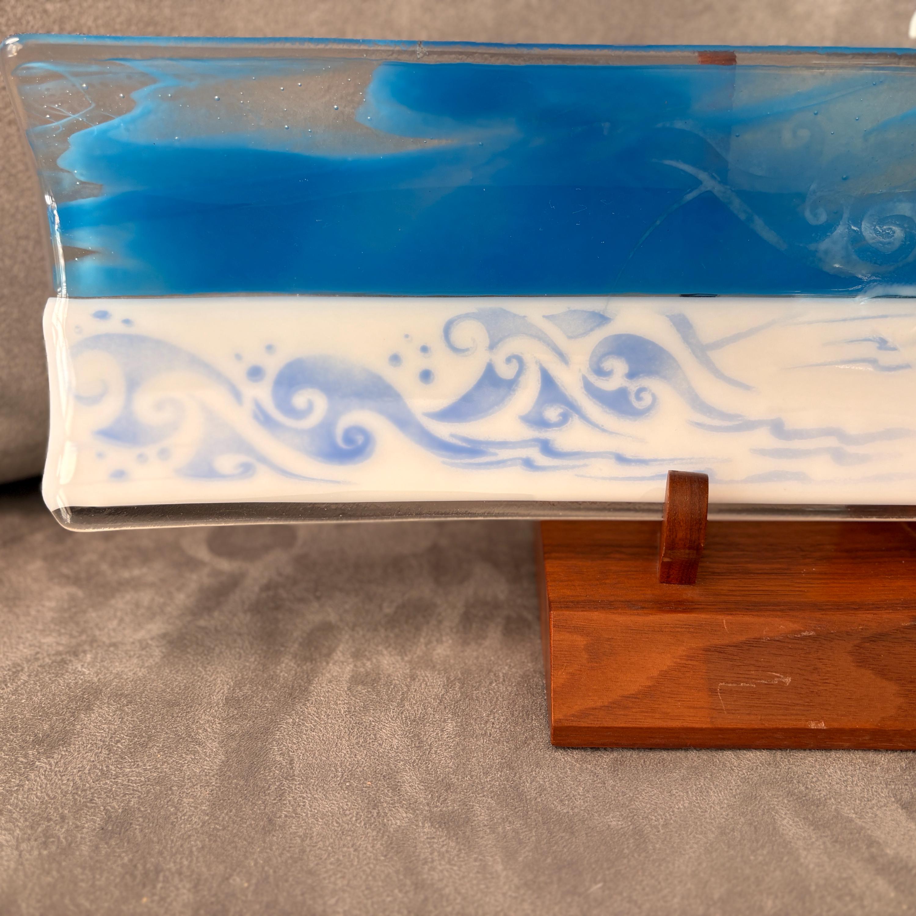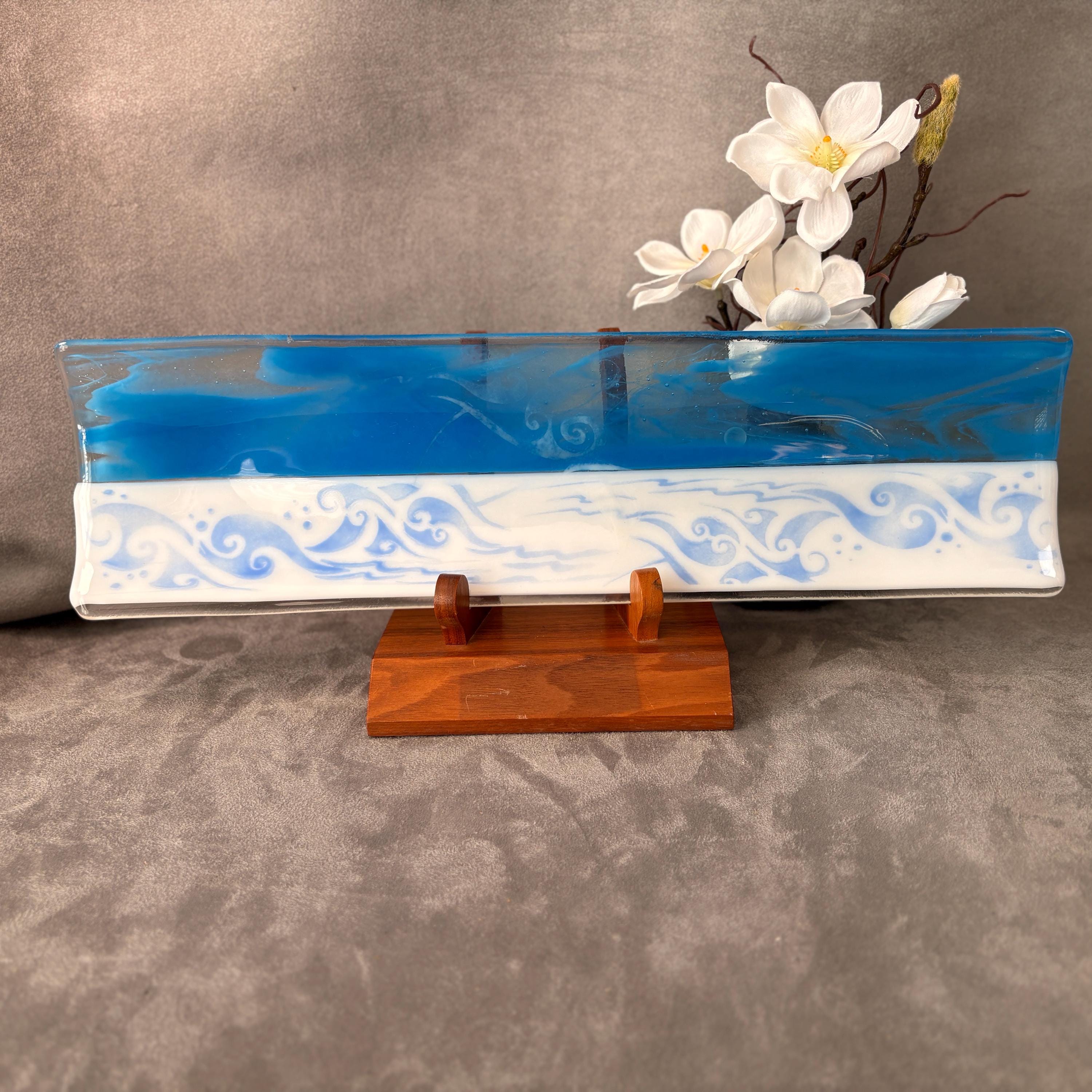 Measuring a graceful 17” long and 5” wide, this piece features an elegant flow of color and form, designed to feel like modern art that just happens to be perfect for sushi night. The glass has been carefully cut, layered, and kiln-fired into a single smooth surface, then shaped and polished for a soft, handmade finish.