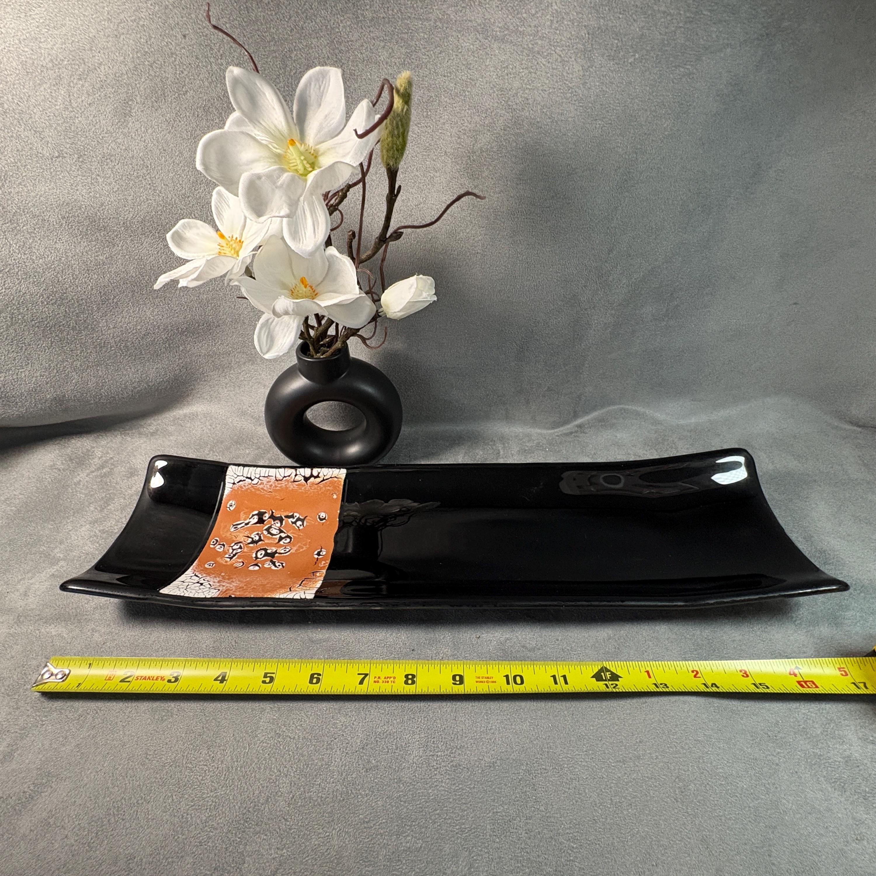 Measuring a graceful 17” long and 5” wide, this piece features an elegant flow of color and form, designed to feel like modern art that just happens to be perfect for sushi night. The glass has been carefully cut, layered, and kiln-fired into a single smooth surface, then shaped and polished for a soft, handmade finish.