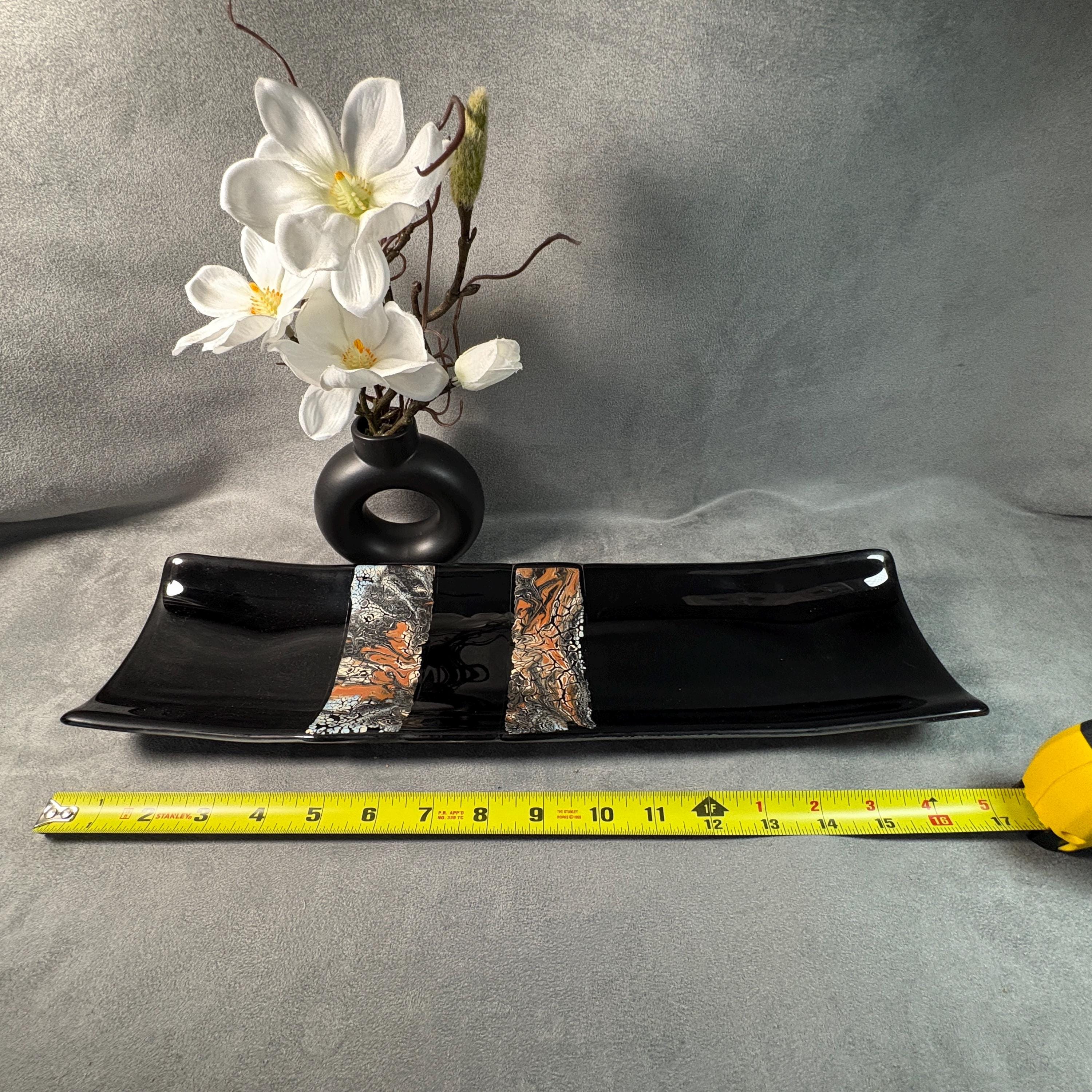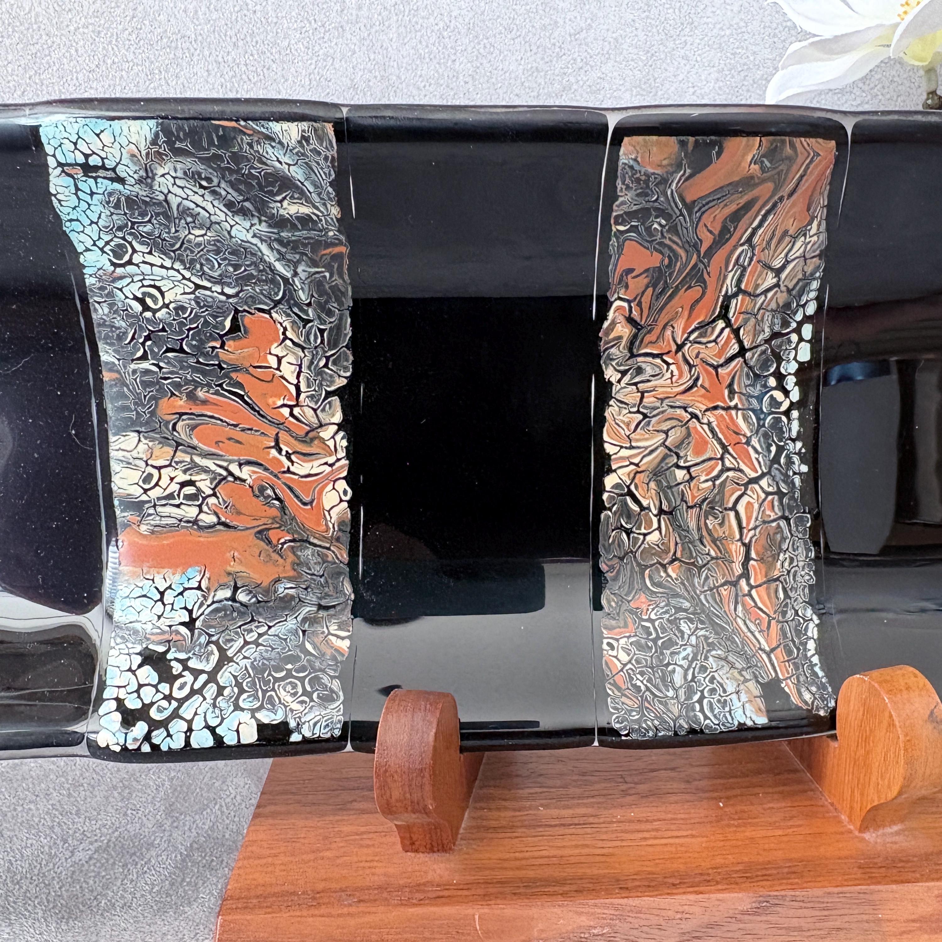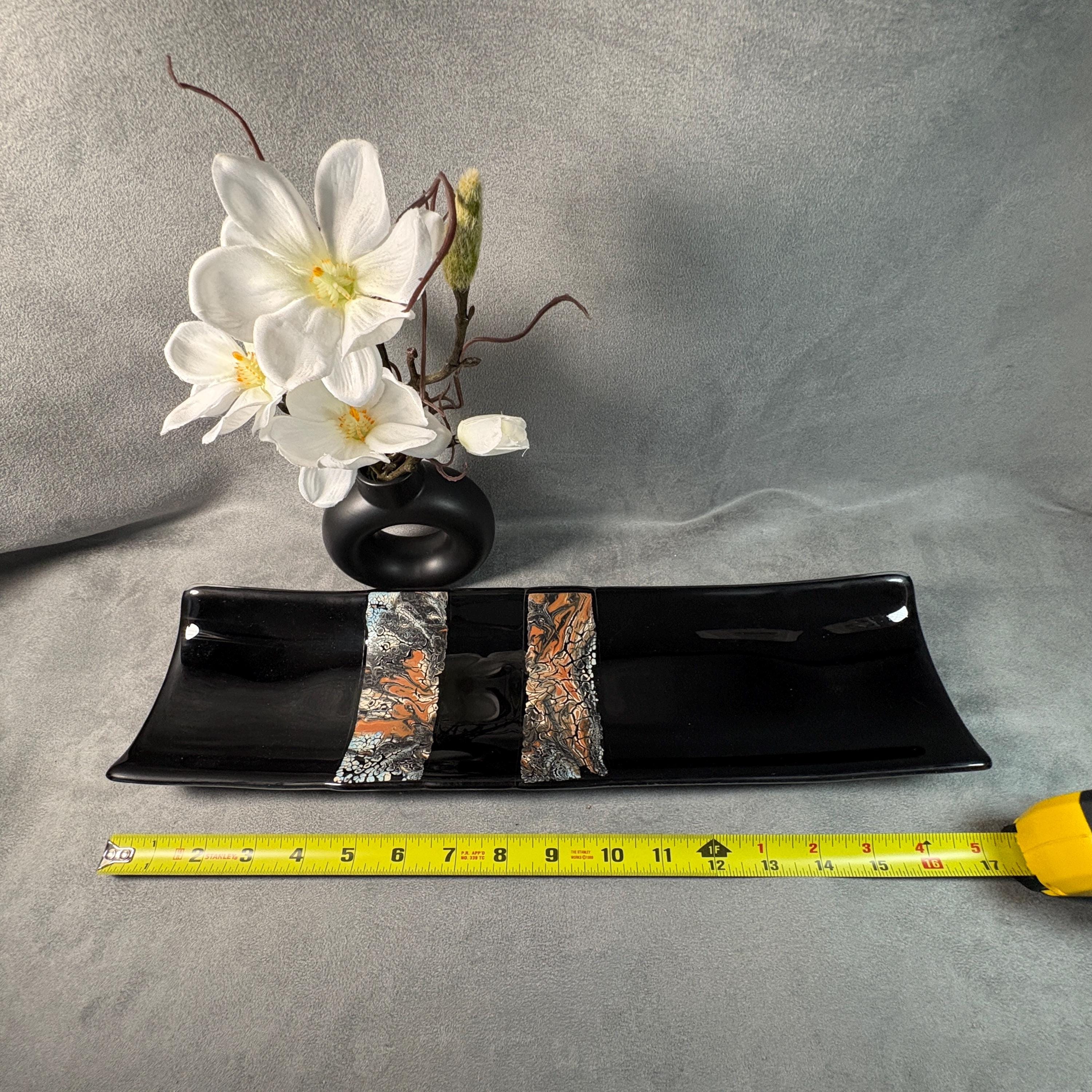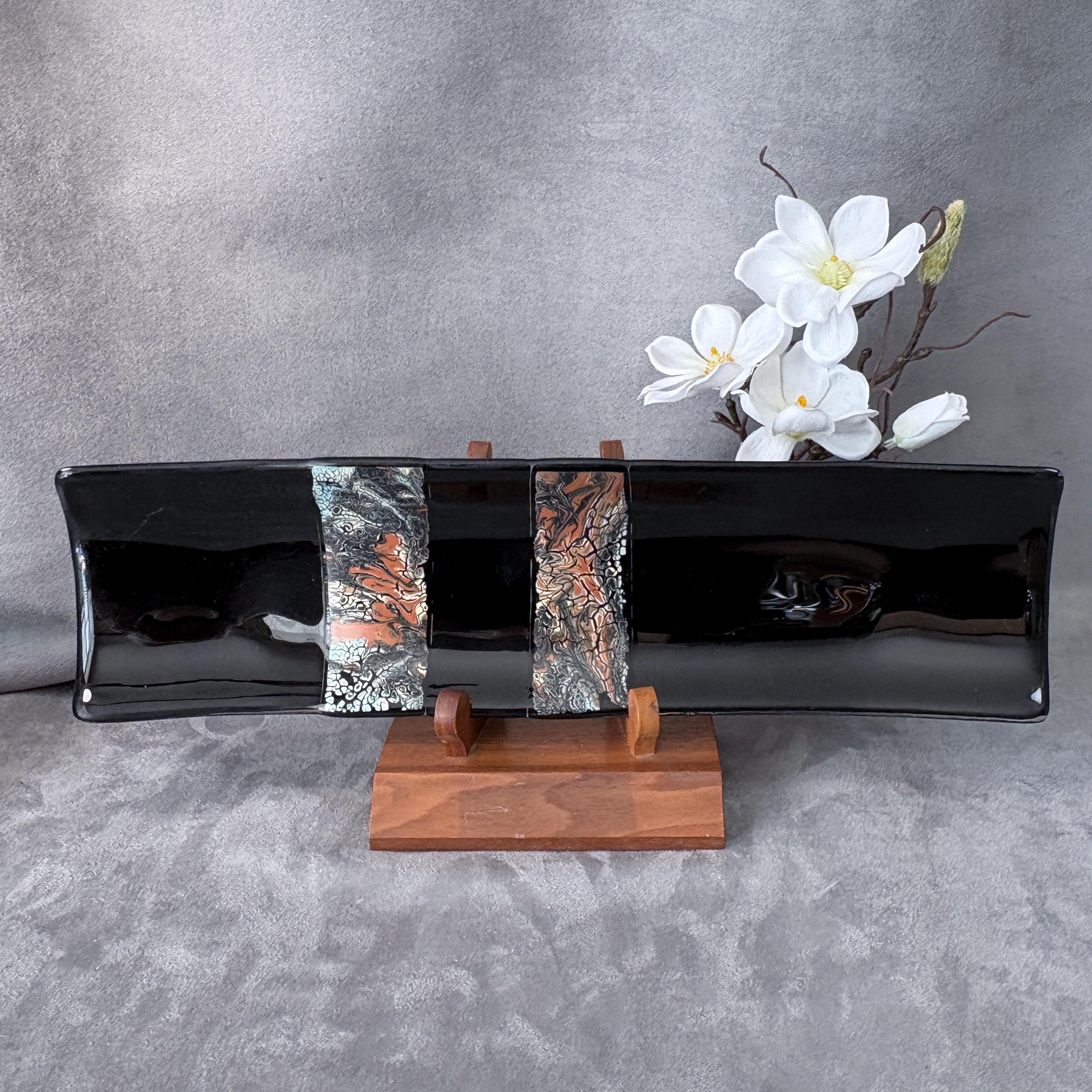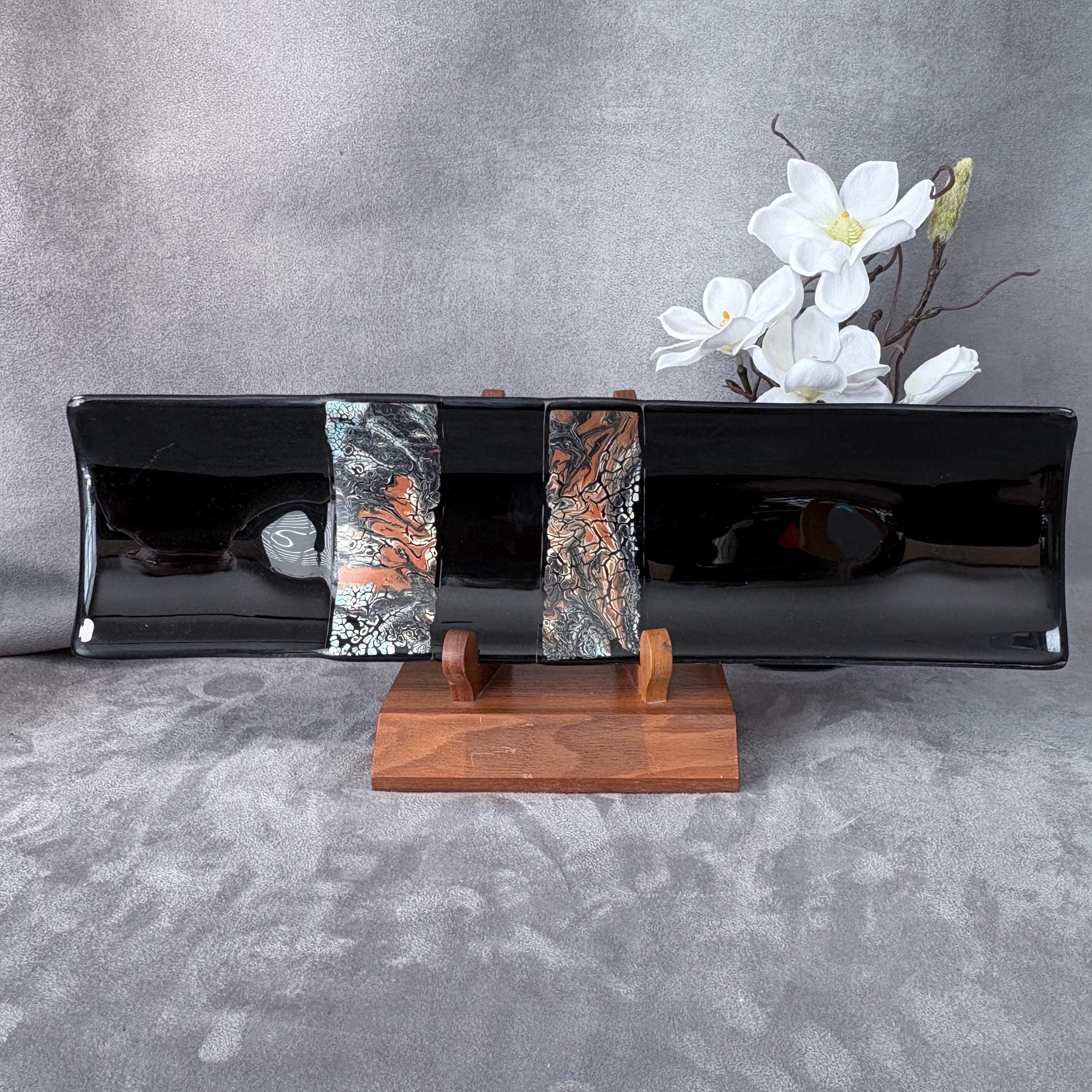 Measuring a graceful 17” long and 5” wide, this piece features an elegant flow of color and form, designed to feel like modern art that just happens to be perfect for sushi night. The glass has been carefully cut, layered, and kiln-fired into a single smooth surface, then shaped and polished for a soft, handmade finish.