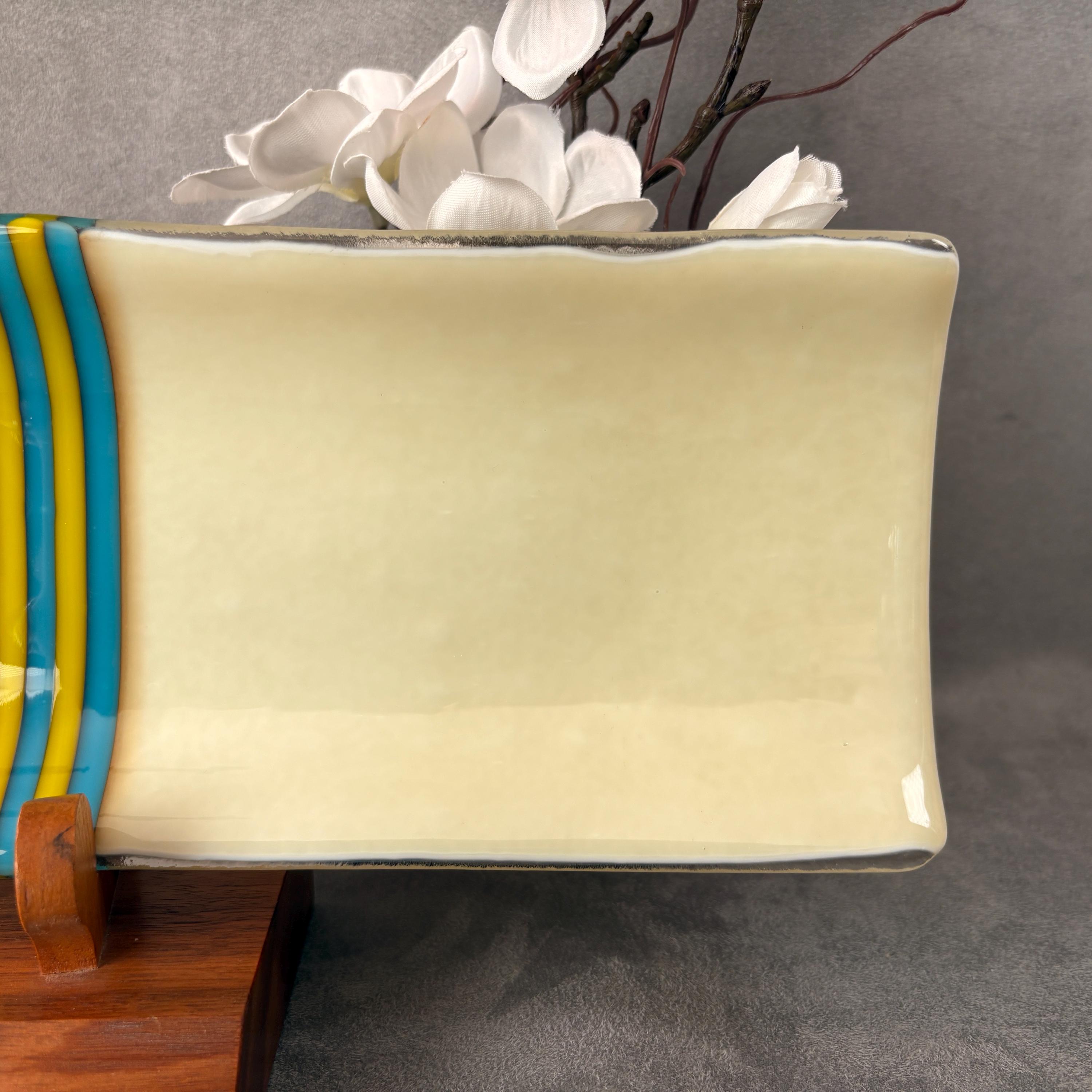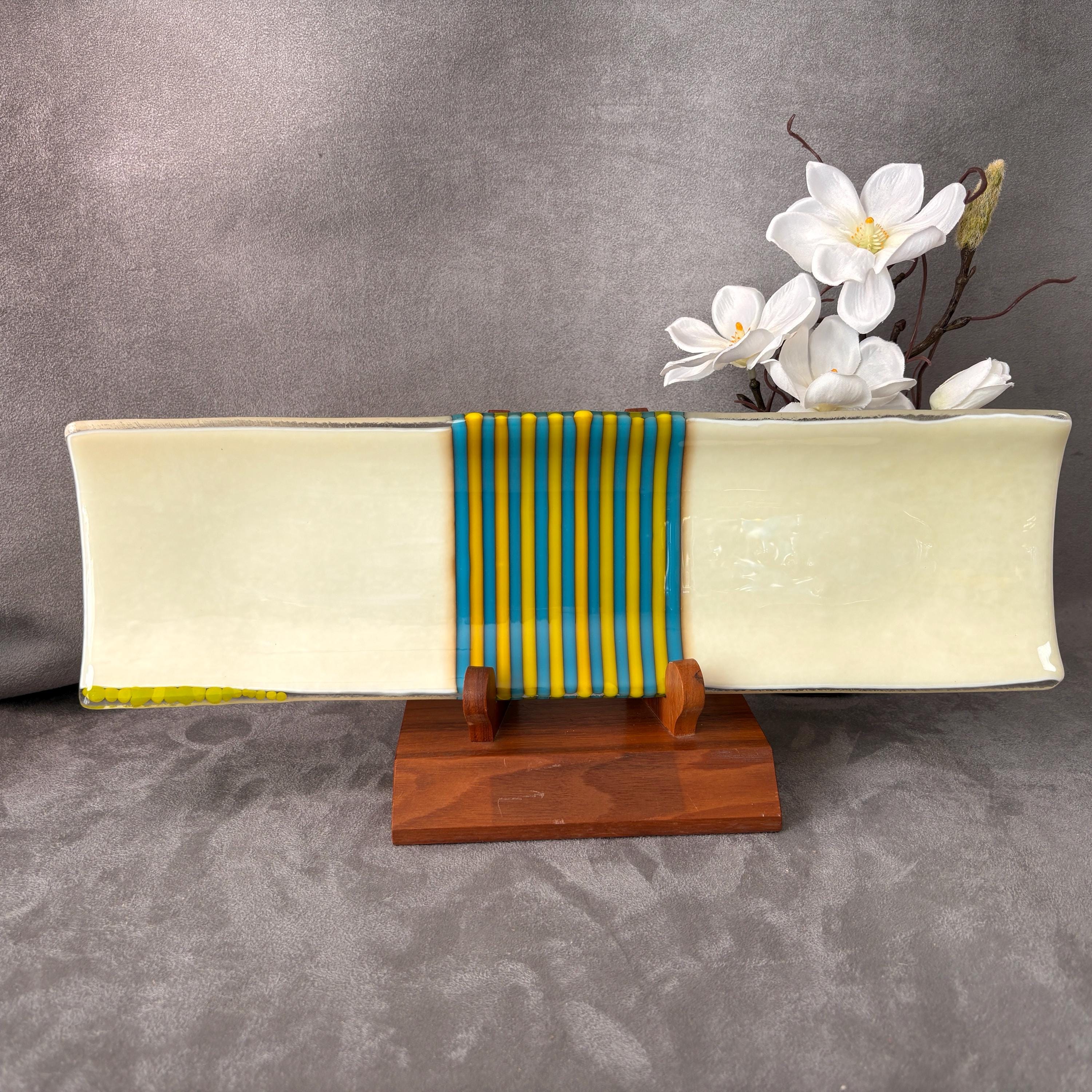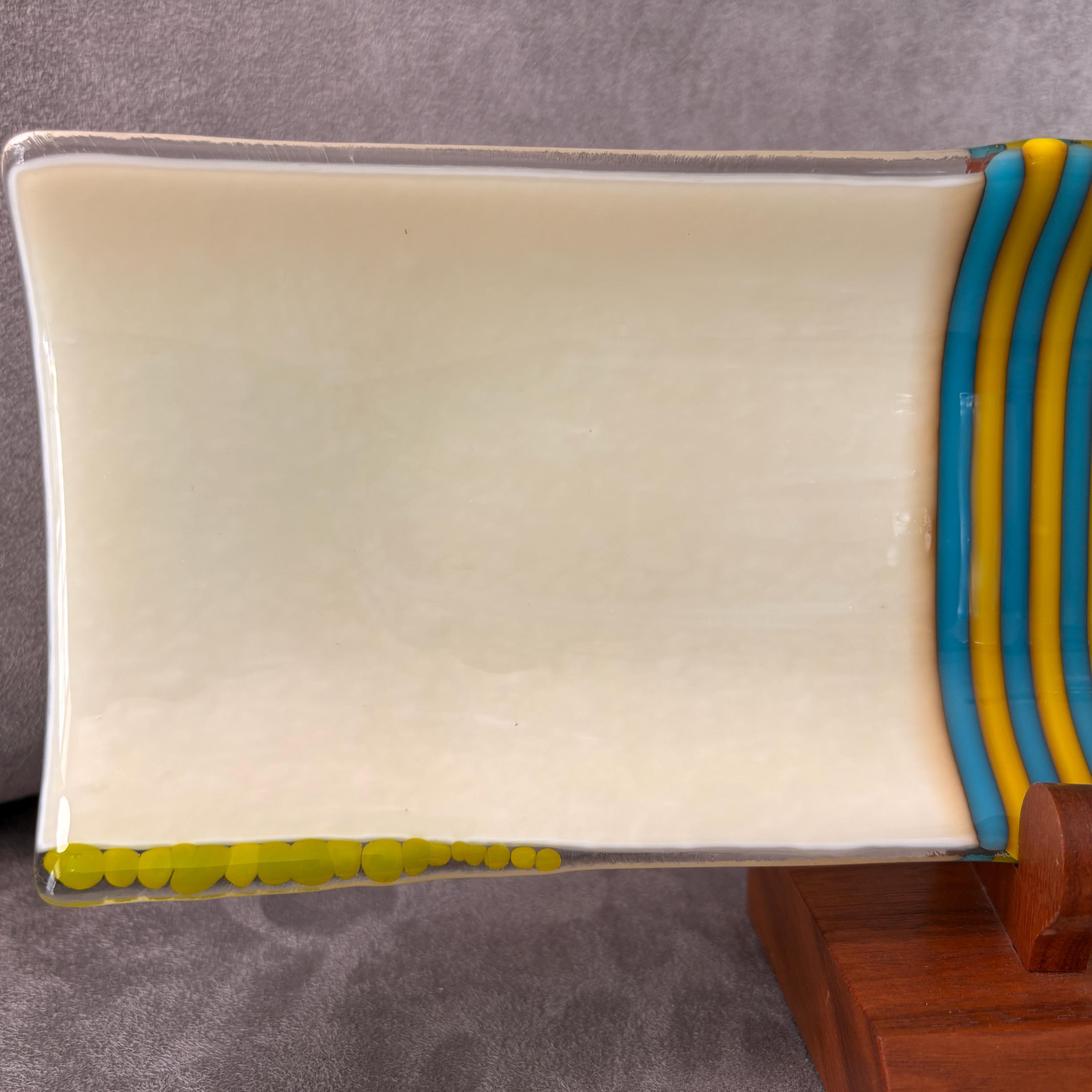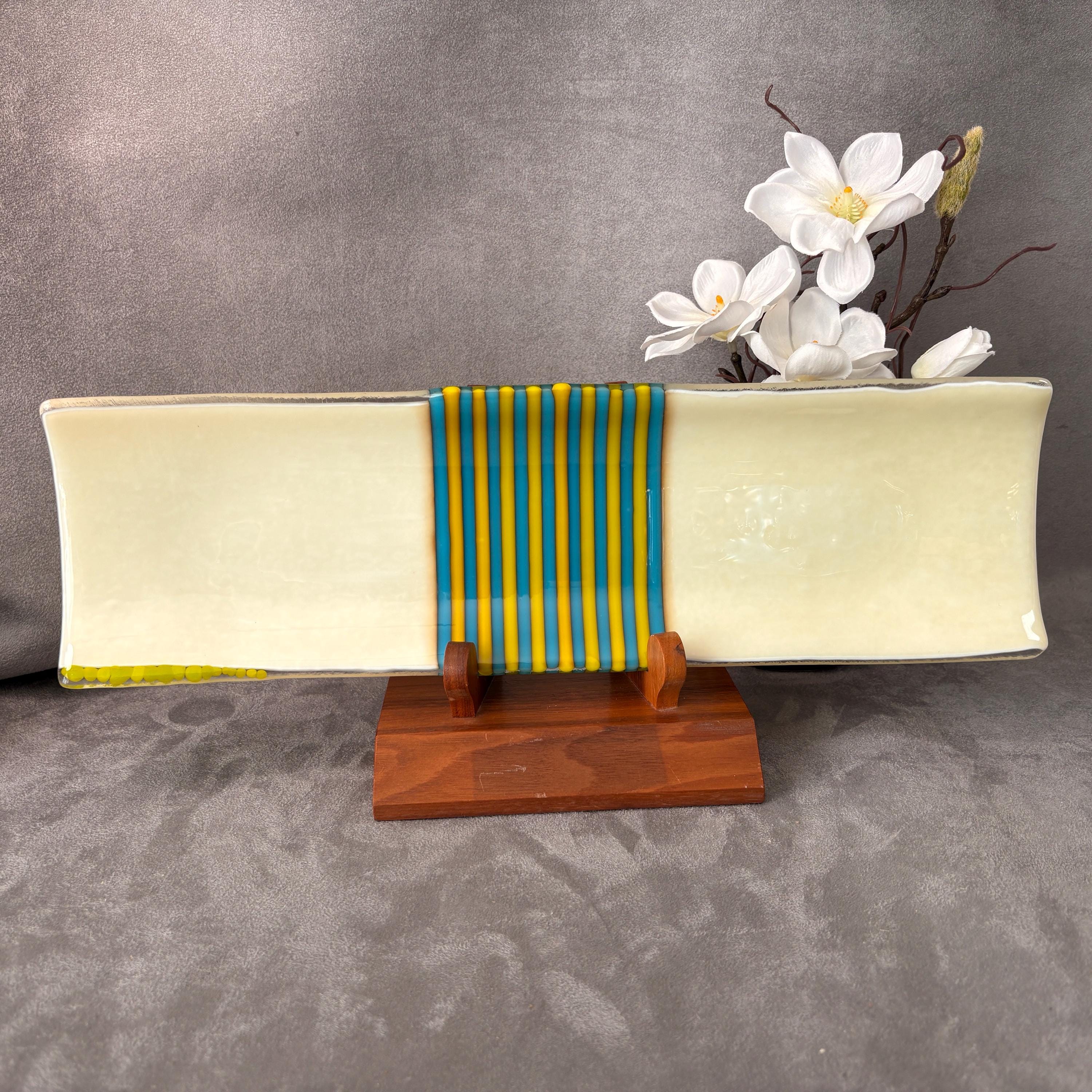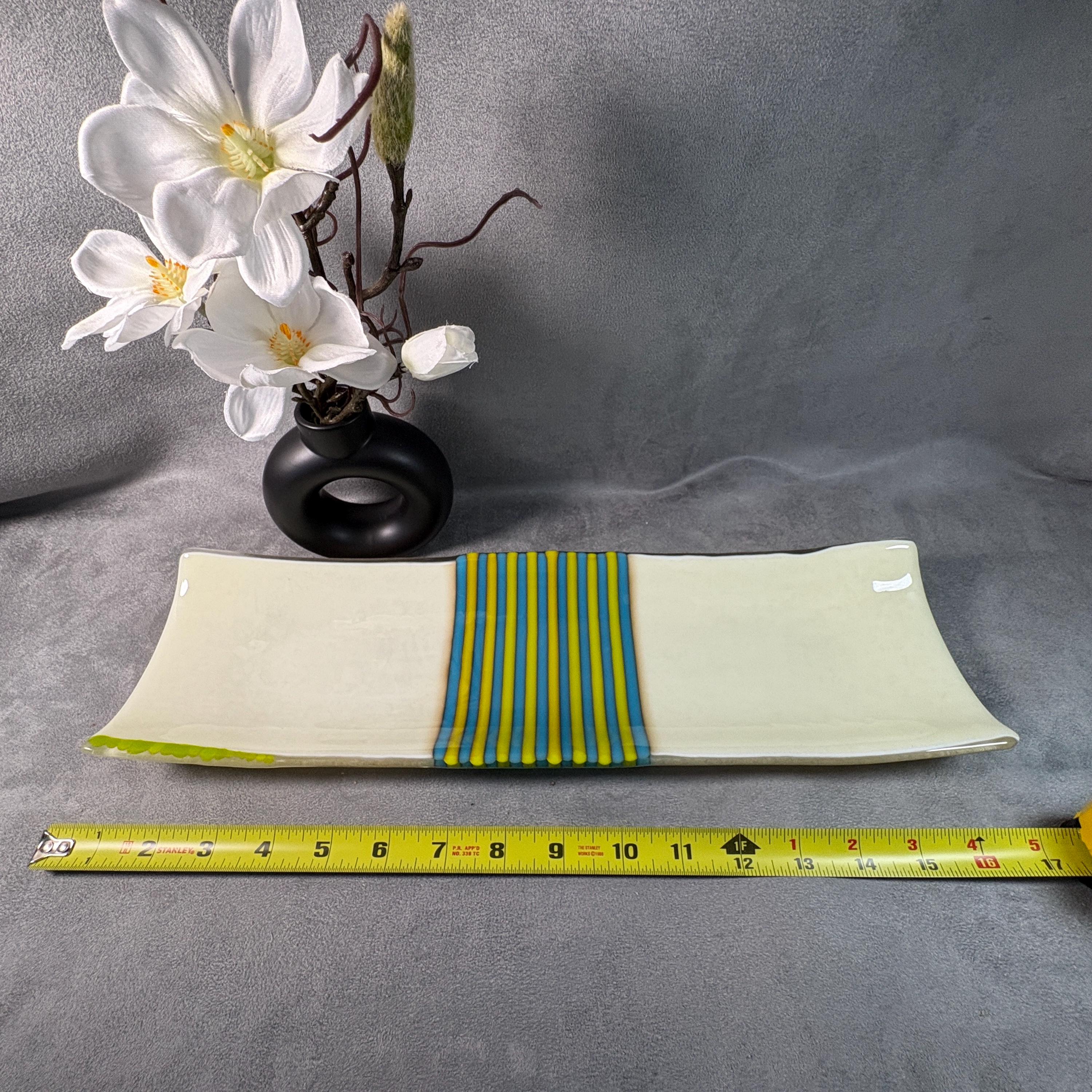 Measuring a graceful 17” long and 5” wide, this piece features an elegant flow of color and form, designed to feel like modern art that just happens to be perfect for sushi night. The glass has been carefully cut, layered, and kiln-fired into a single smooth surface, then shaped and polished for a soft, handmade finish.