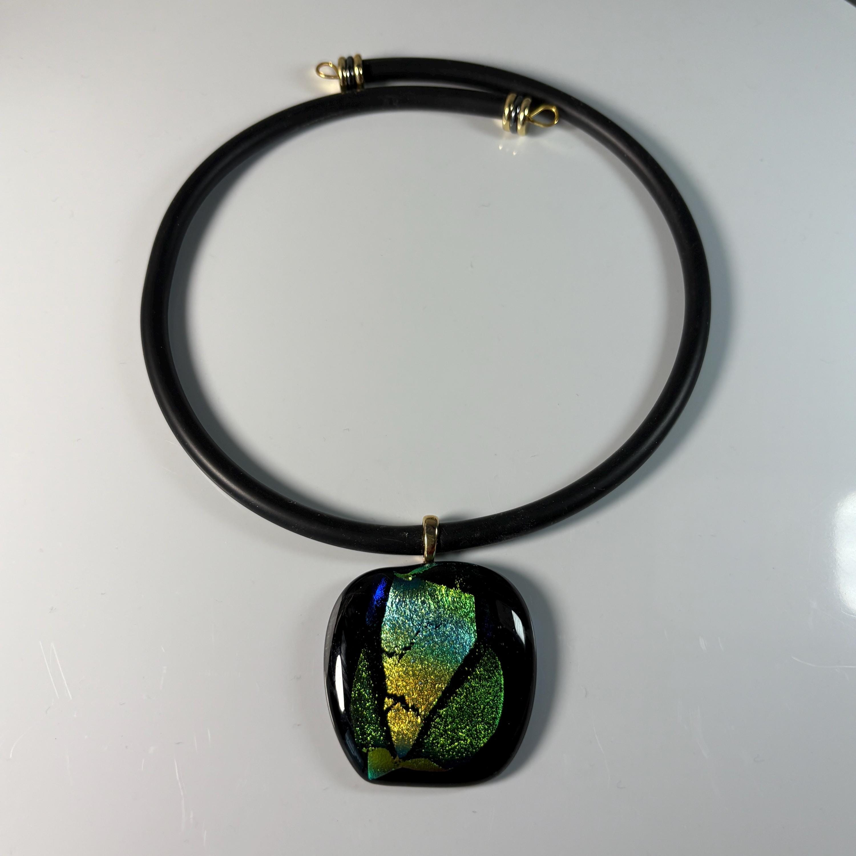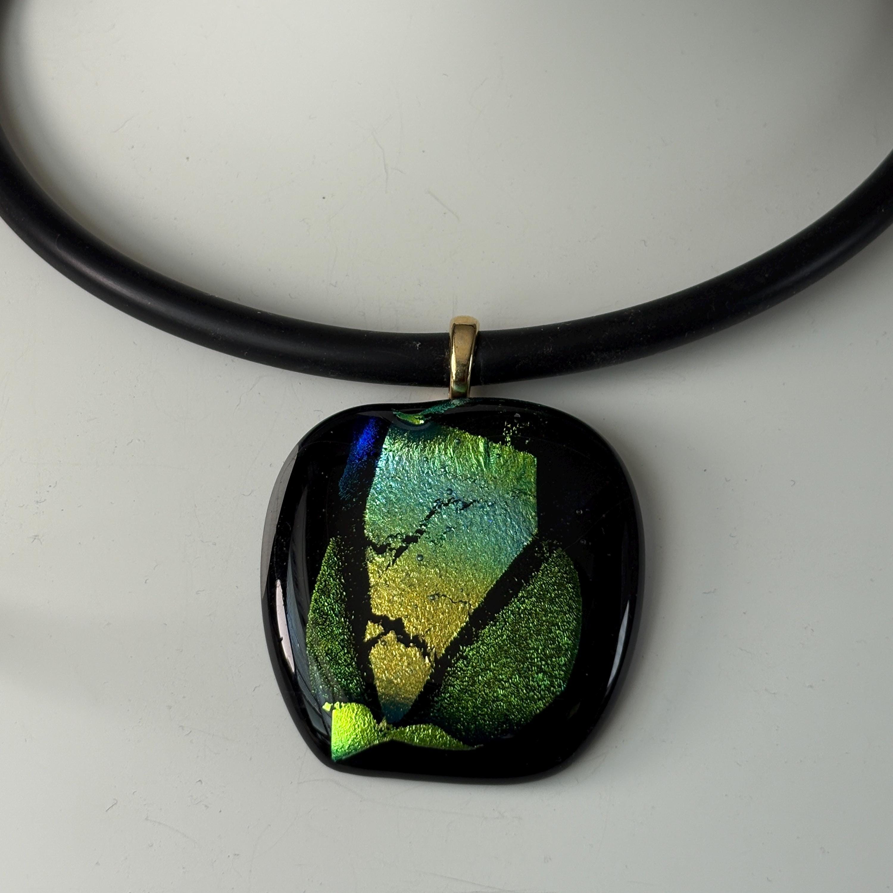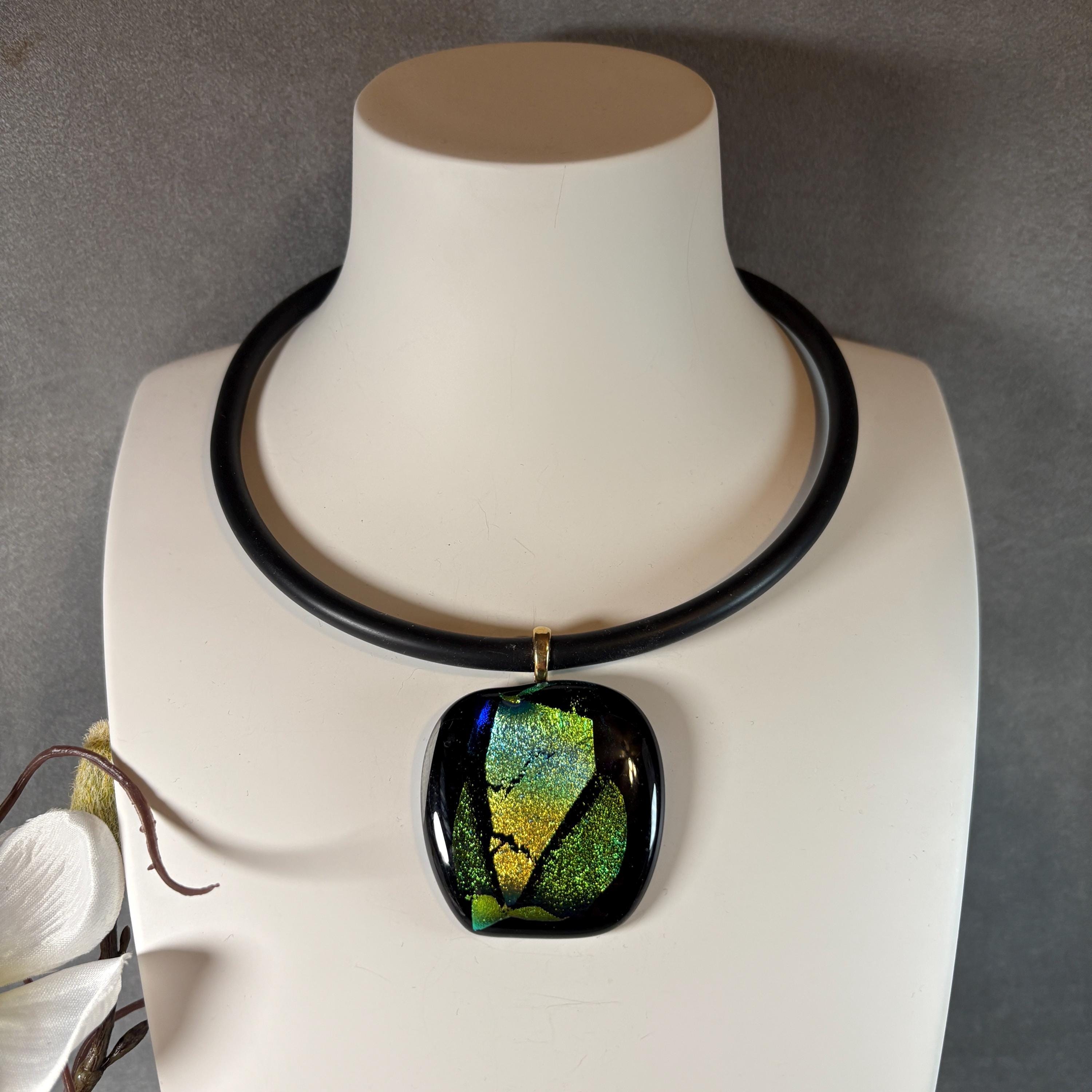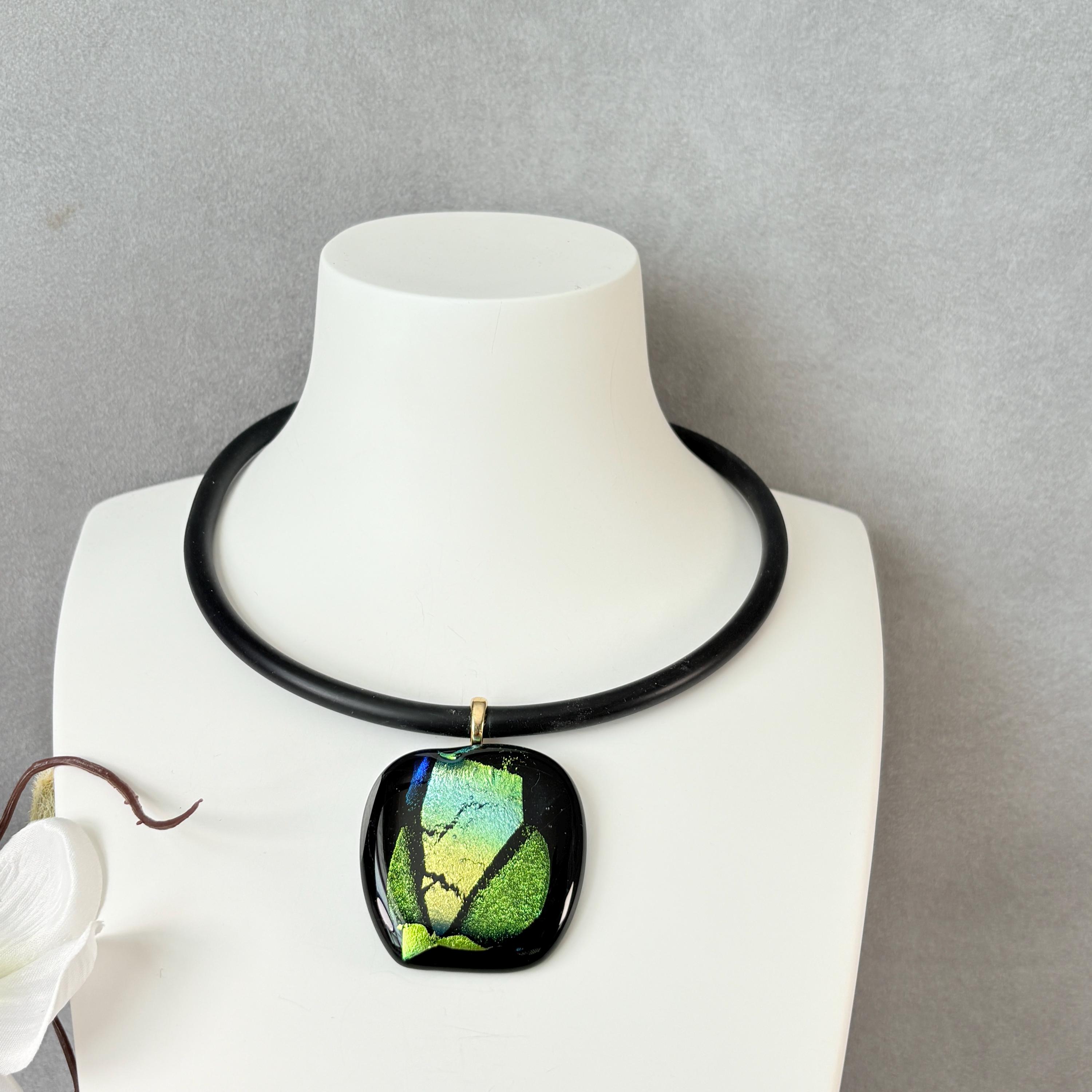 This choker necklace features a focal handmade fused glass pendant with a green dichroic and black glass design. The pendant is one-of-a-kind, with natural variations in color pattern and form. No two will ever be exactly alike. The pendant rests at the collarbone, creating a clean, modern silhouette. Simple enough for everyday wear, yet bold enough to stand out as a small statement piece, at any special occasion or event.