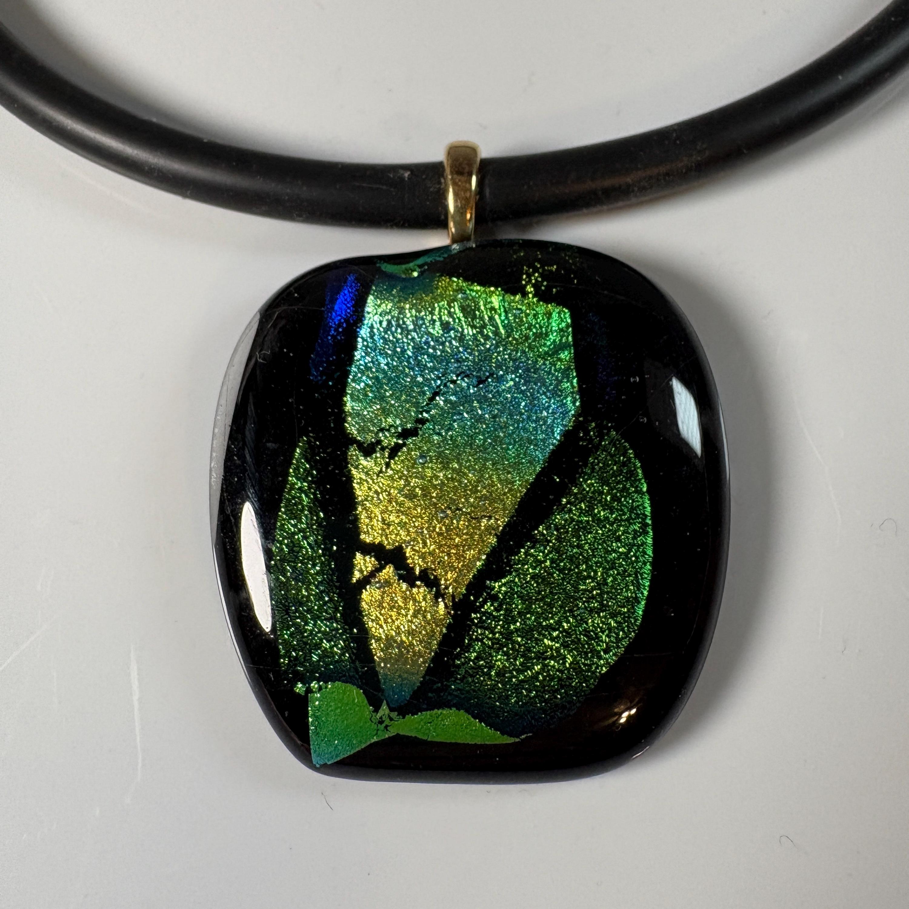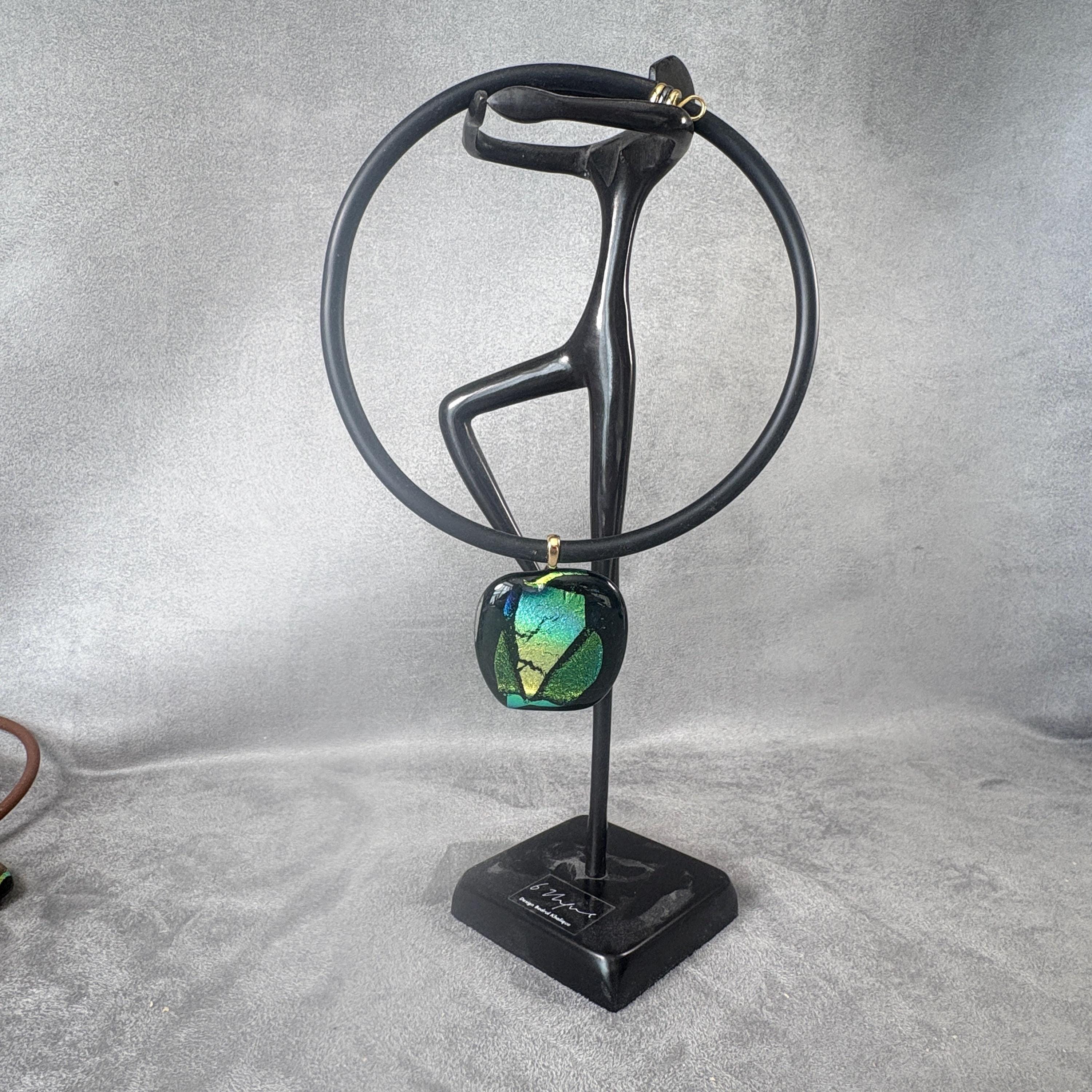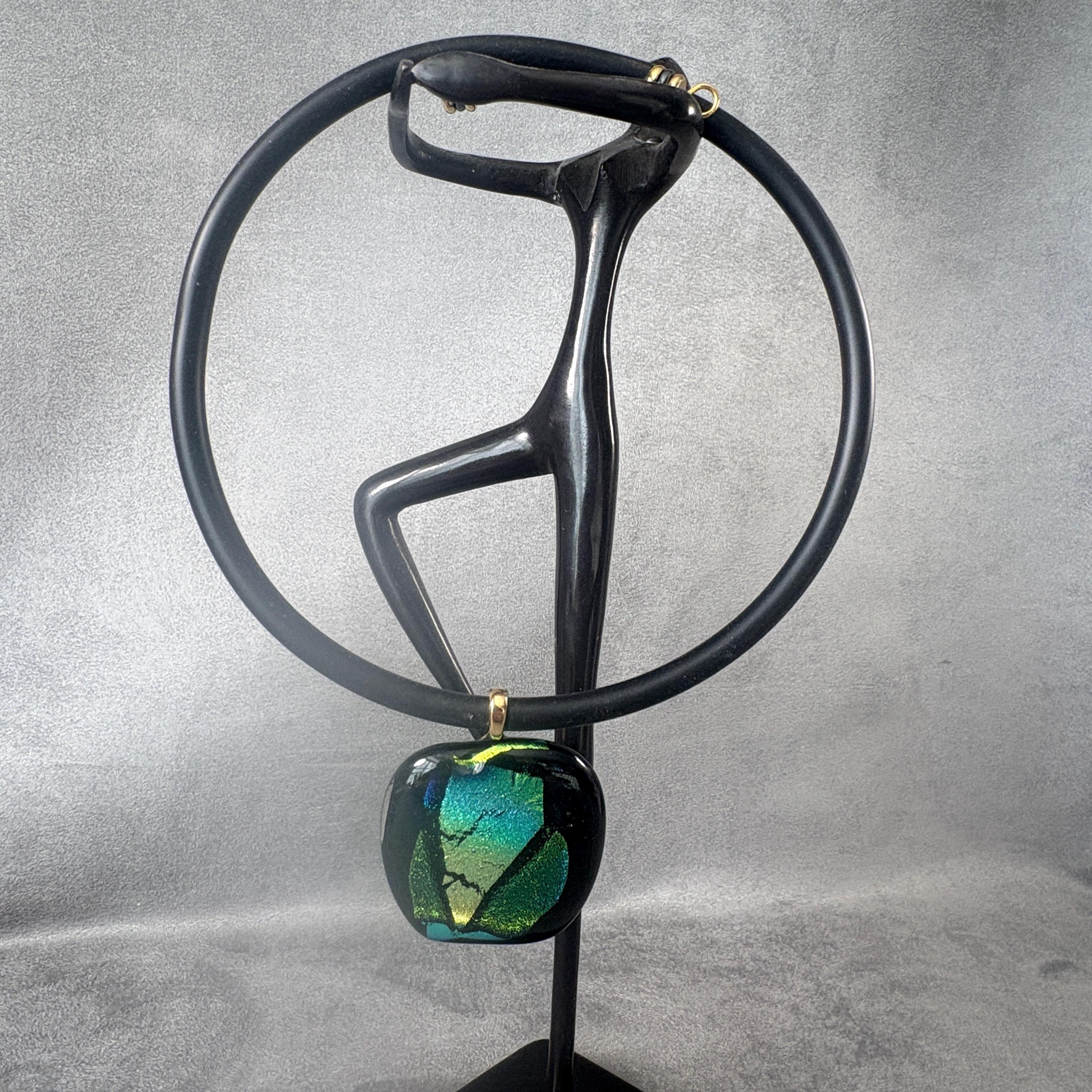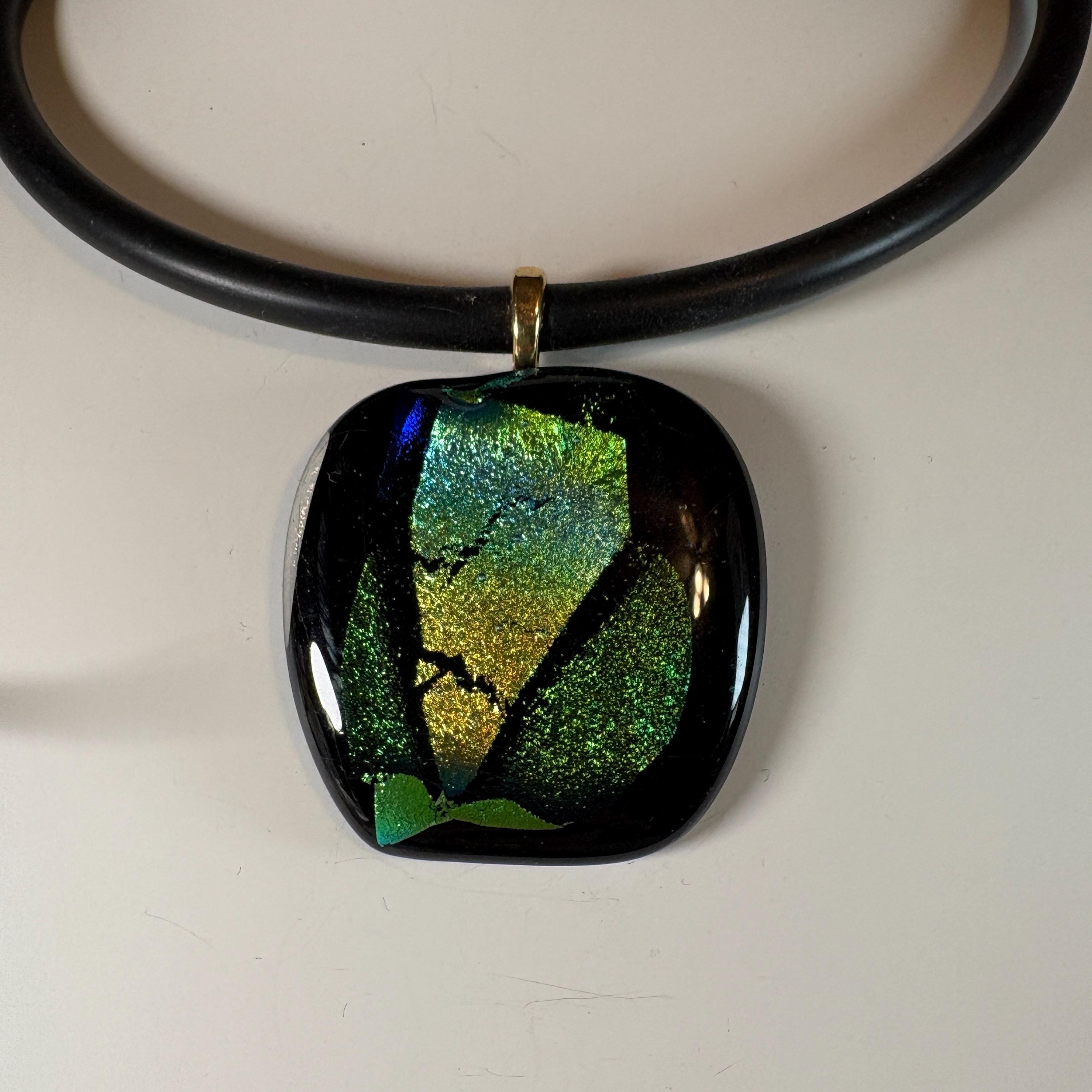 This choker necklace features a focal handmade fused glass pendant with a green dichroic and black glass design. The pendant is one-of-a-kind, with natural variations in color pattern and form. No two will ever be exactly alike. The pendant rests at the collarbone, creating a clean, modern silhouette. Simple enough for everyday wear, yet bold enough to stand out as a small statement piece, at any special occasion or event.