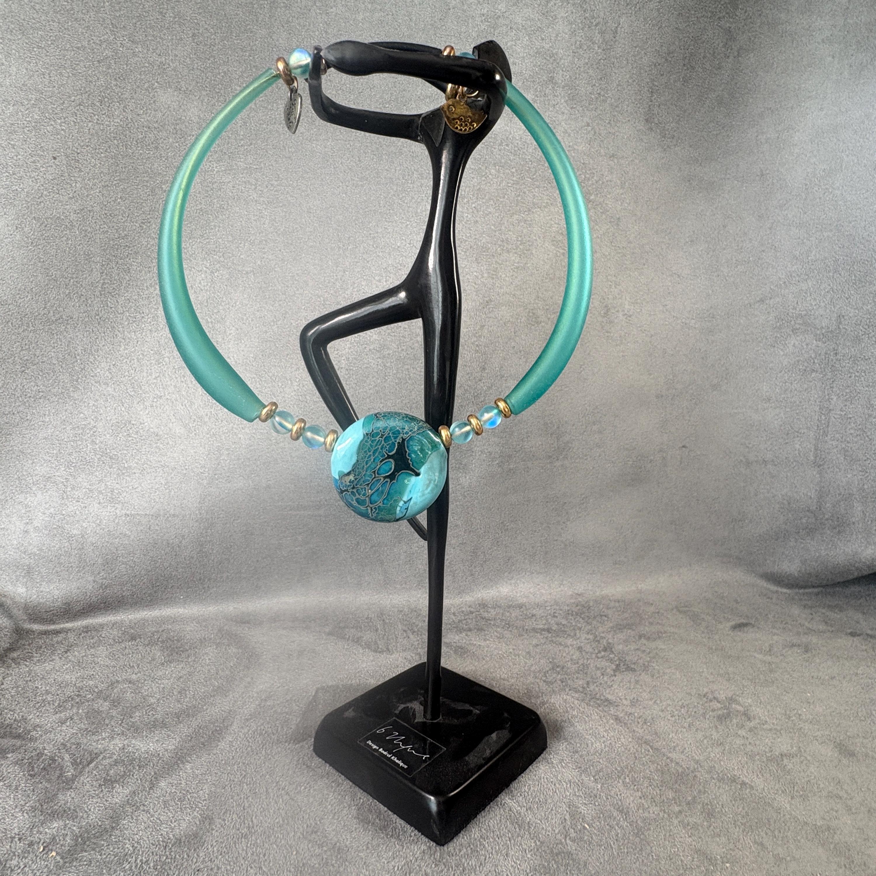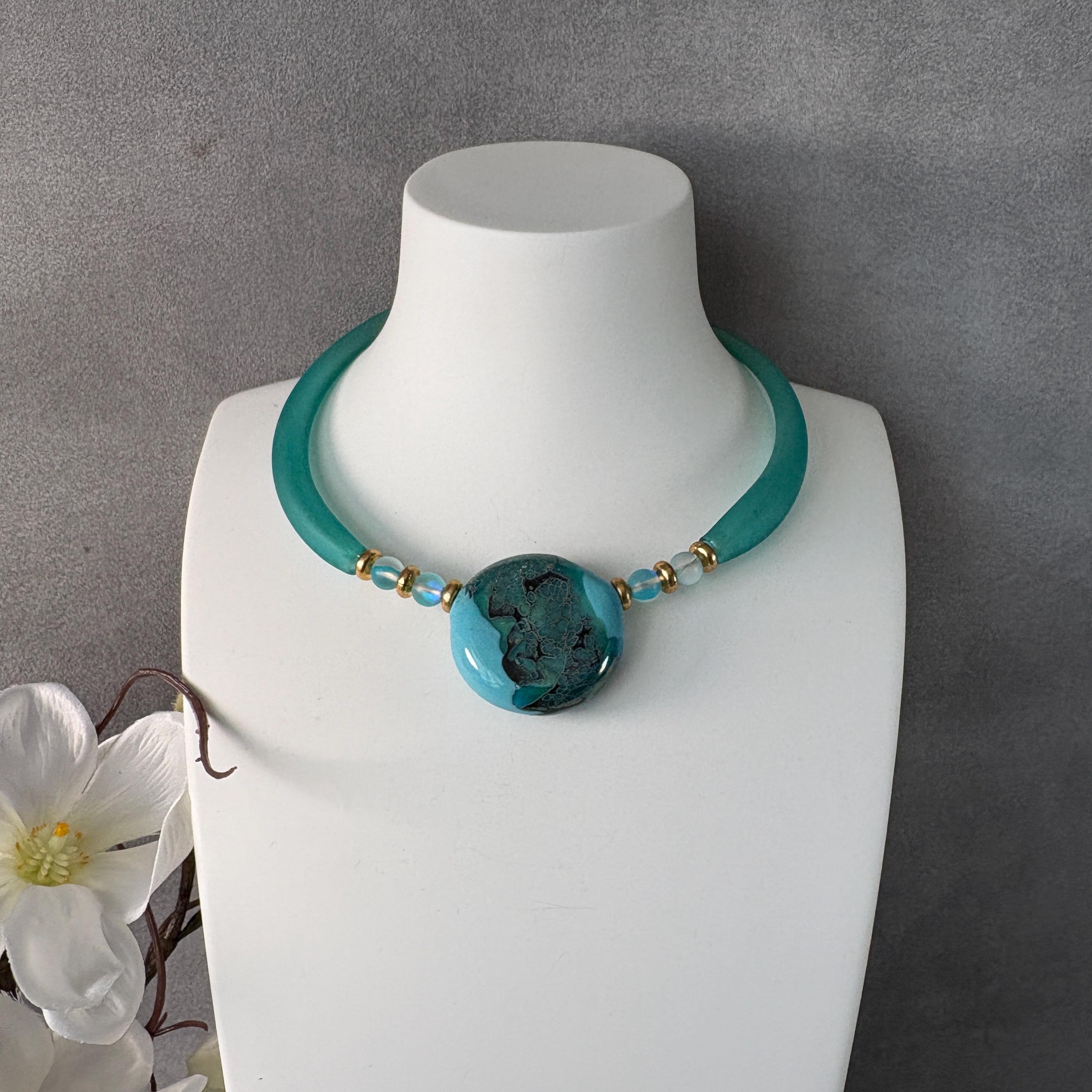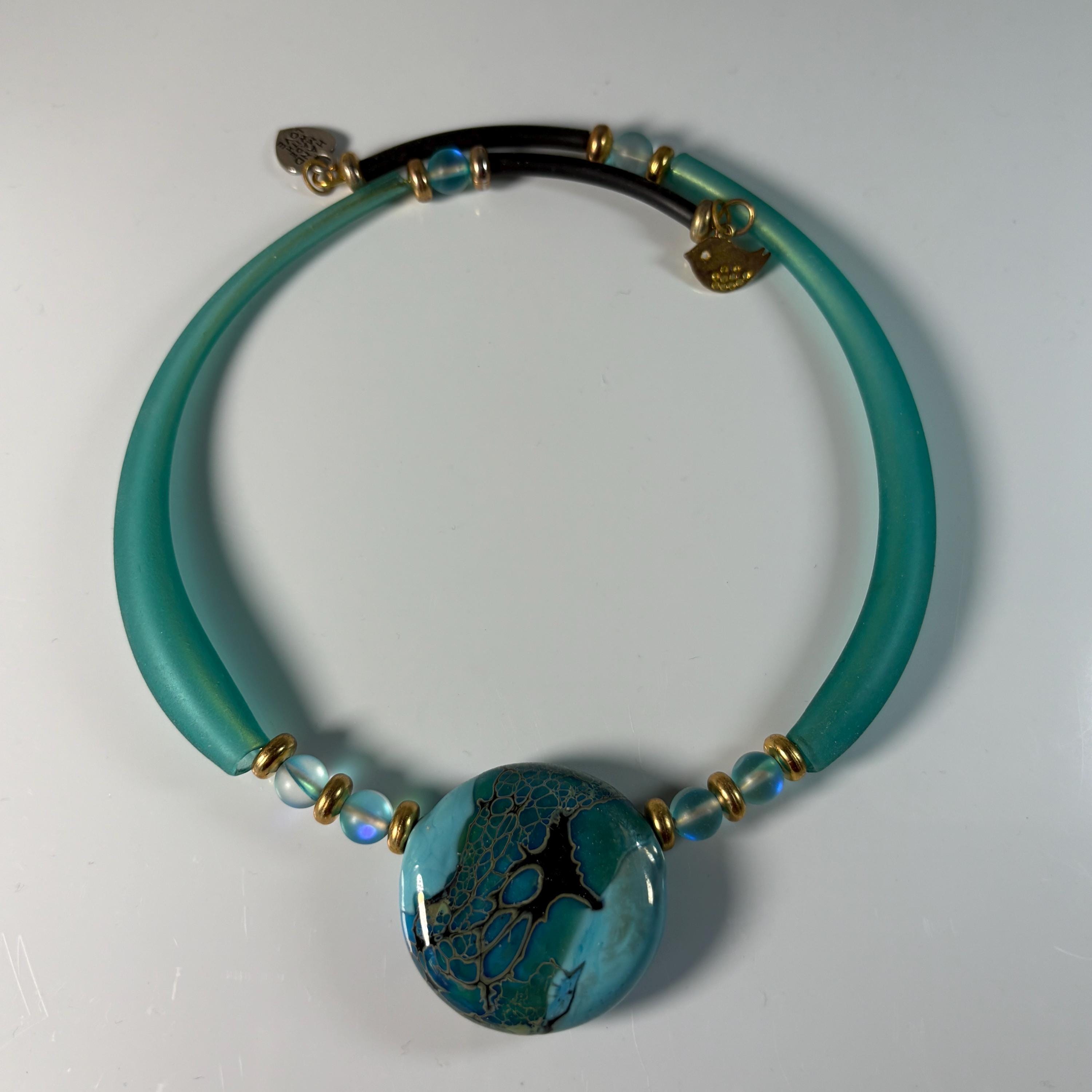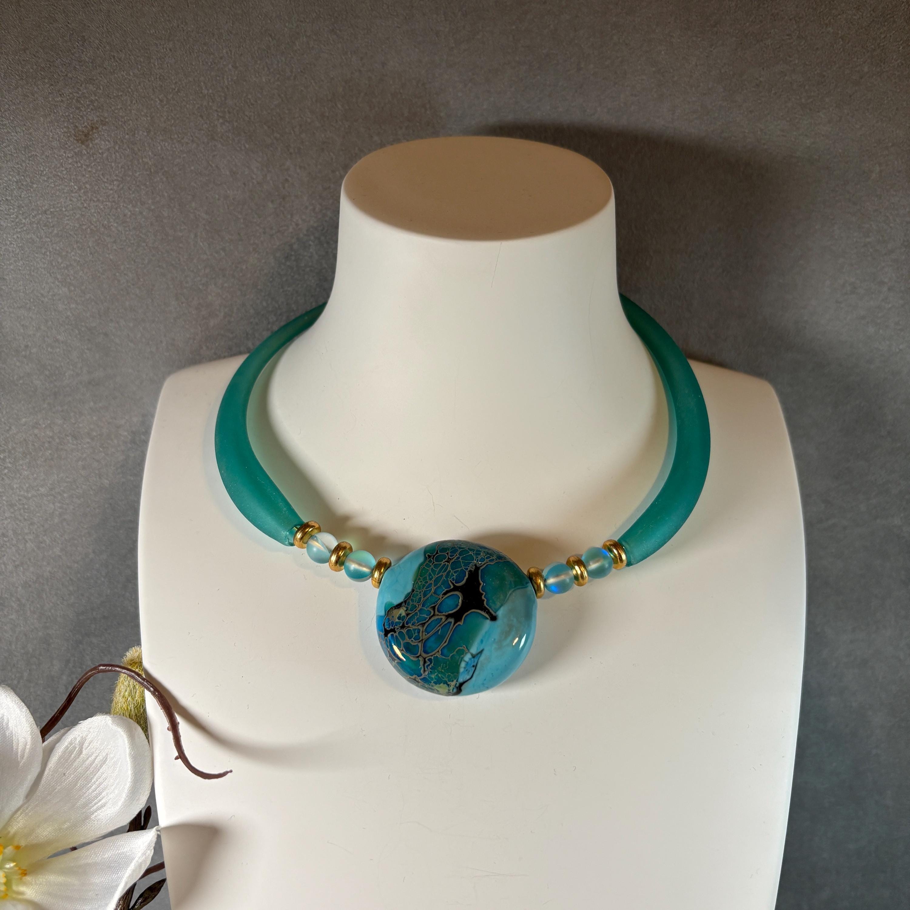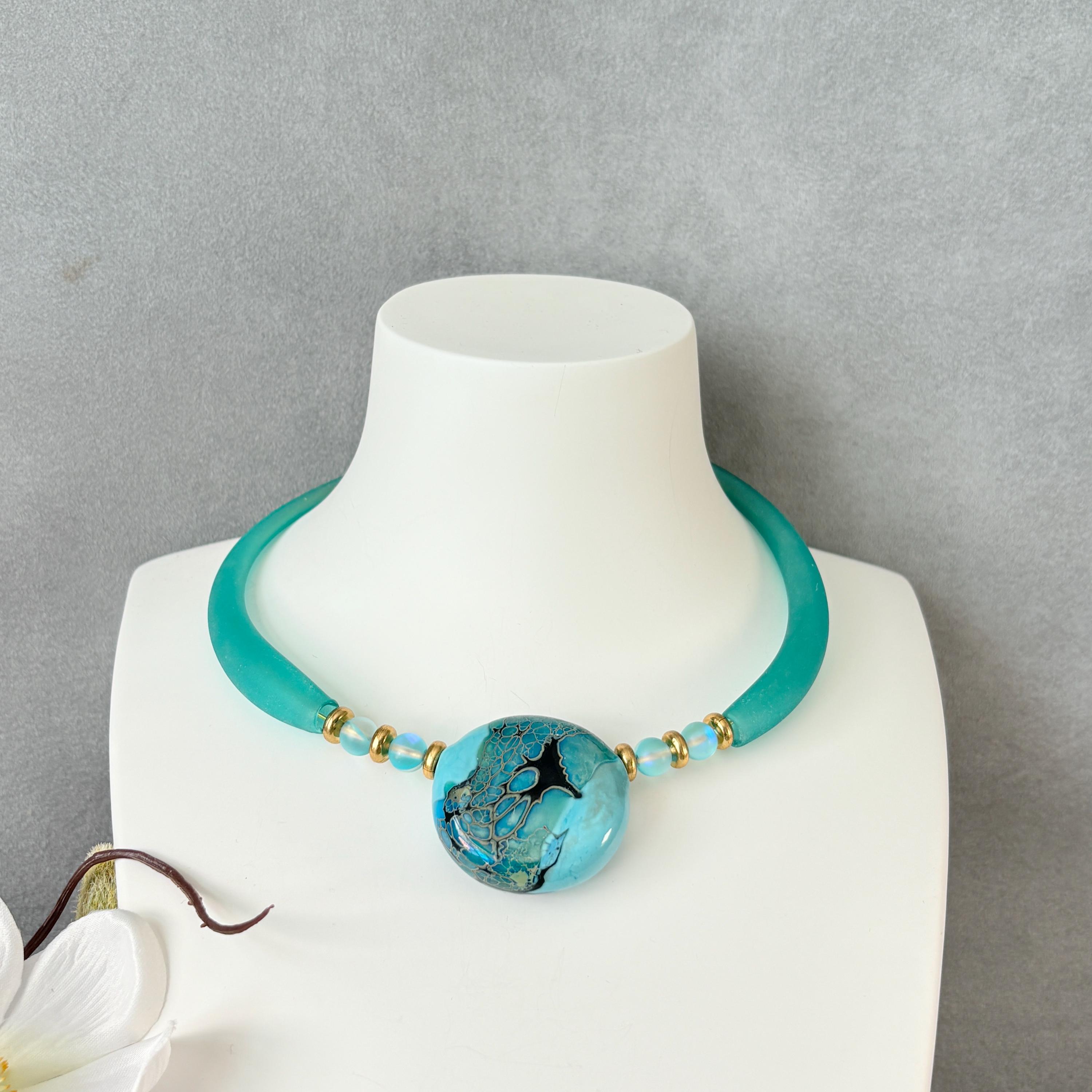 This choker necklace features a focal handmade lampworked glass pendant with a blue and black glass design. The pendant is one-of-a-kind, with natural variations in color pattern and form. No two will ever be exactly alike. The pendant rests at the collarbone, creating a clean, modern silhouette. Simple enough for everyday wear, yet bold enough to stand out as a small statement piece, at any special occasion or event.
