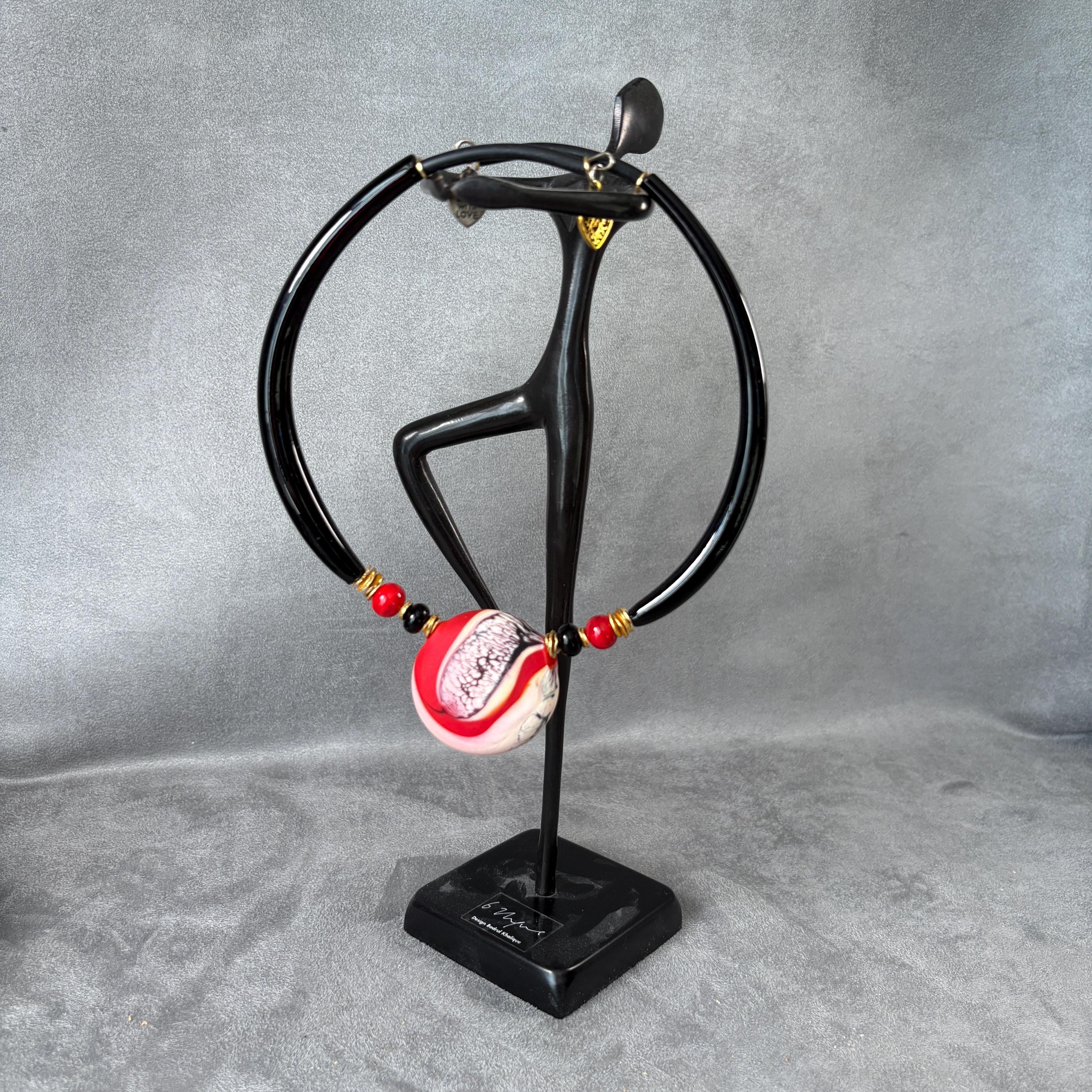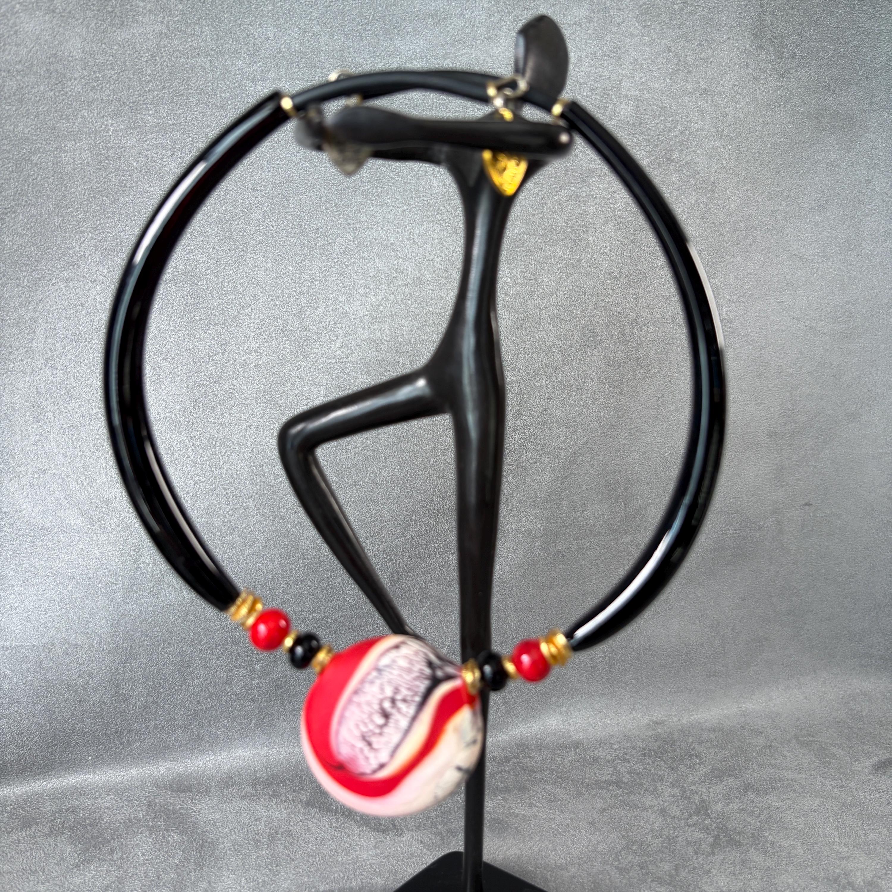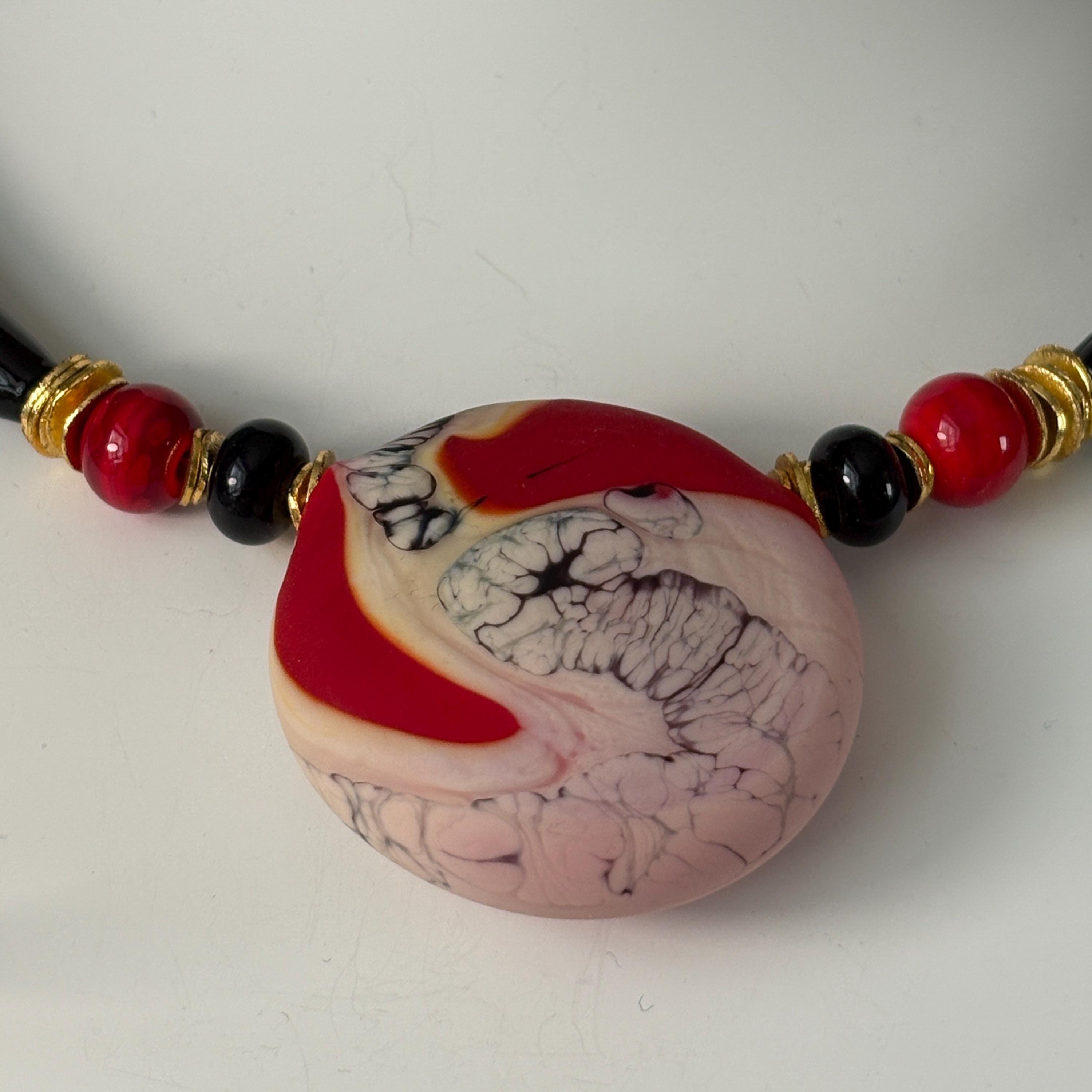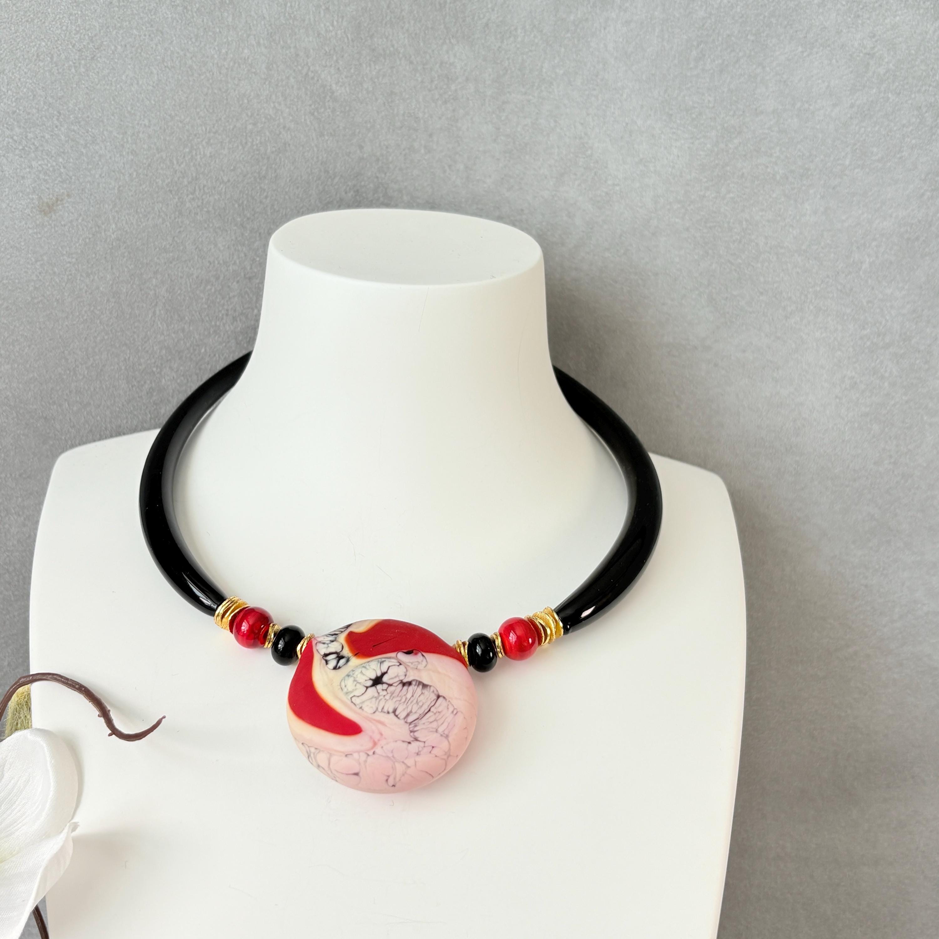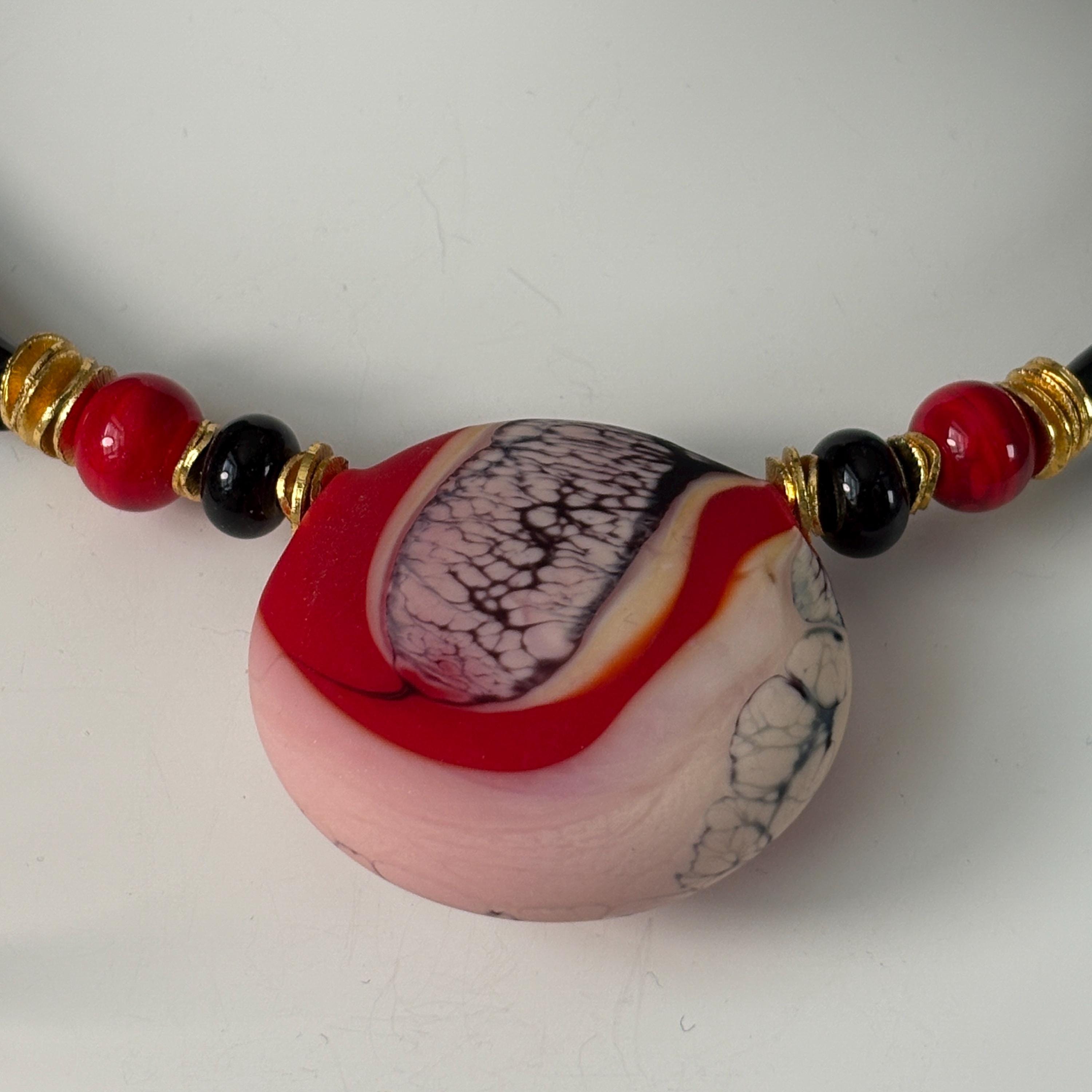 This choker necklace features a focal handmade lampworked glass pendant with a red swirl glass design. The pendant is one-of-a-kind, with natural variations in color pattern and form. No two will ever be exactly alike. The pendant rests at the collarbone, creating a clean, modern silhouette. Simple enough for everyday wear, yet bold enough to stand out as a small statement piece, at any special occasion or event.