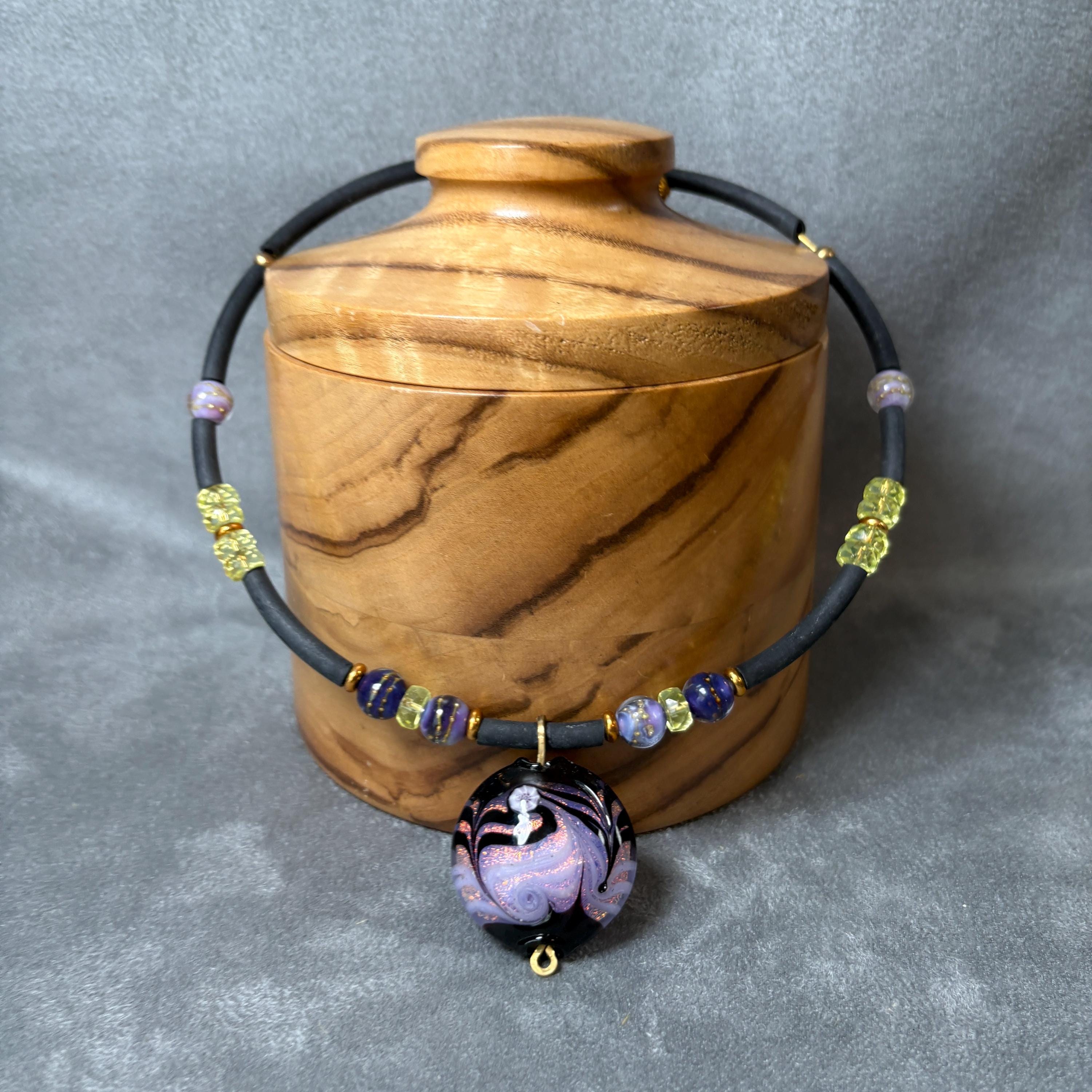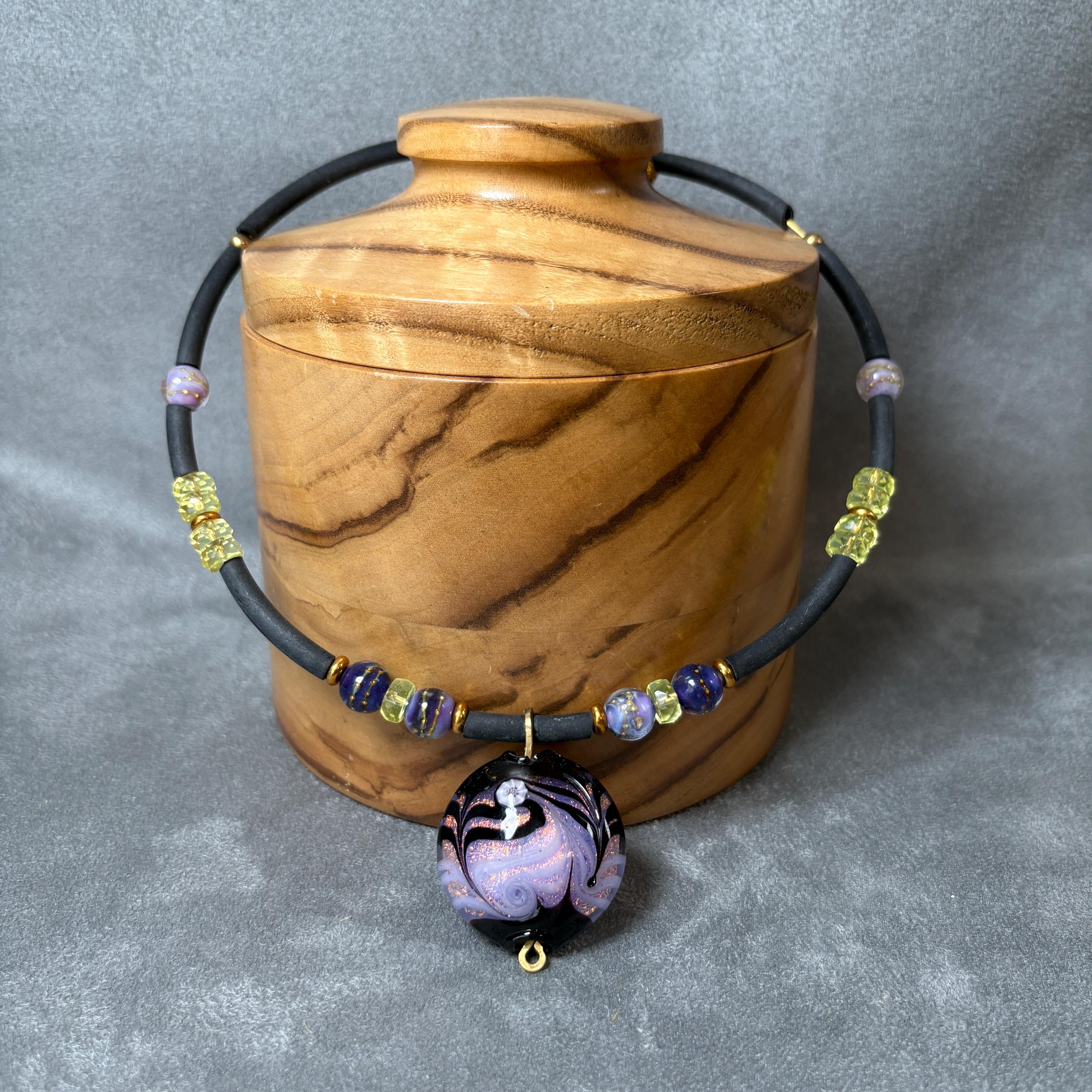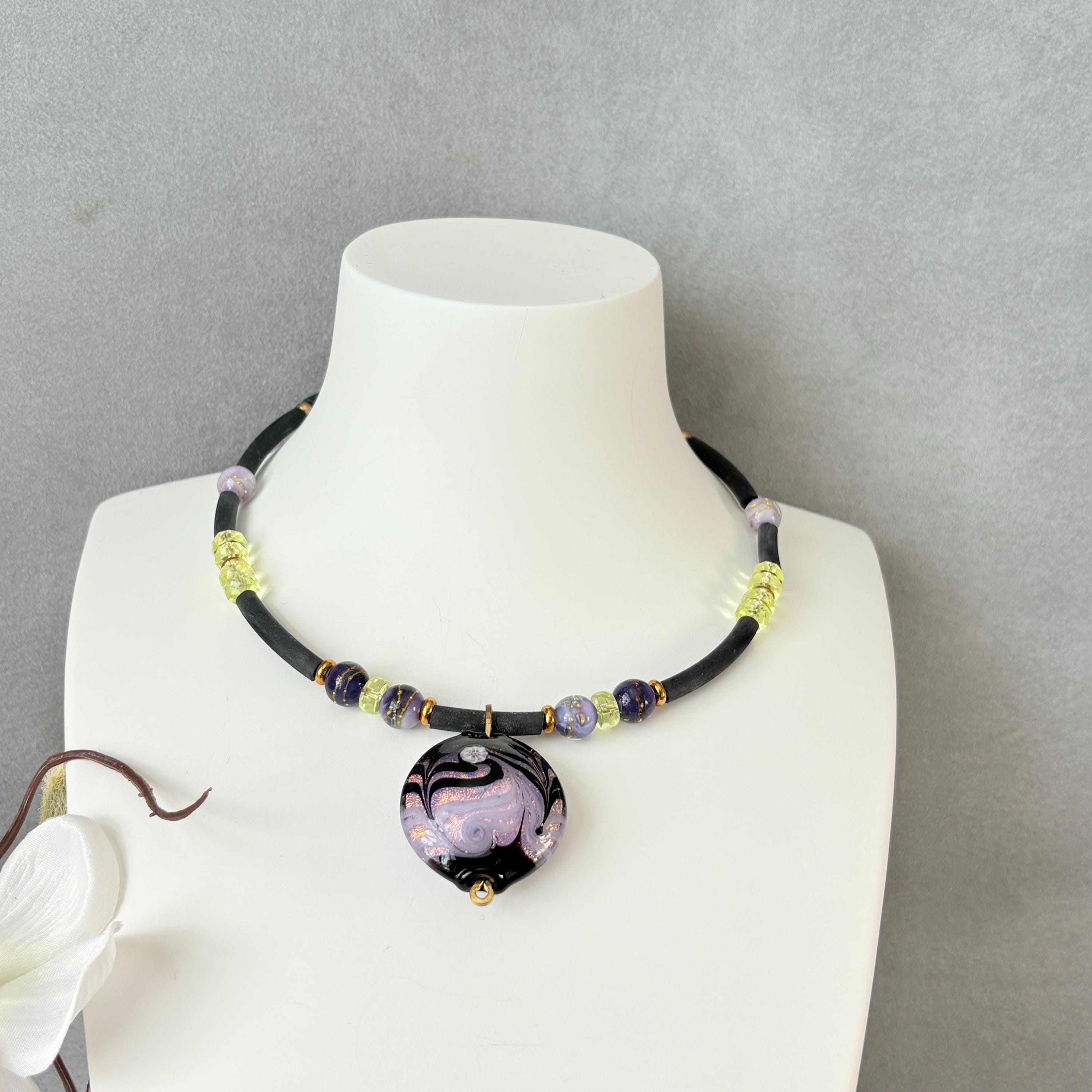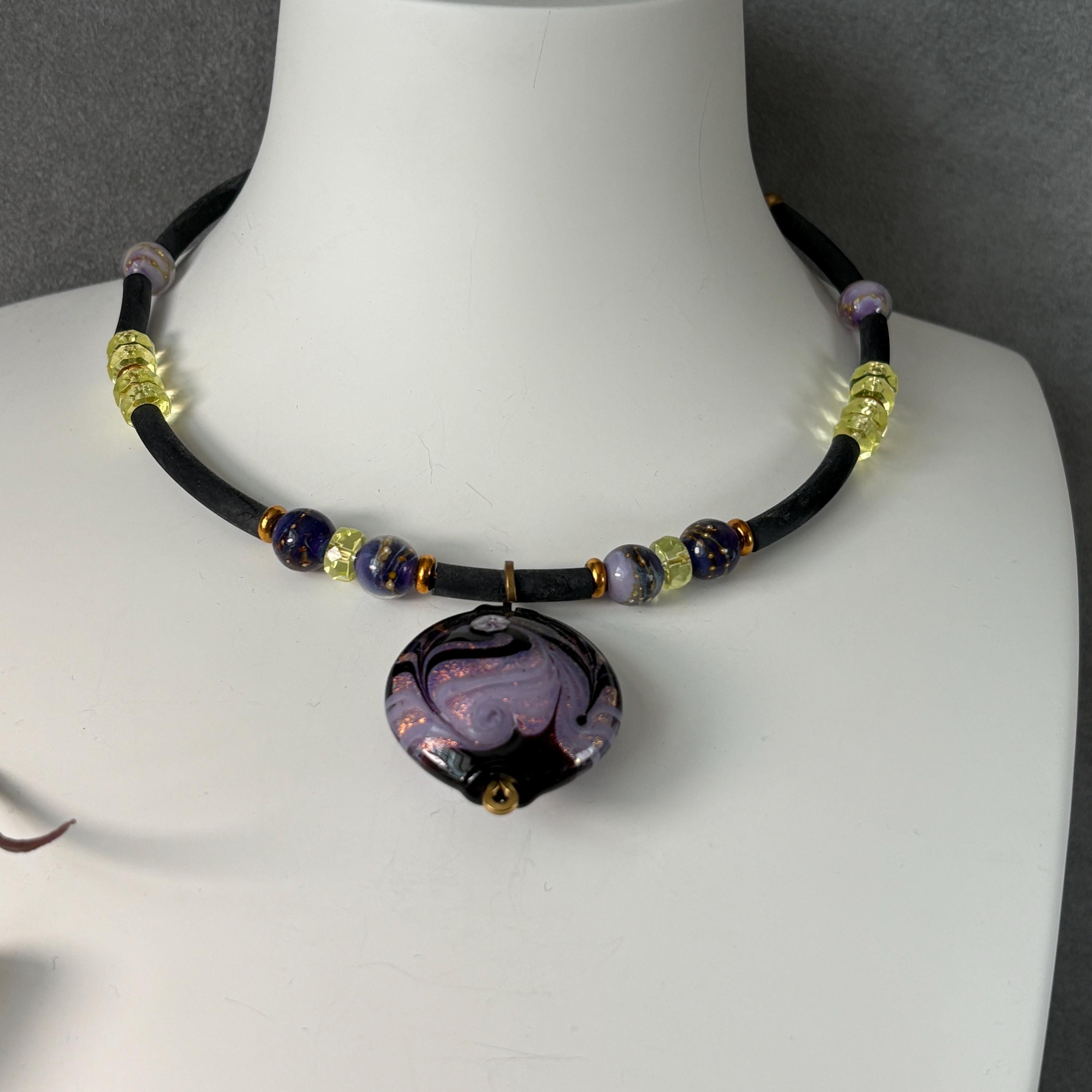This choker is made using purple and black fused and lampworked glass and green transparent beads. The necklace was created in the U.S so no tariffs are added to this necklace.