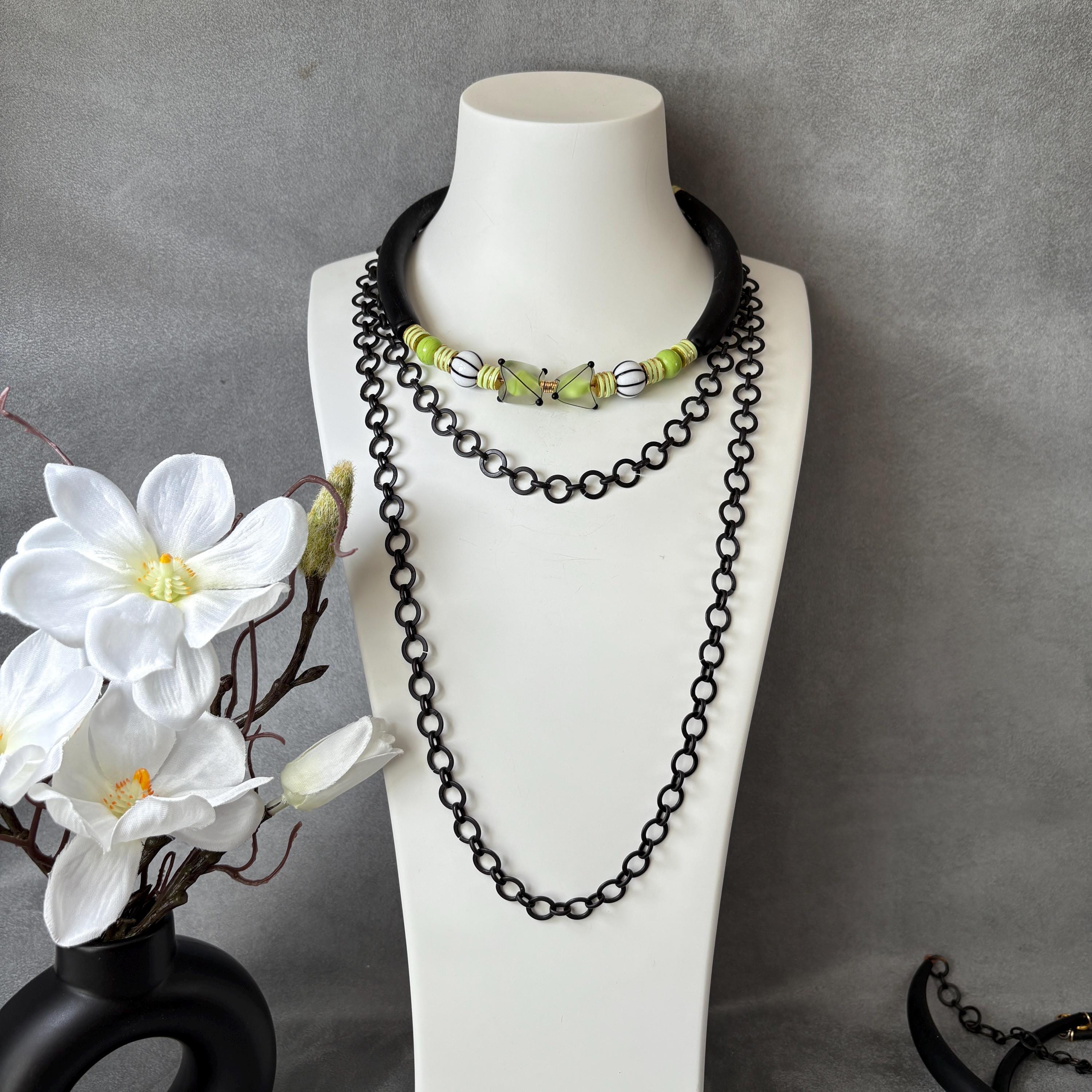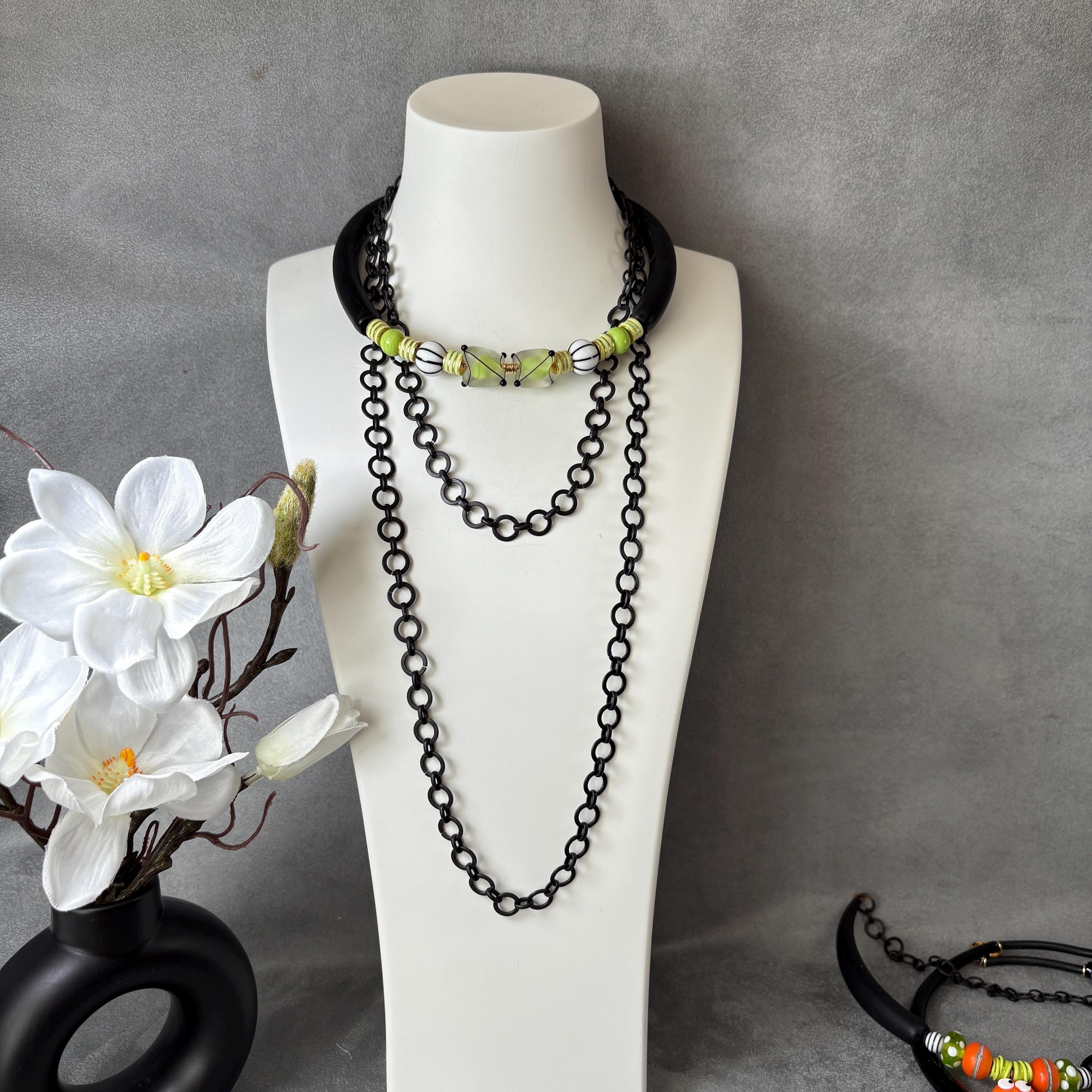 This choker is made using black, white and green fused and lampworked glass. The necklace was created in the U.S so no tariffs are added to this necklace.