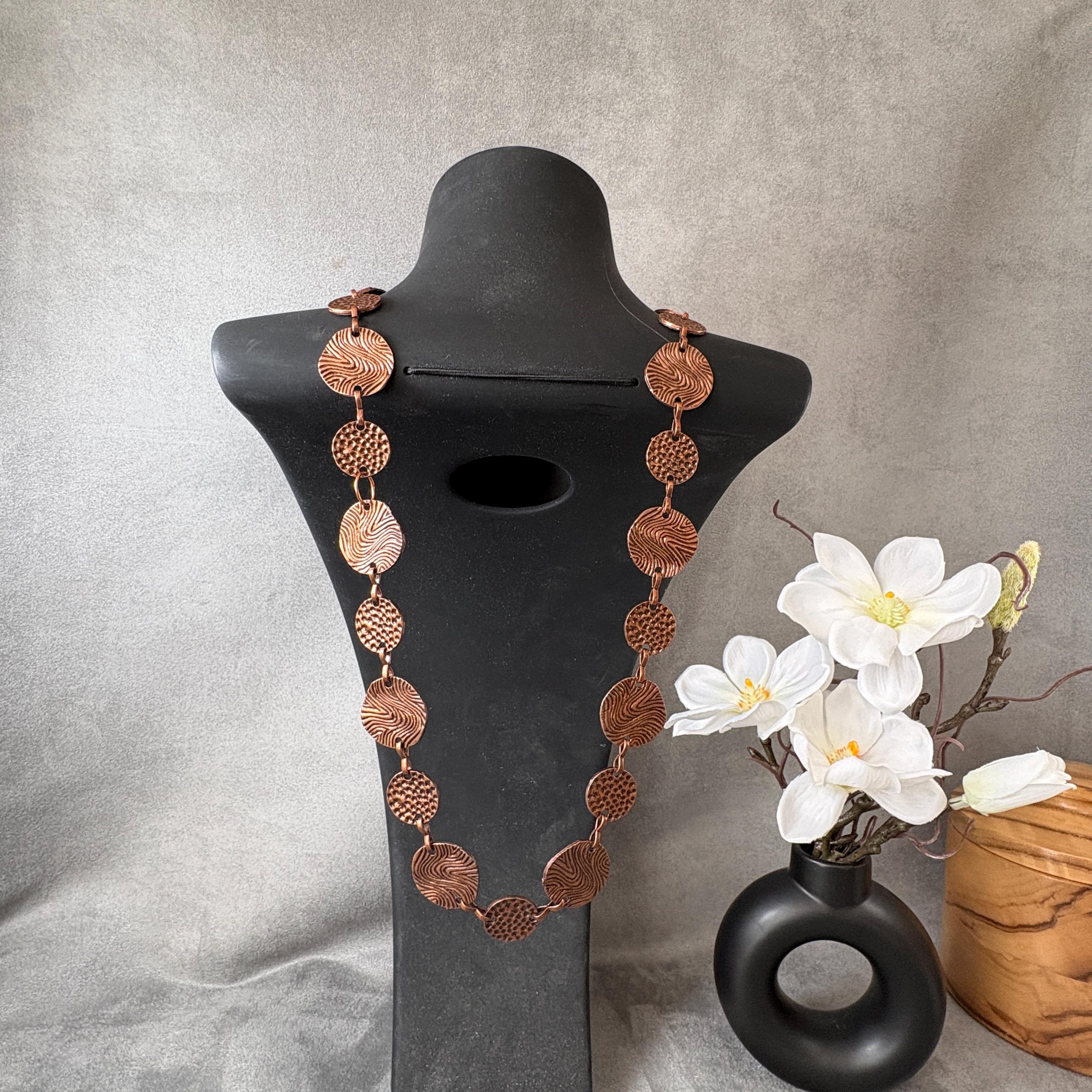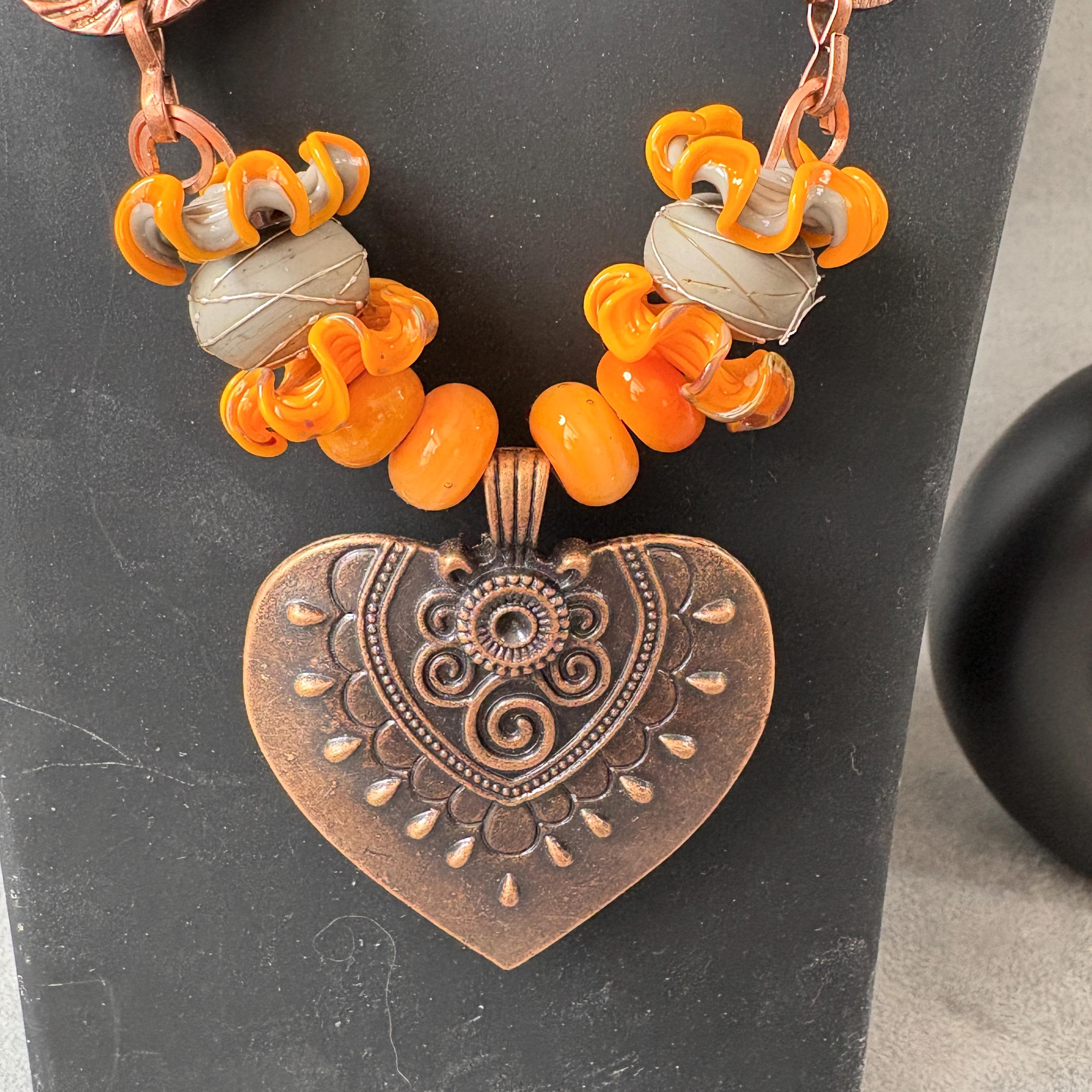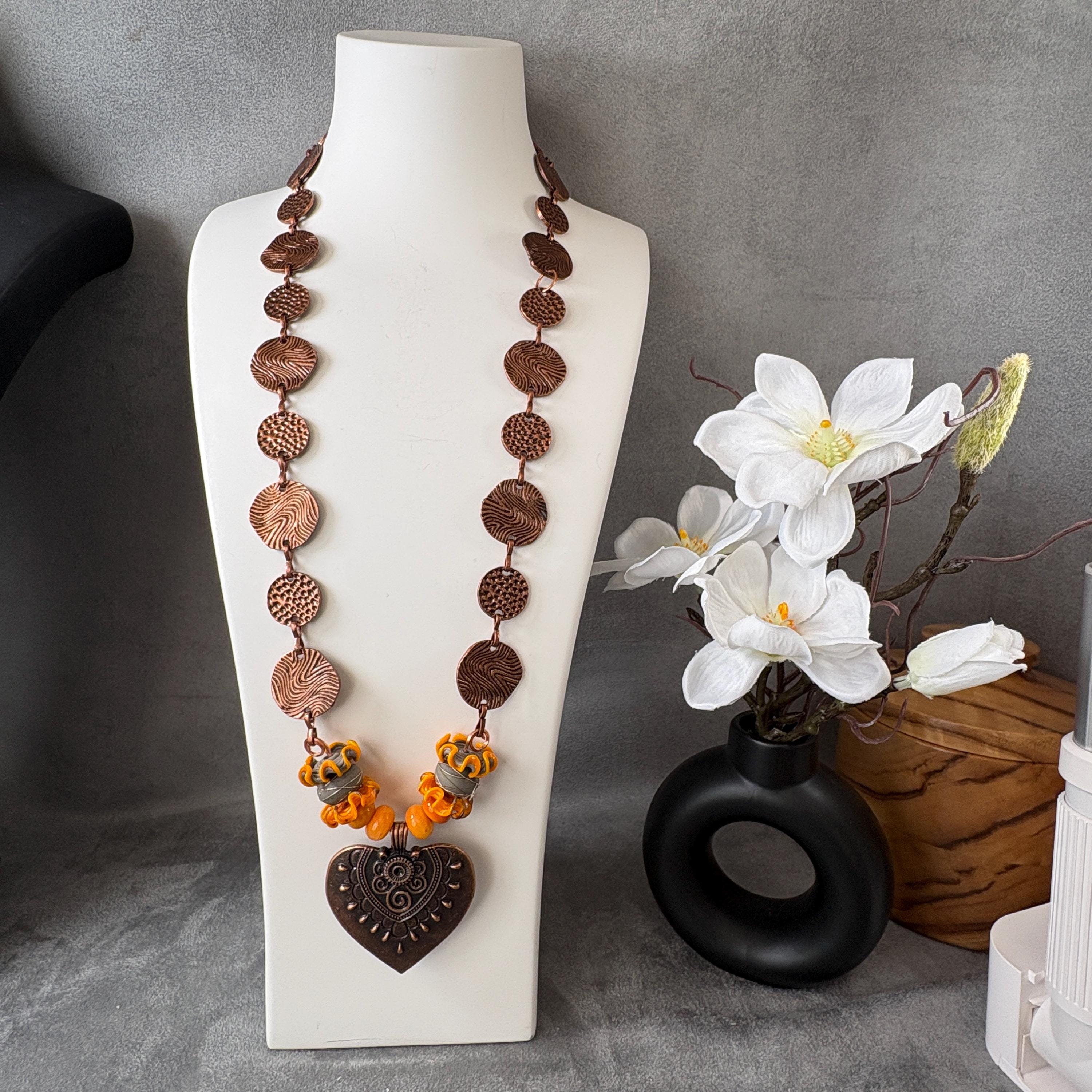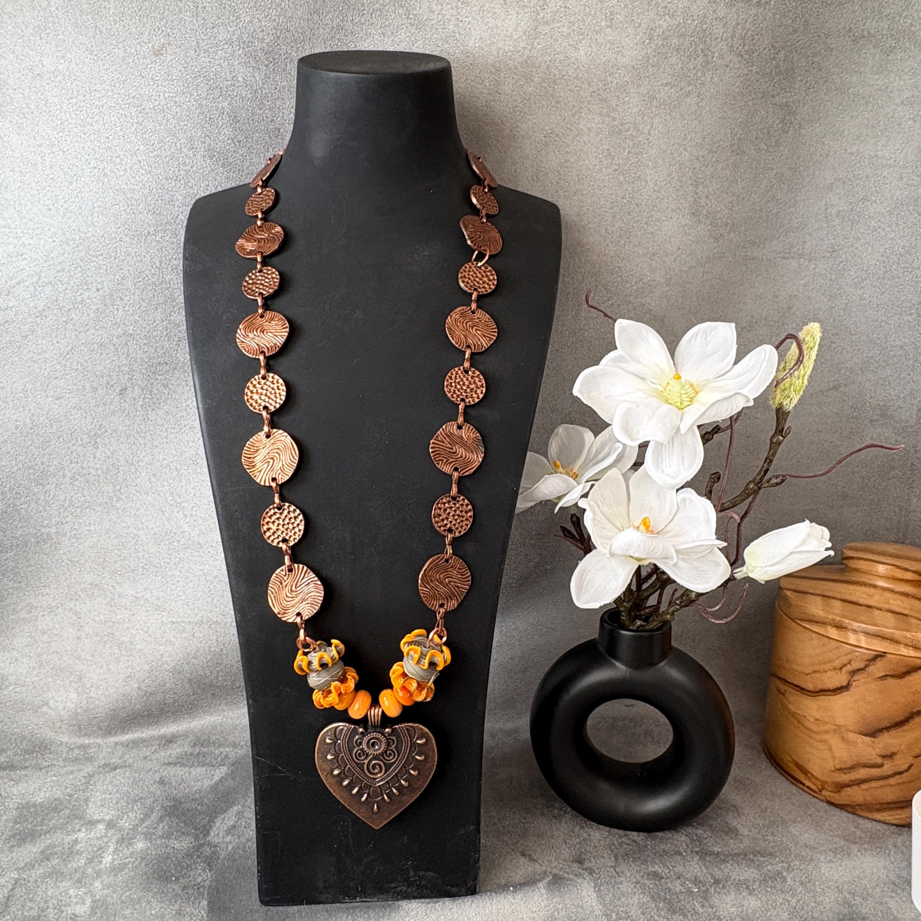 A graceful chain of textured copper discs drapes softly along the neckline, each one marked with flowing, organic patterns that symbolize connection and continuity. At the center rests a richly embossed heart pendant, finished in antiqued copper and surrounded by glowing amber-toned beads—like little sparks of warmth gathered around the heart.