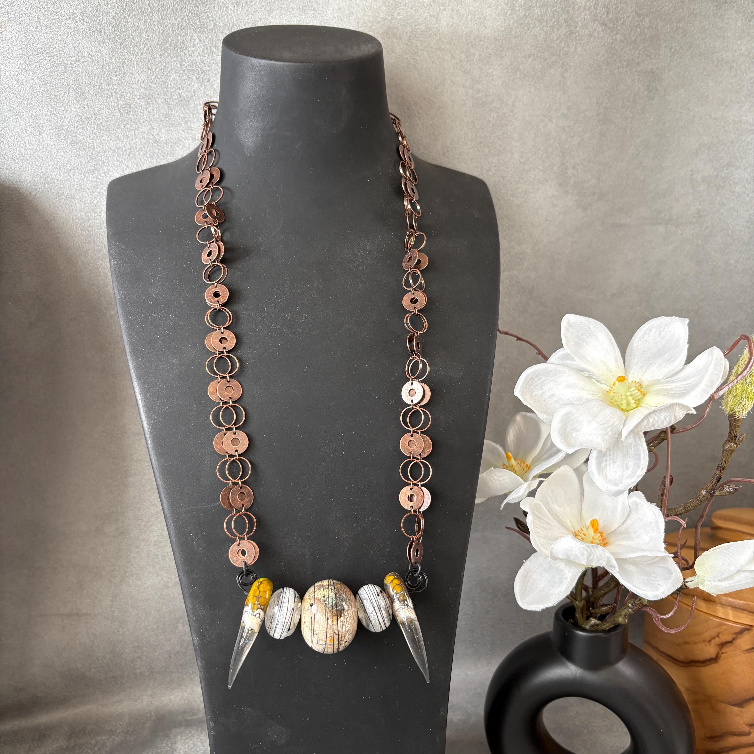 This one-of-a-kind statement necklace blends raw texture with sculptural elegance. A long strand of oxidized copper discs and open rings creates a Goth designed, rhythmic, organic necklace that drapes beautifully below the neckline, offering an earthy, handcrafted feel.