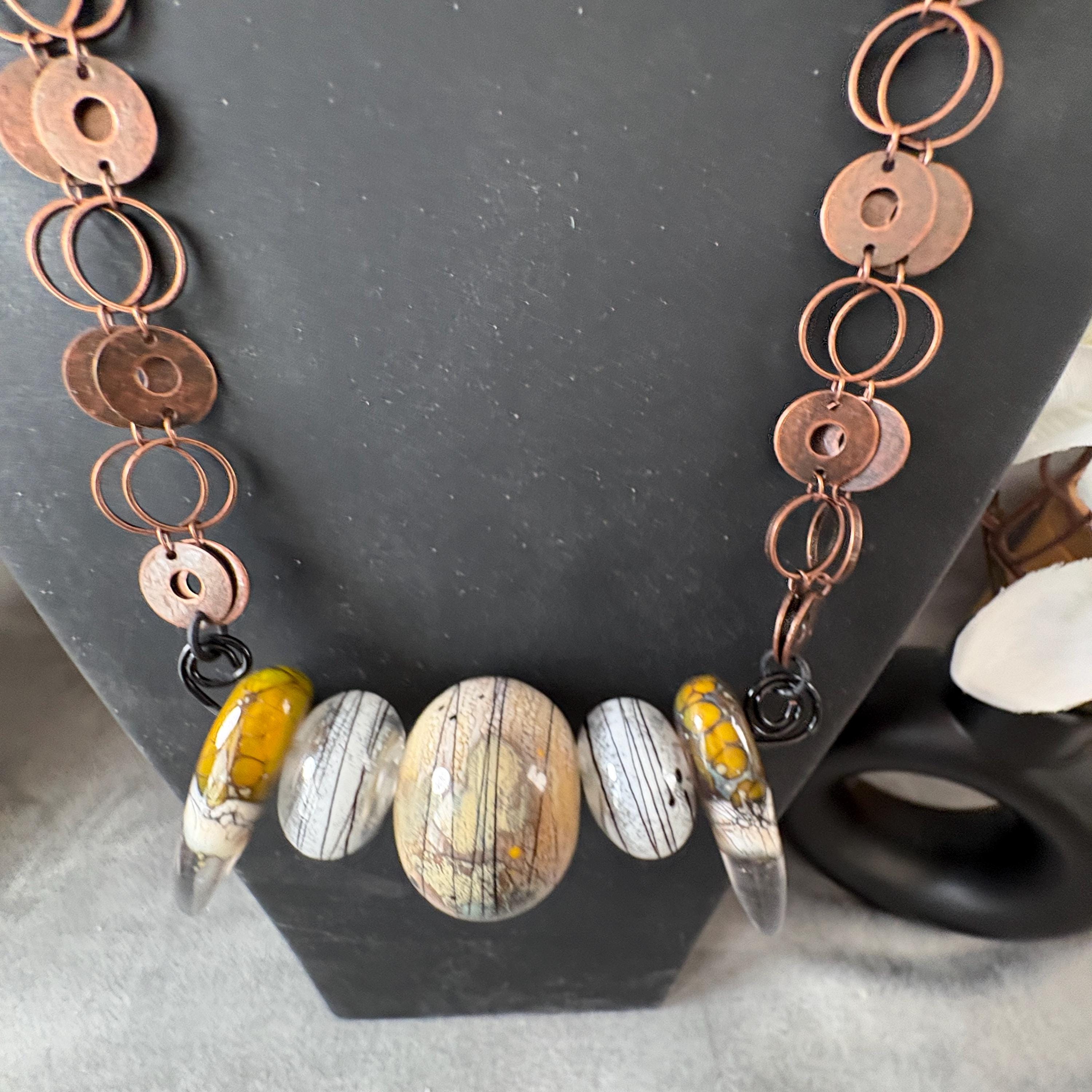 At the center, the design transforms into a striking focal arrangement of artisan glass beads. A large, oval bead with natural stone-like veining anchors the piece, flanked by patterned cylindrical beads and elongated, translucent glass spikes, resembling large teeth. Subtle tones of ivory, smoky gray, and golden amber flow through the glass, creating depth, contrast, and quiet drama.
