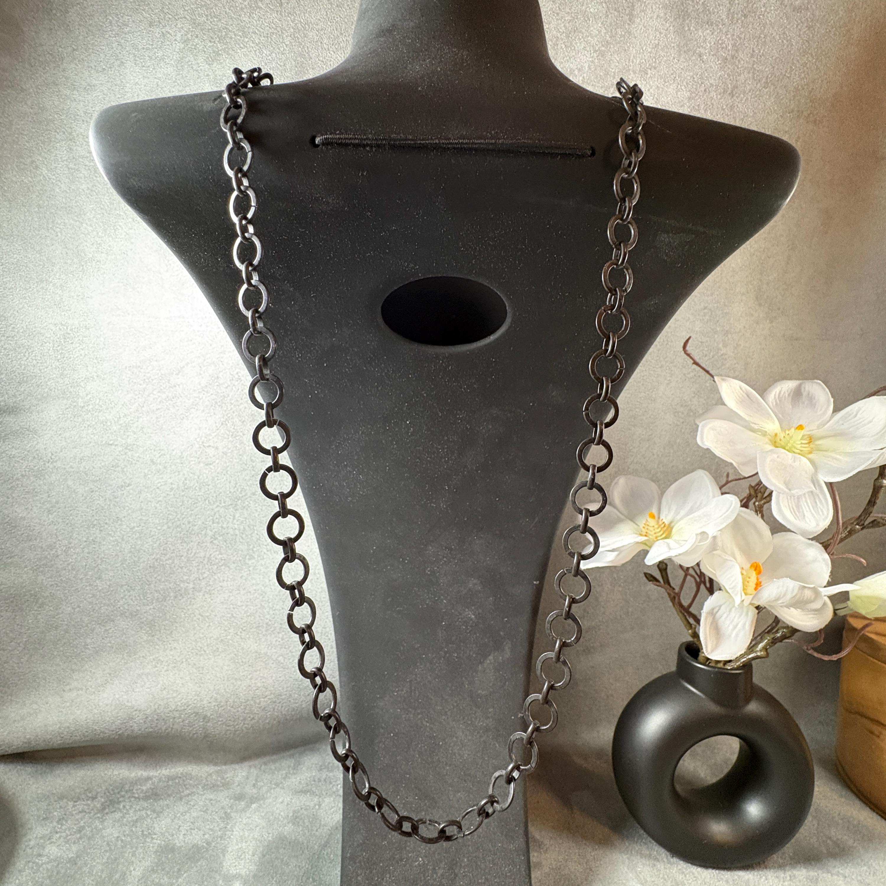 This modern statement necklace is a study in contrast and clean design. A long strand of matte black chain creates a bold, architectural line, giving the piece a strong yet understated presence.