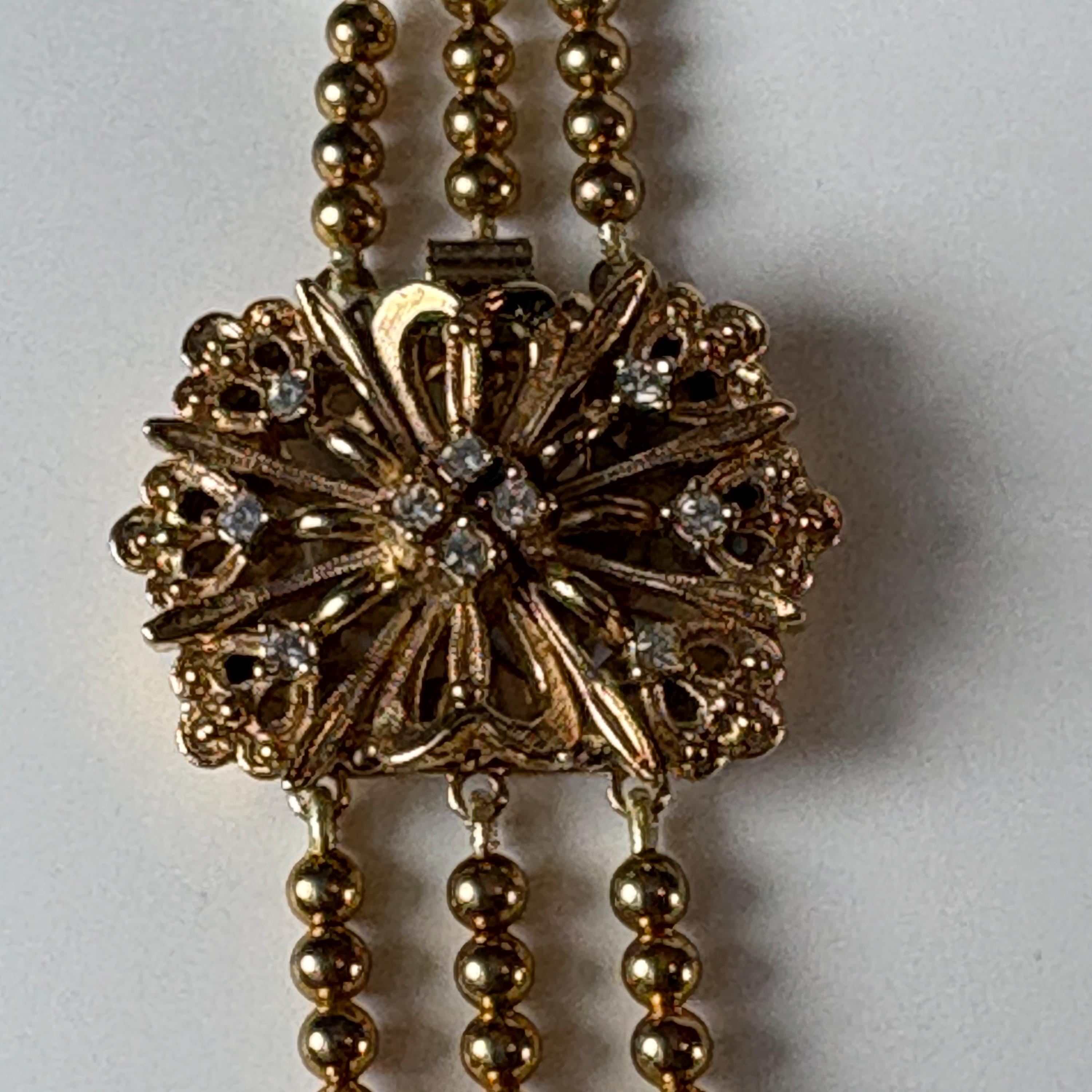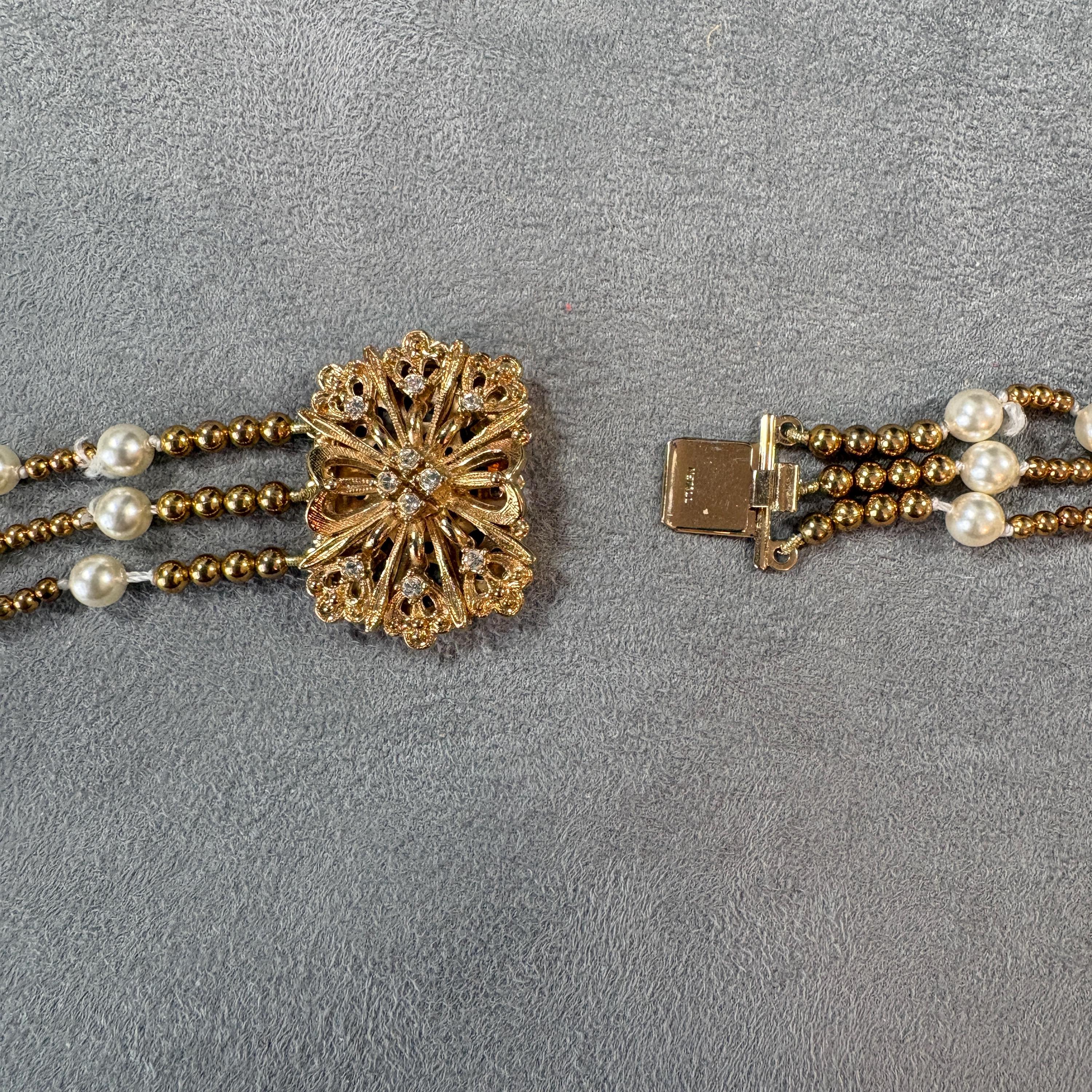 A beautifully detailed gold-plated clasp sits to one side, designed with Swarovski crystals as an intricate floral or starburst motif that adds a vintage-inspired focal point. The asymmetrical placement allows the clasp to be worn as a subtle accent or gently turned forward for a more decorative look.
