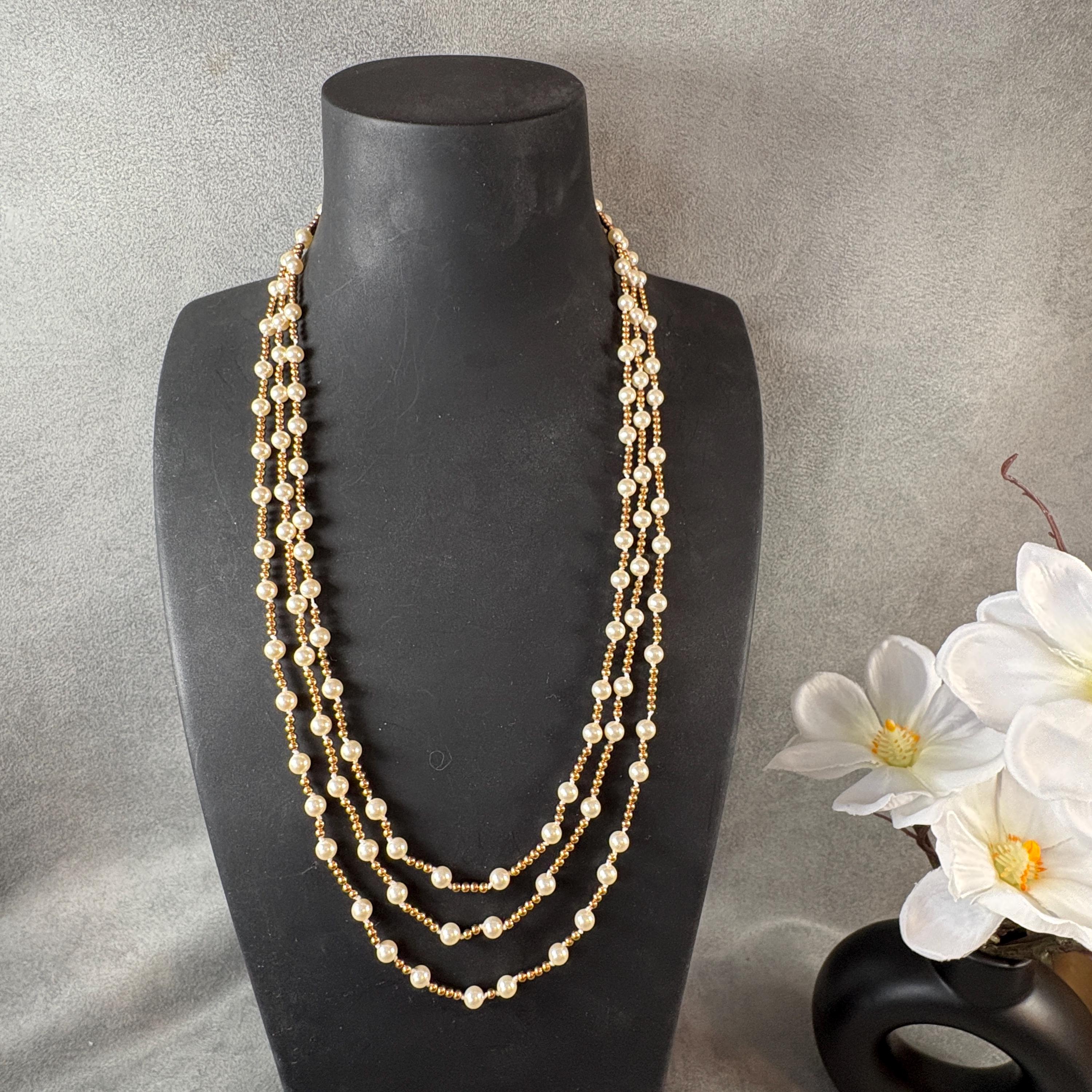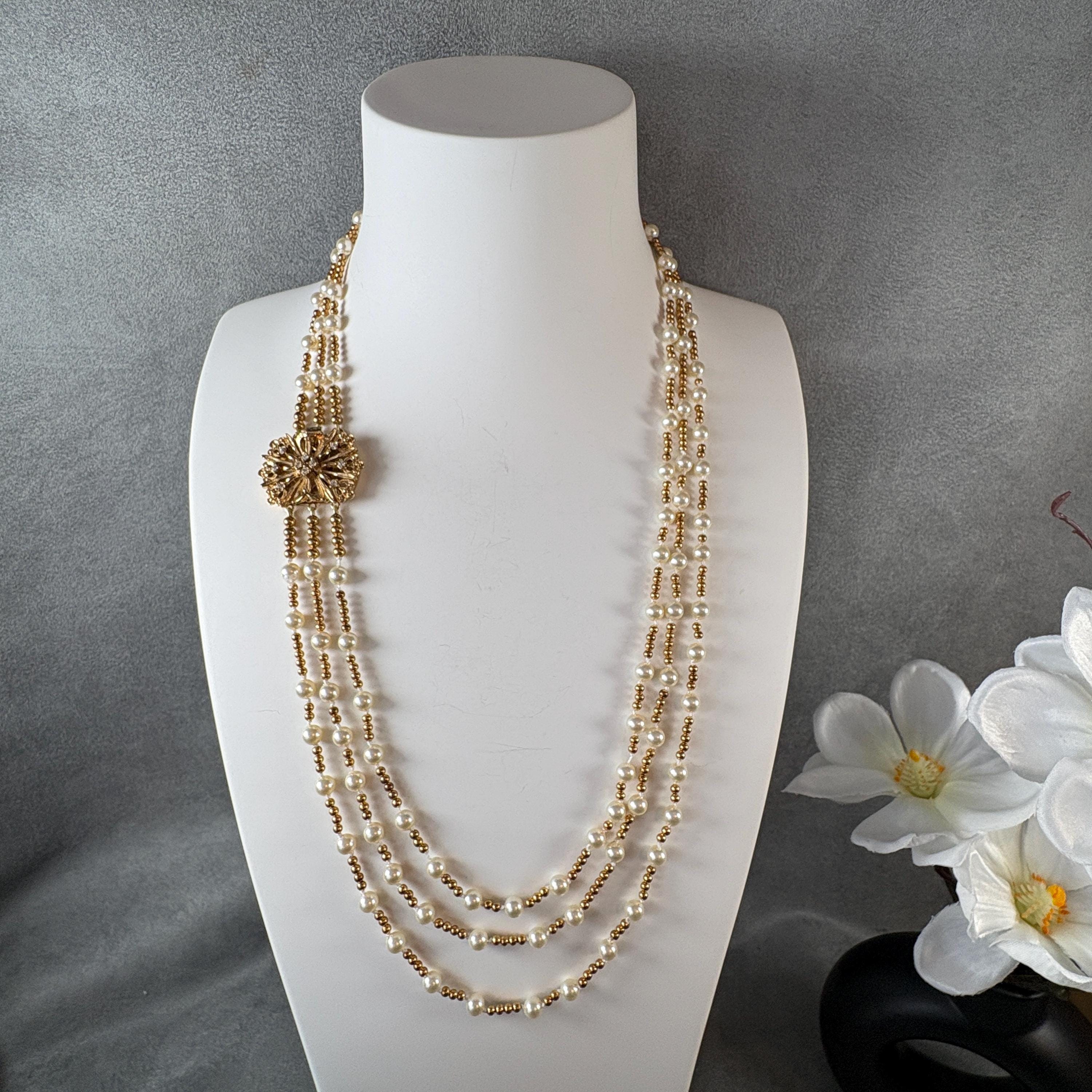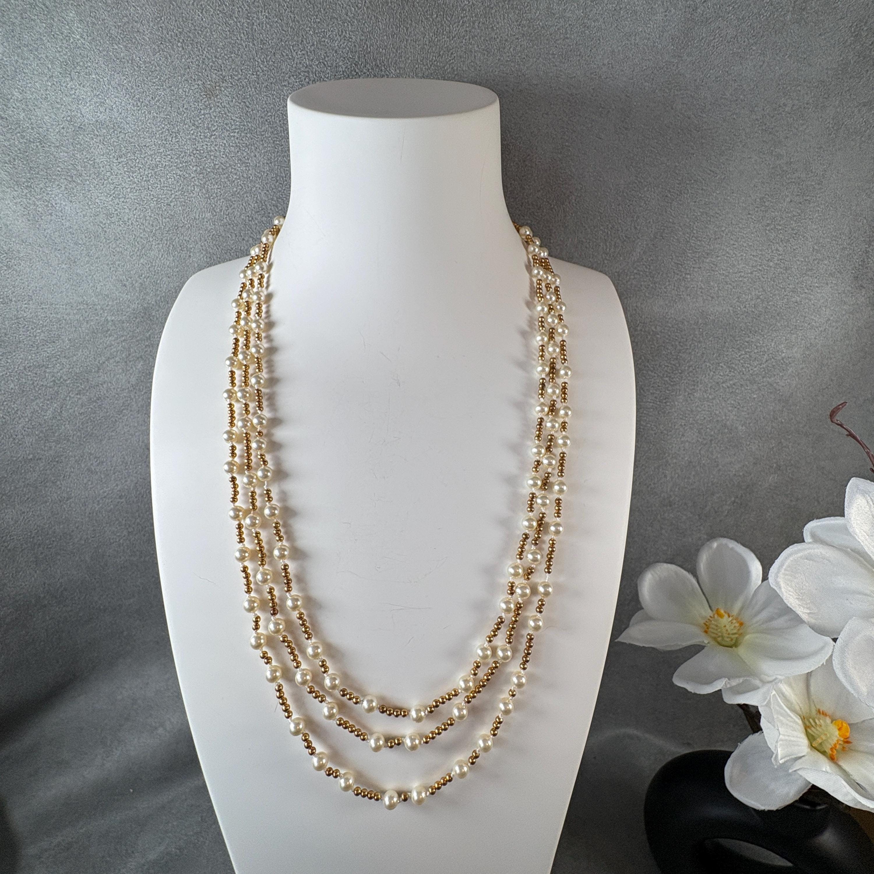 This graceful necklace features multiple strands of luminous Swarovski ivory pearls knotted and interwoven with warm gold-tone bead accents, creating a layered look that feels both timeless and refined. The strands drape softly along the neckline, adding depth, movement, and a touch of understated glamour.